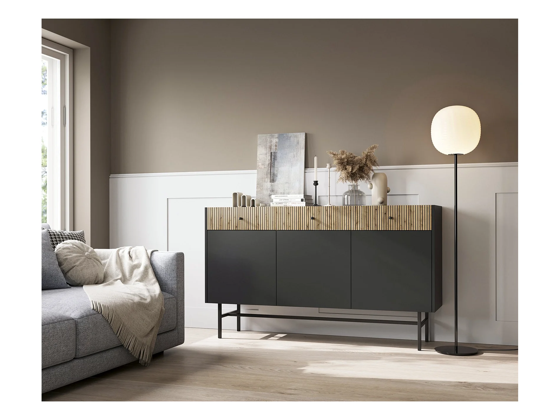 Sideboard 3-türig - Schwarz / Holzoptik Eiche - 155 cm - DIVENOS