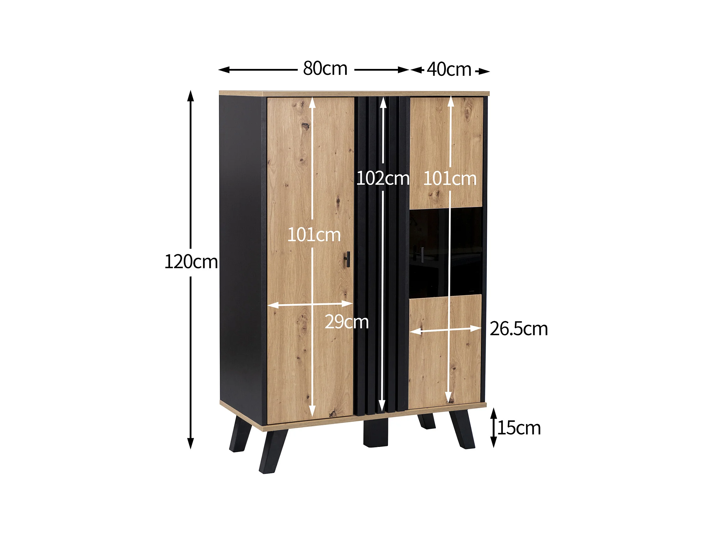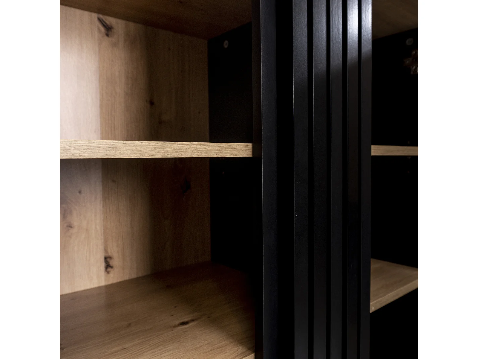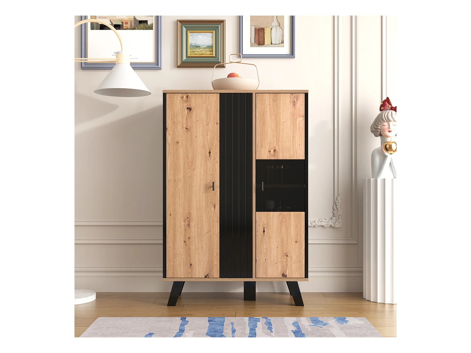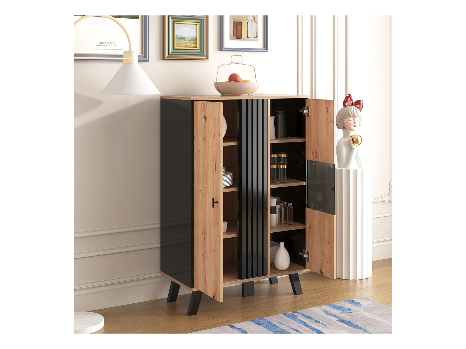 Sideboard 80x120x40 (cm), mit Glas und LED-Beleuchtung, einzigartiges schwarzes Holzstreifendesign, Farbkombination Schwarz und Holz