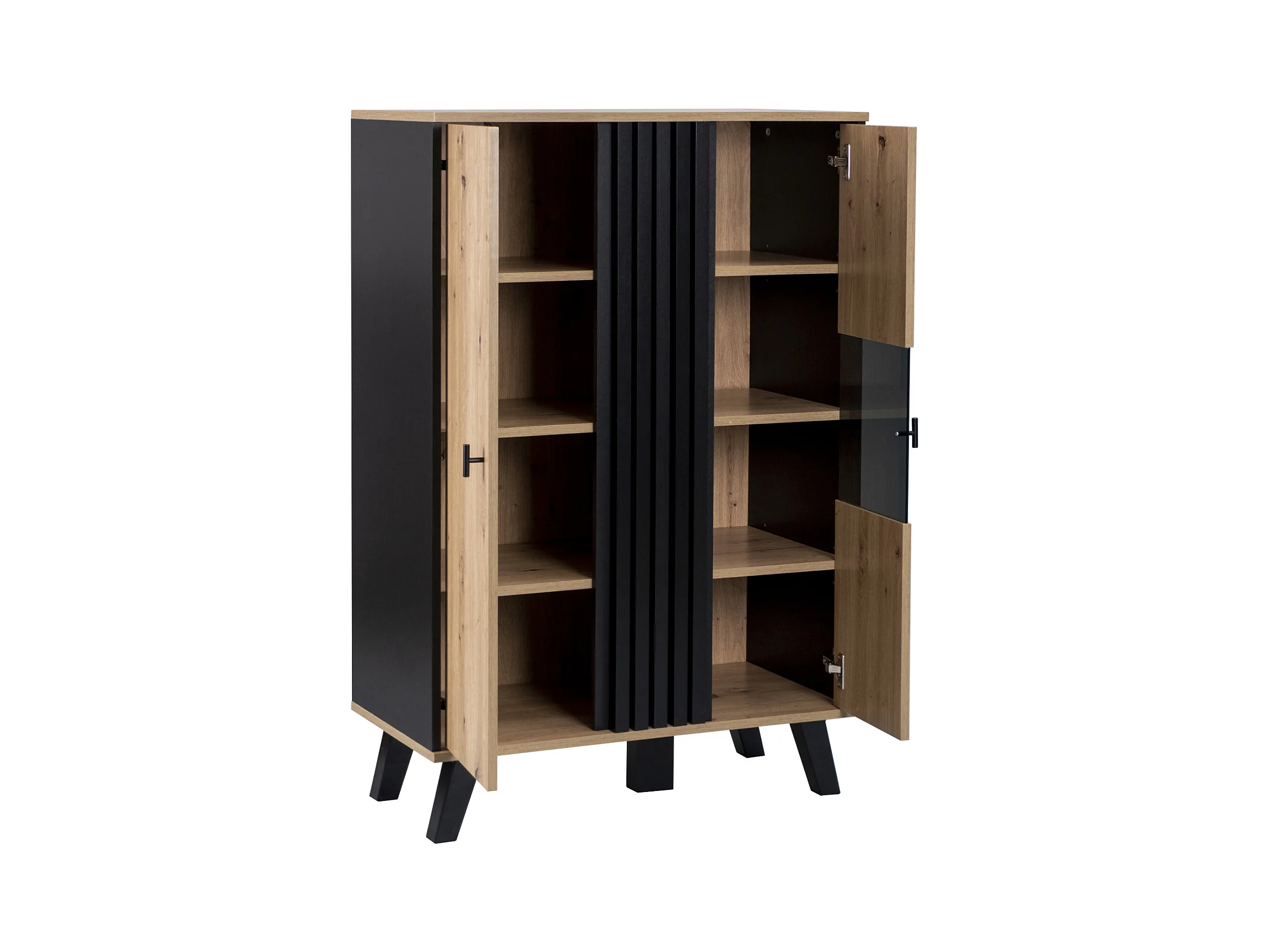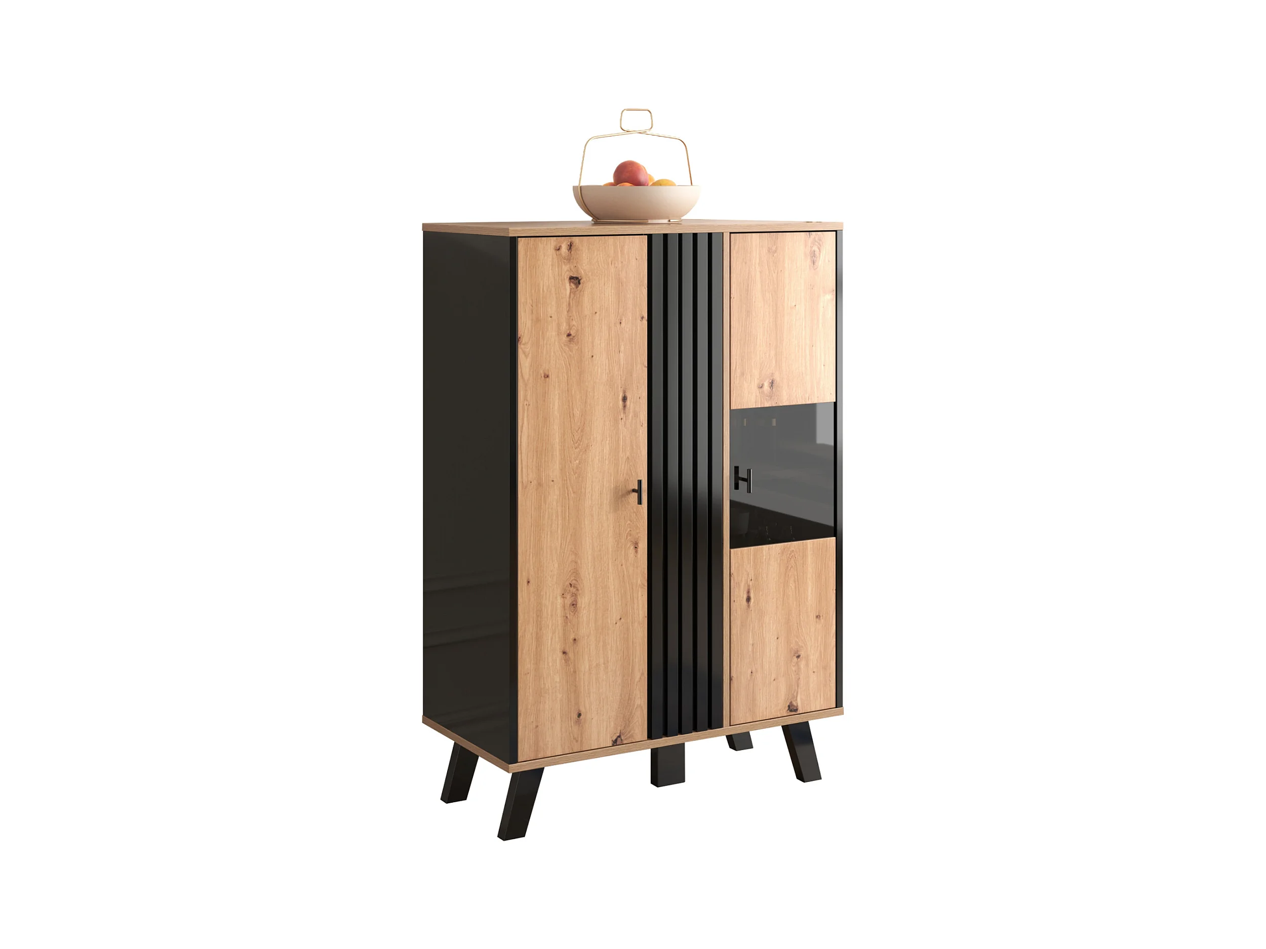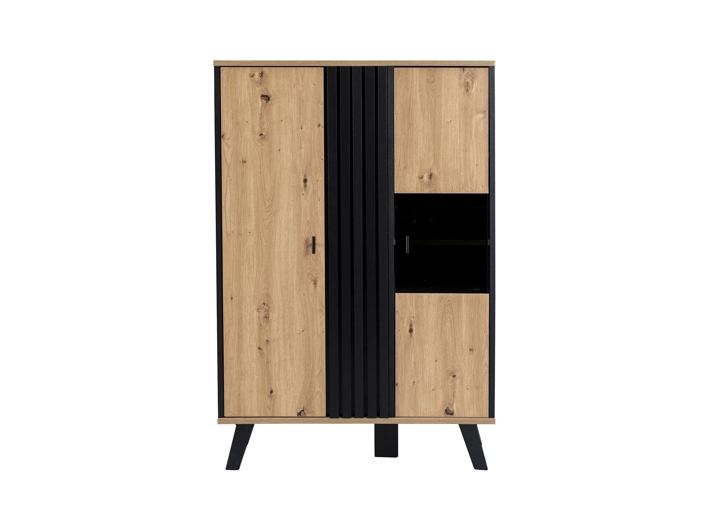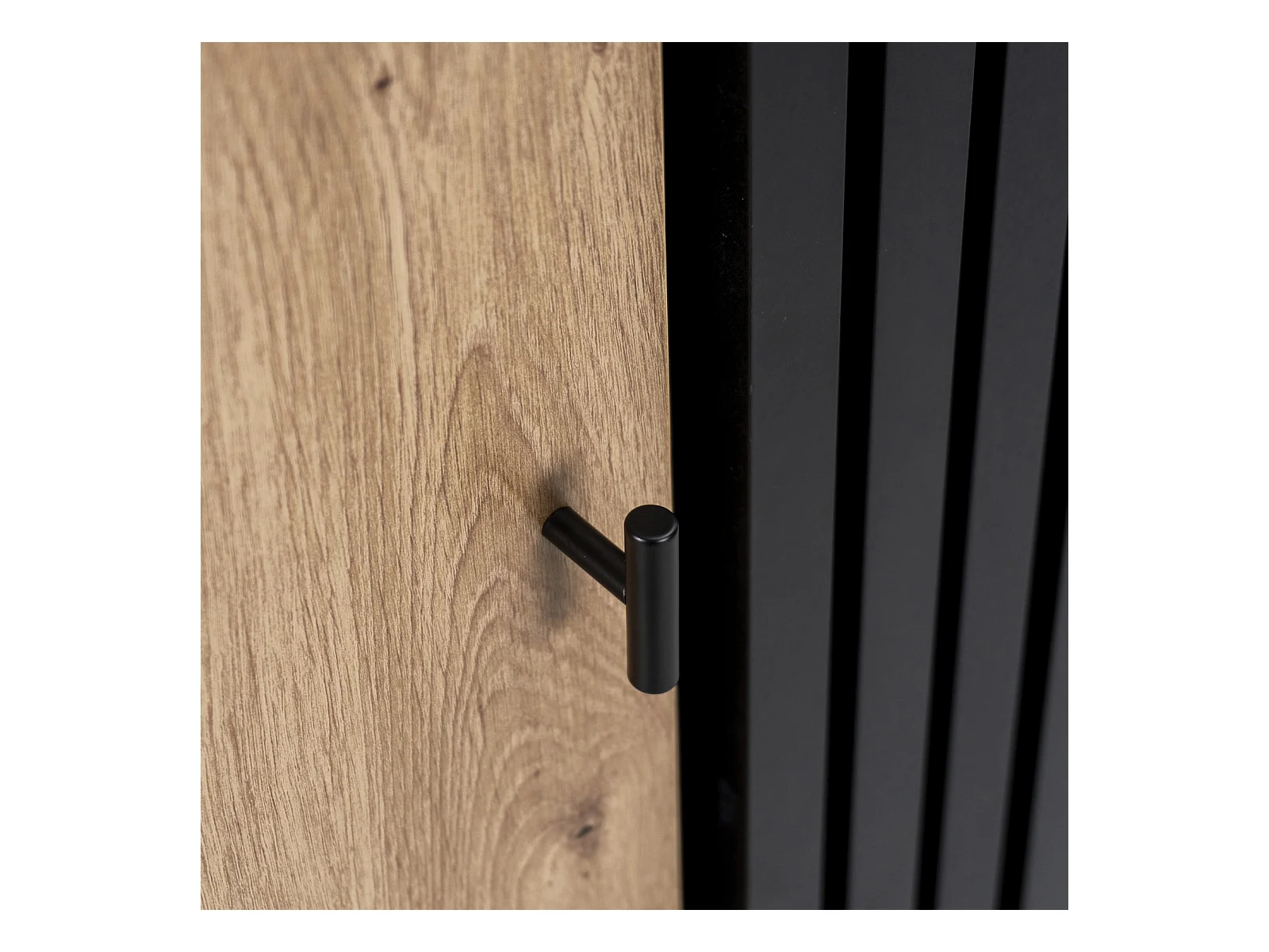 Sideboard 80x120x40 (cm), mit Glas und LED-Beleuchtung, einzigartiges schwarzes Holzstreifendesign, Farbkombination Schwarz und Holz