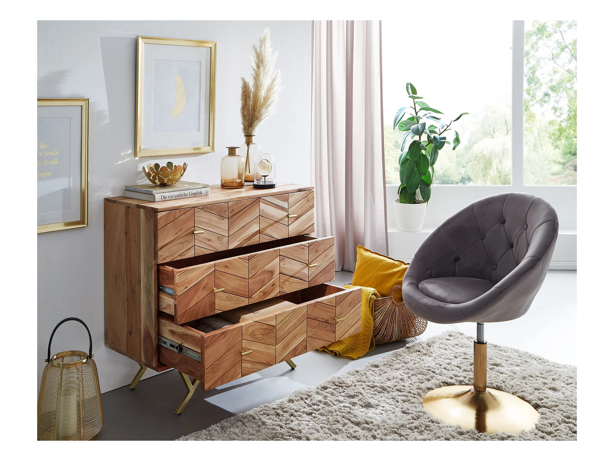 Sideboard 90x86,5x40cm Massivholz / Metall Anrichte Schubladen Kommode