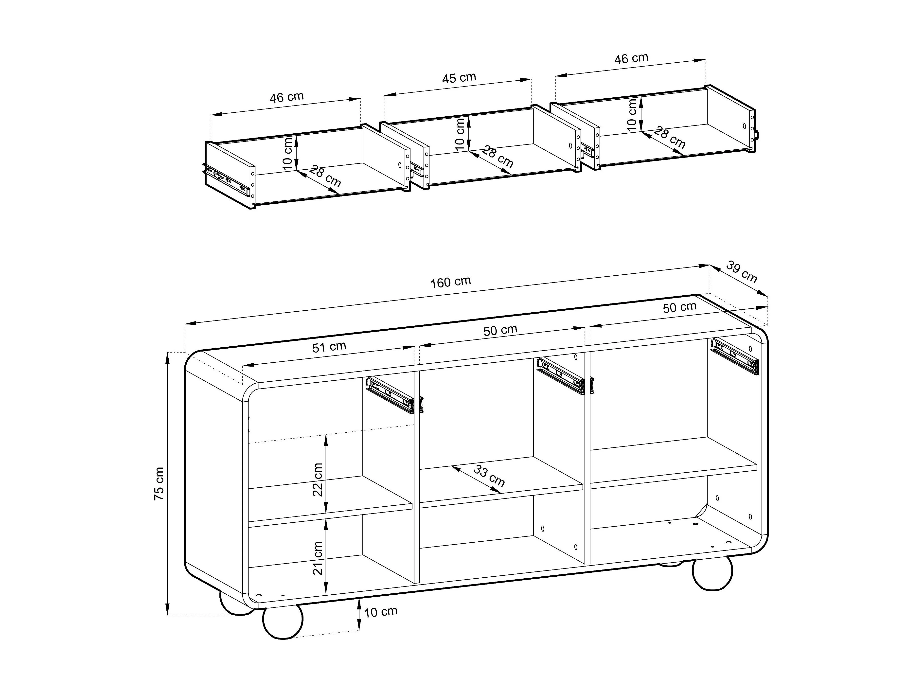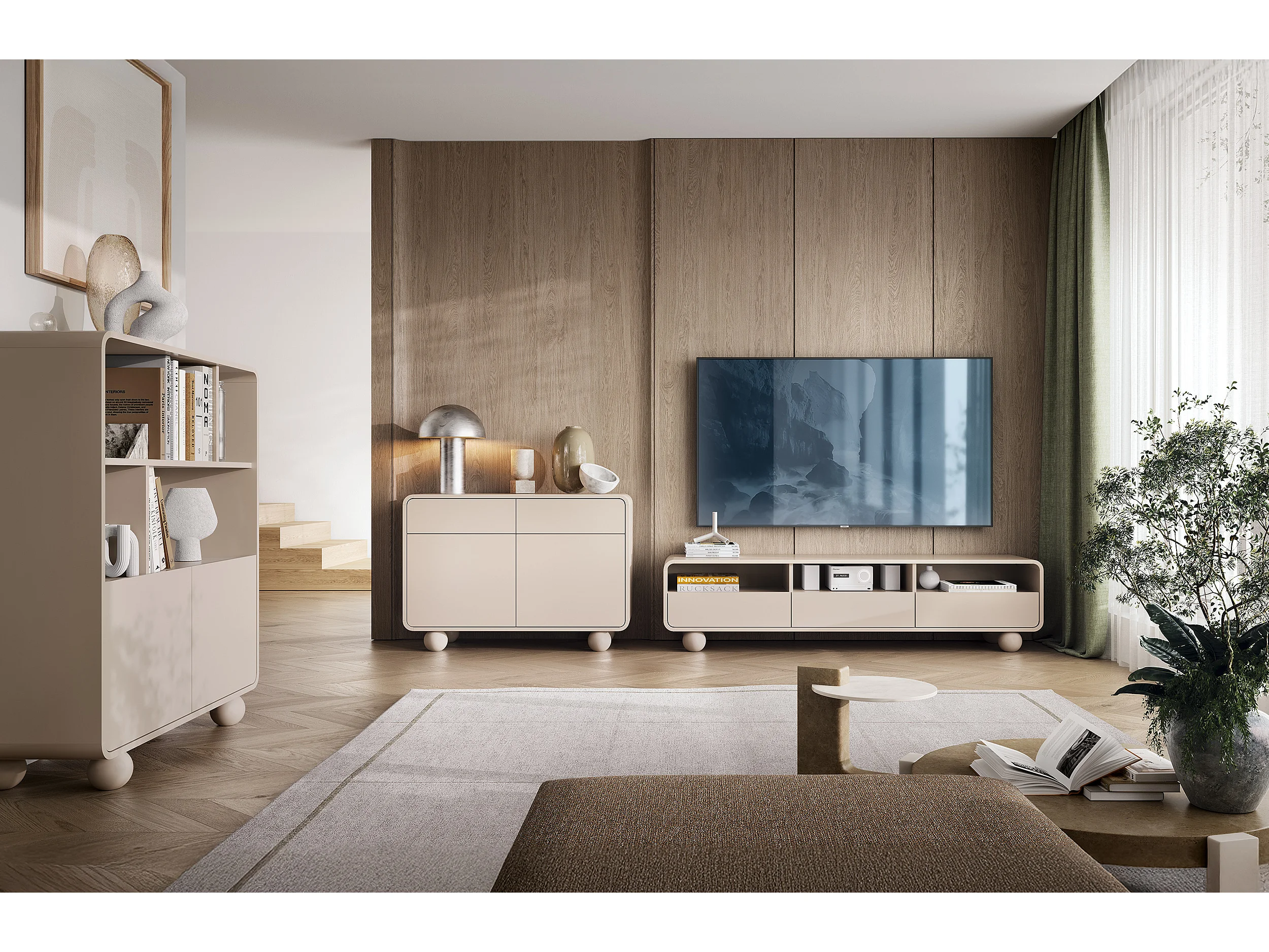 Sideboard aus Kaschmir mit drei Schränken und drei Schubladen – Modernes Design, kugelförmige Beine, 160 x 75 x 39 cm