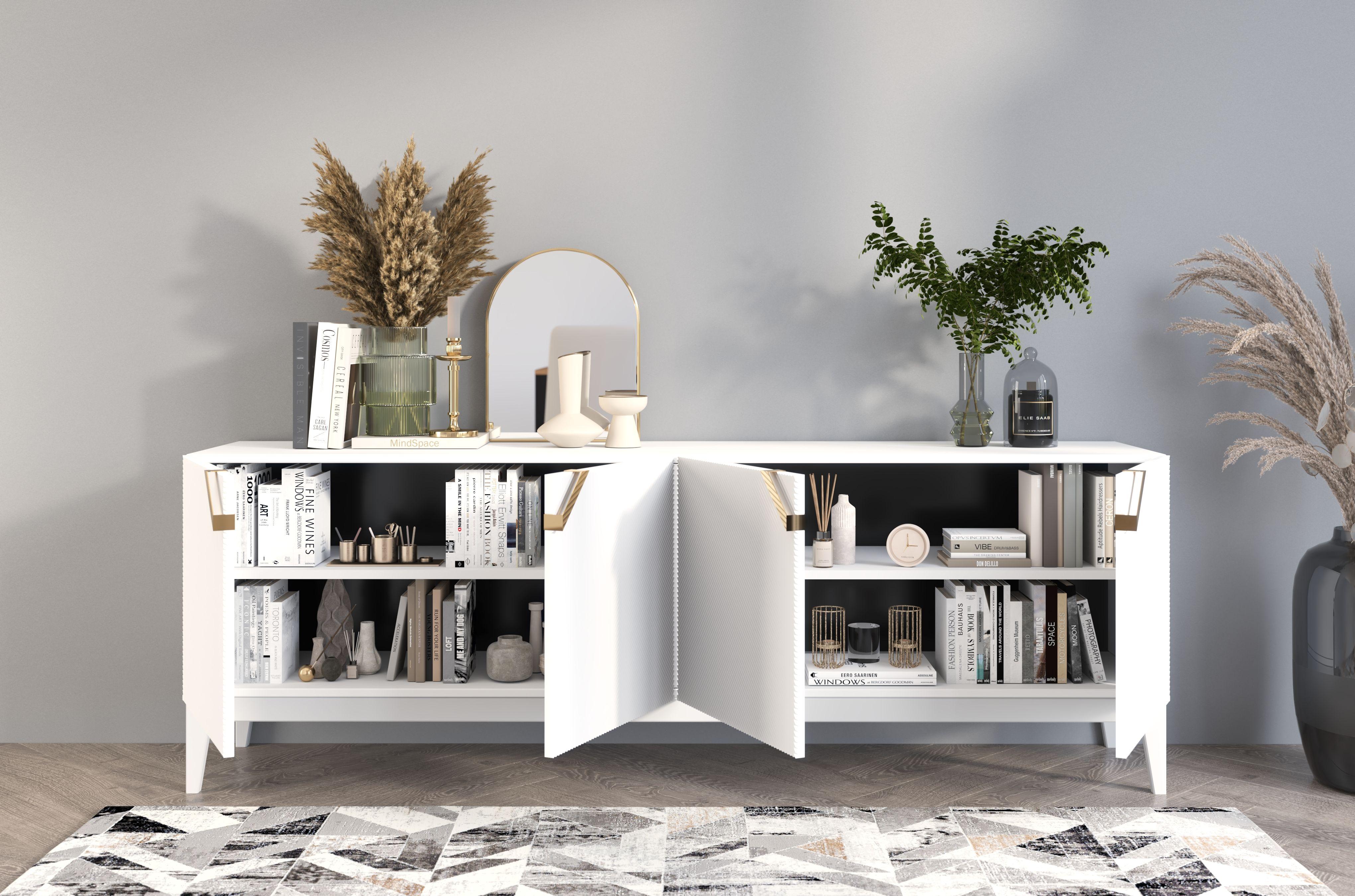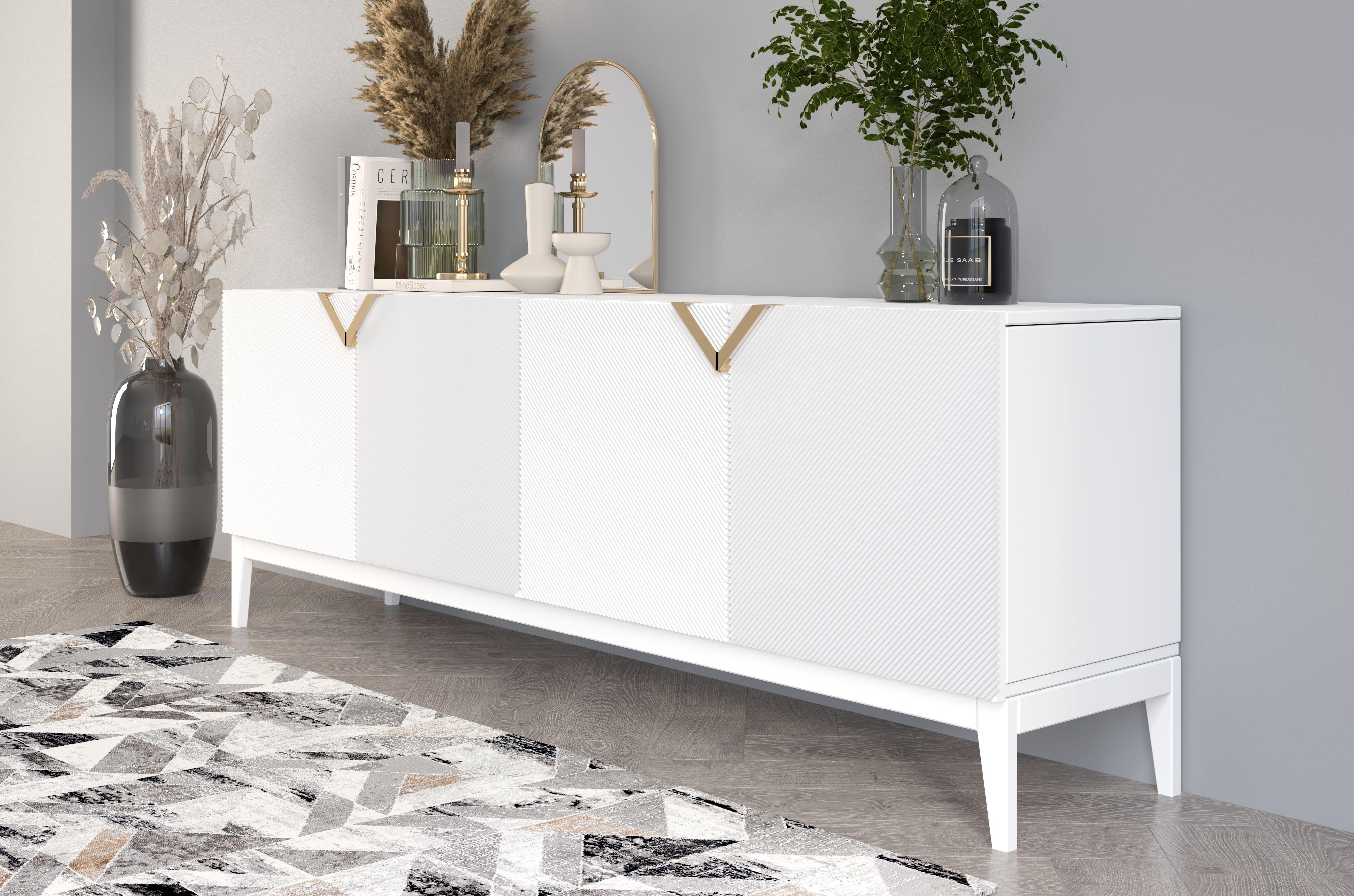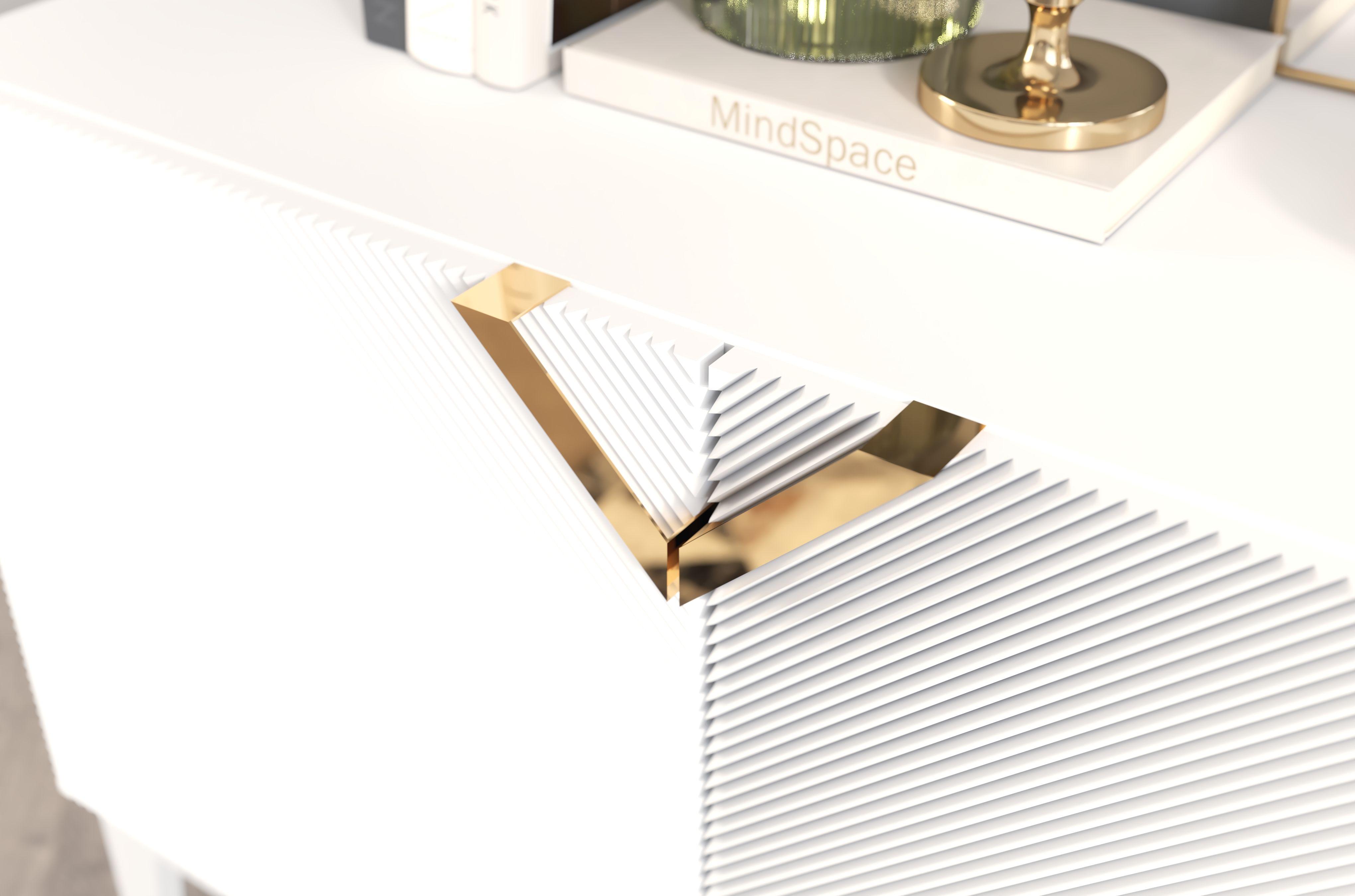 Sideboard Demi long, weiß-gold, mit gefrästen fronten, massive buche