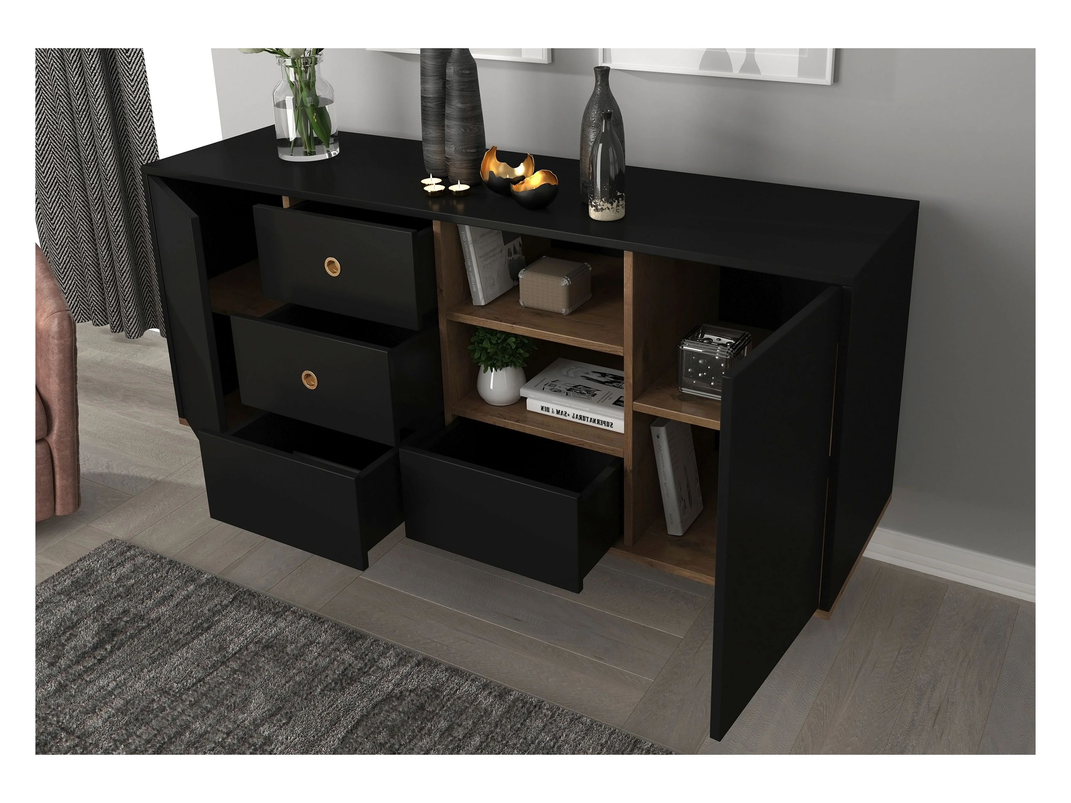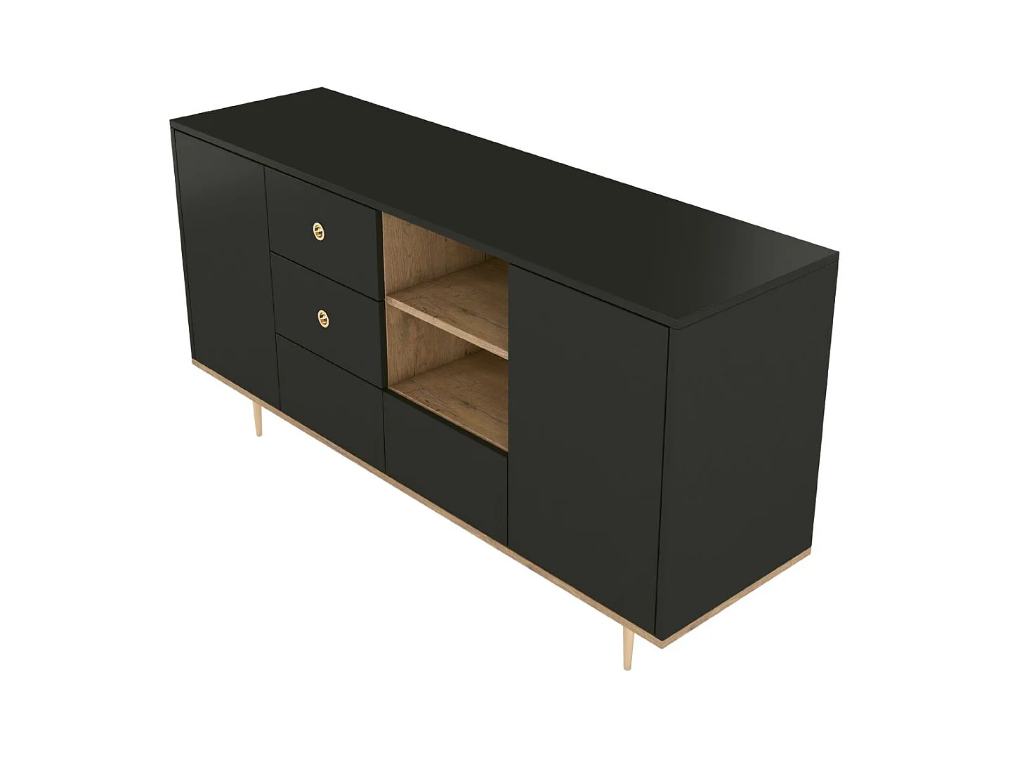 Sideboard Harmoni, schwarz, eiche, goldene details