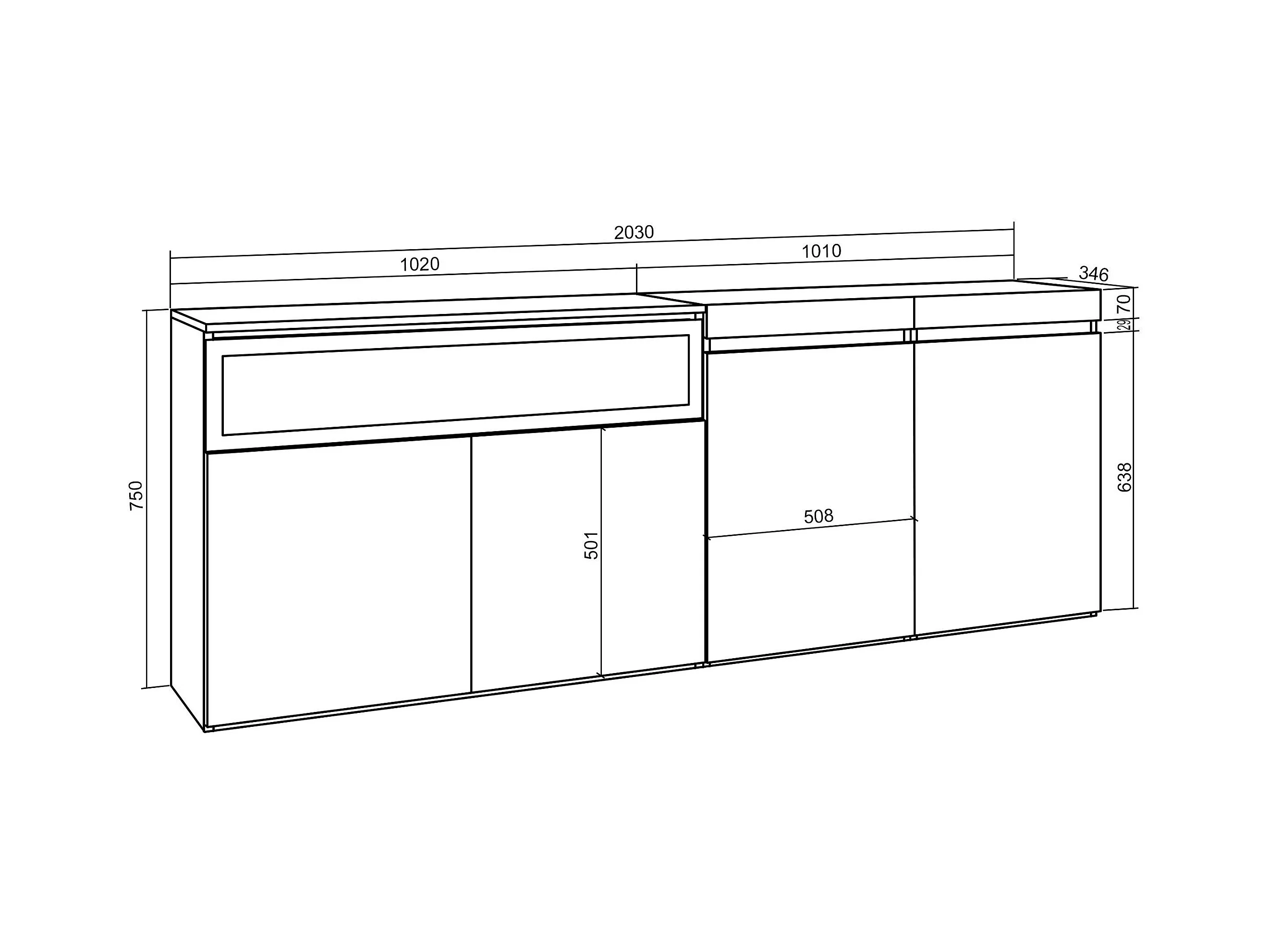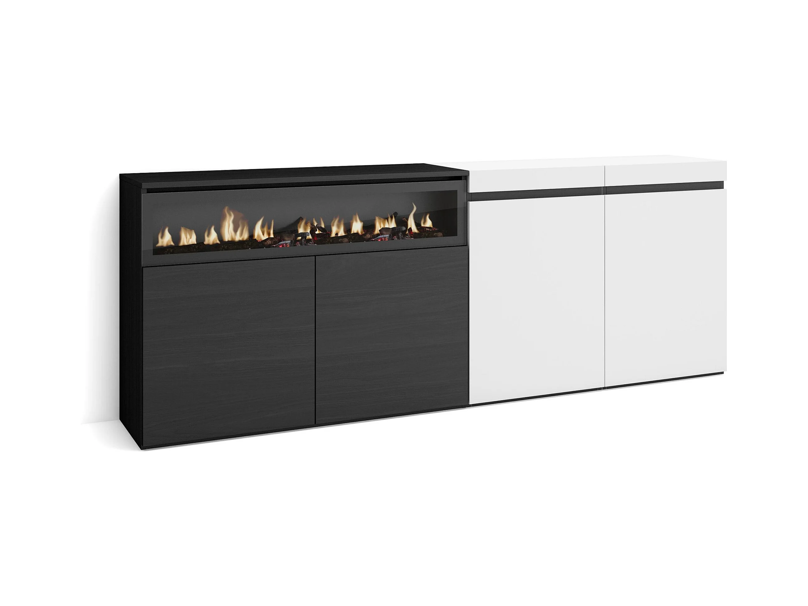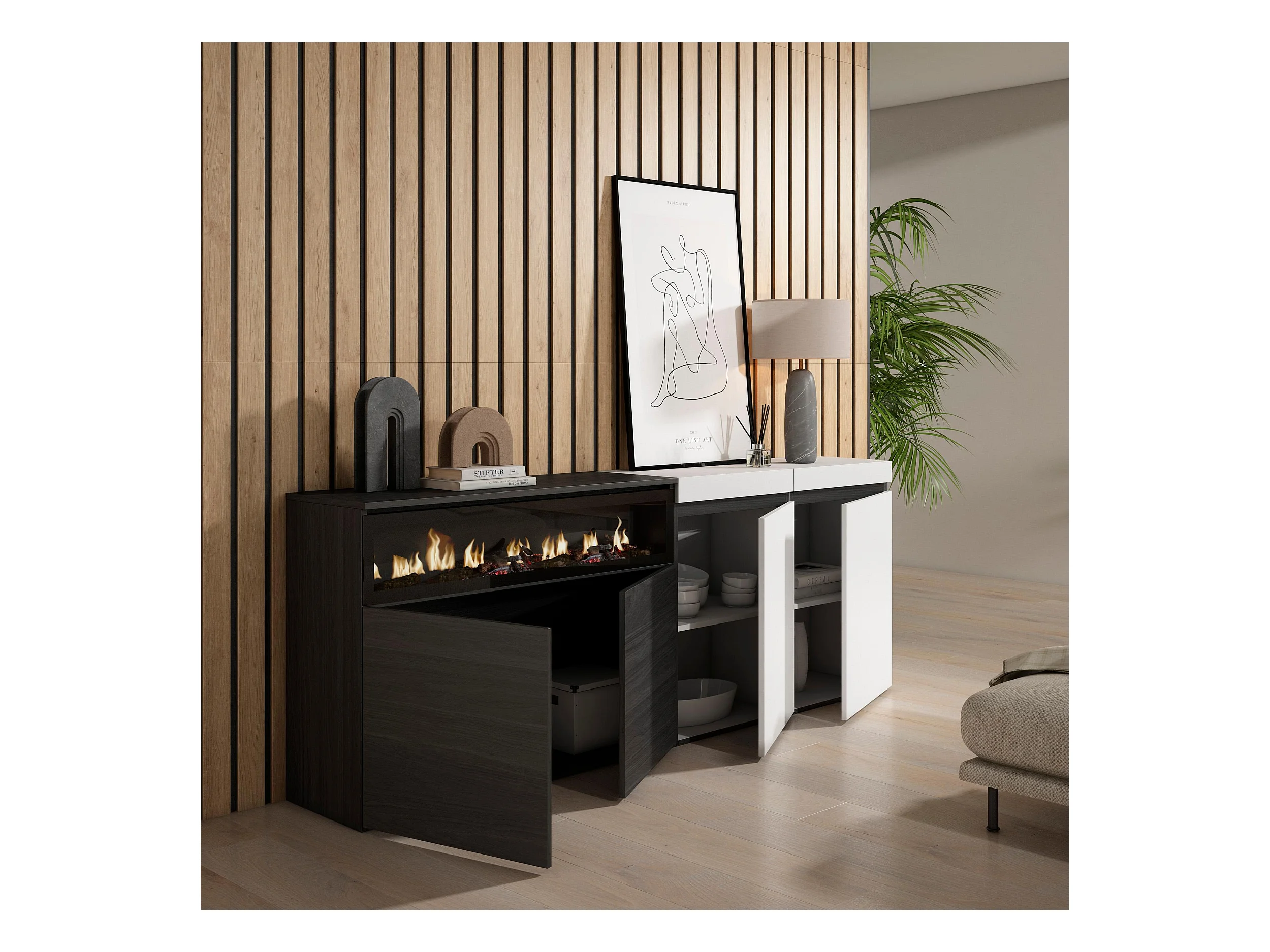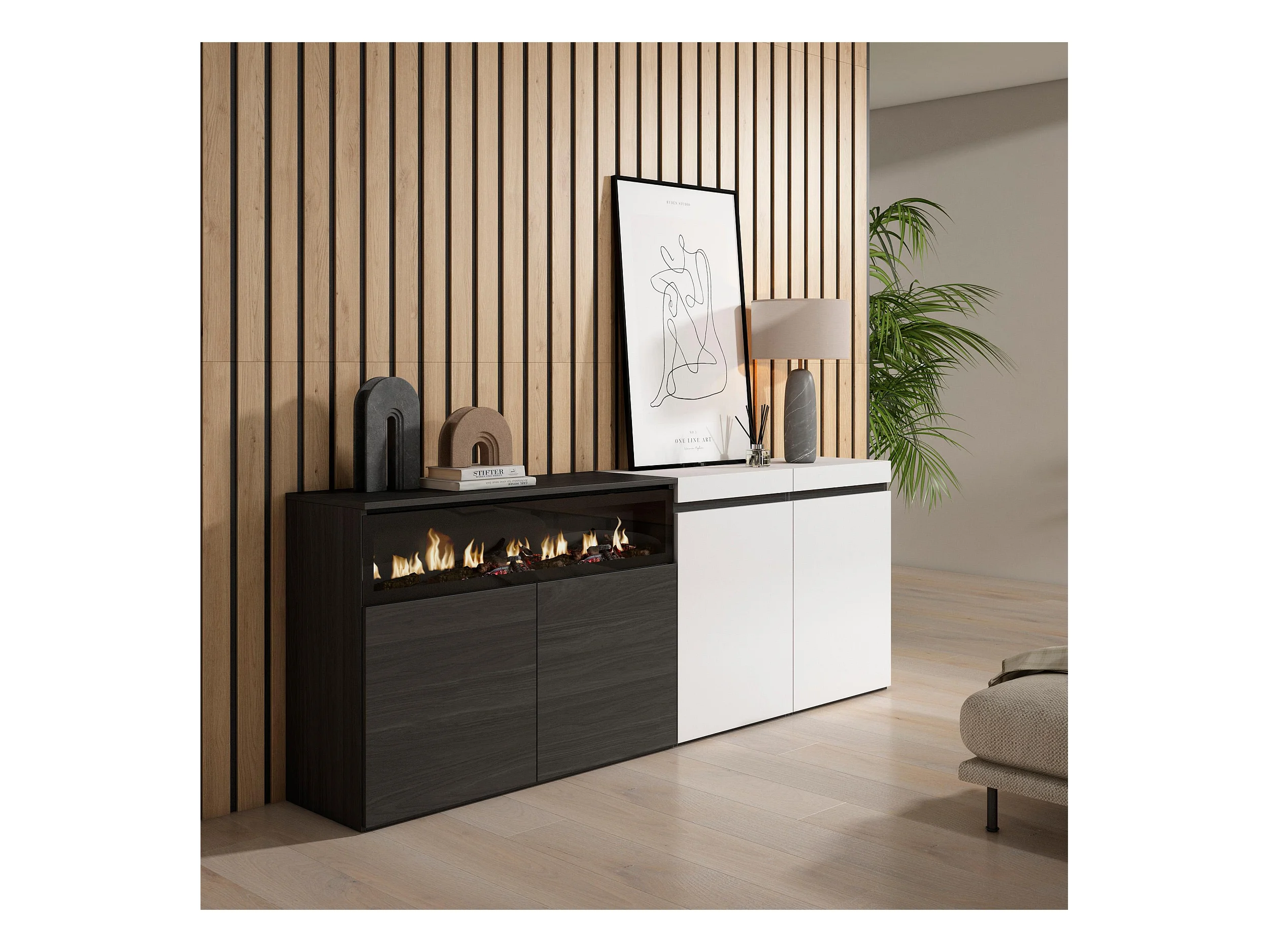 Sideboard, Highboard, 200x35x75cm, 4 Türen, Elektrokamin. Maße, Weiß und Schwarz