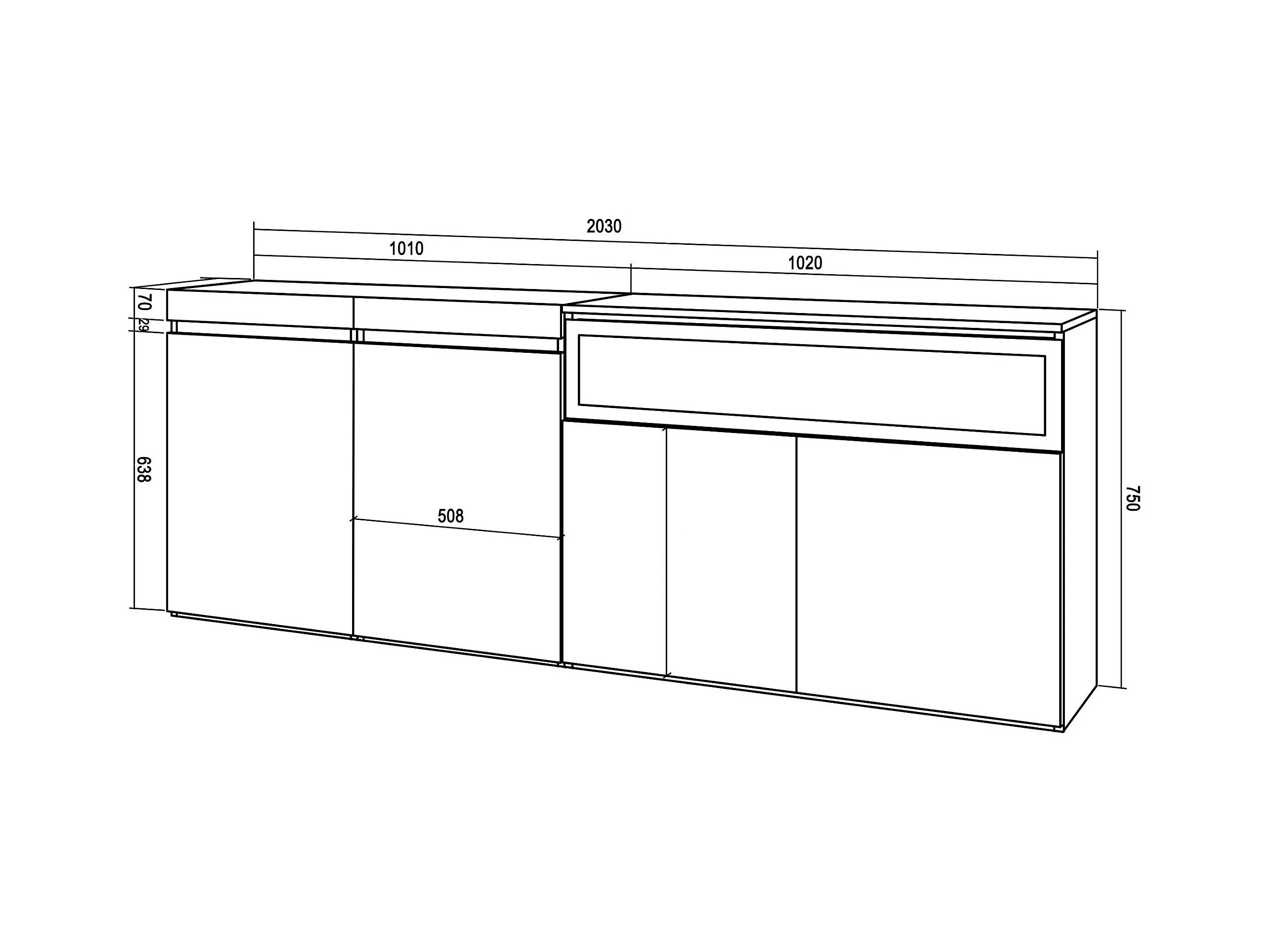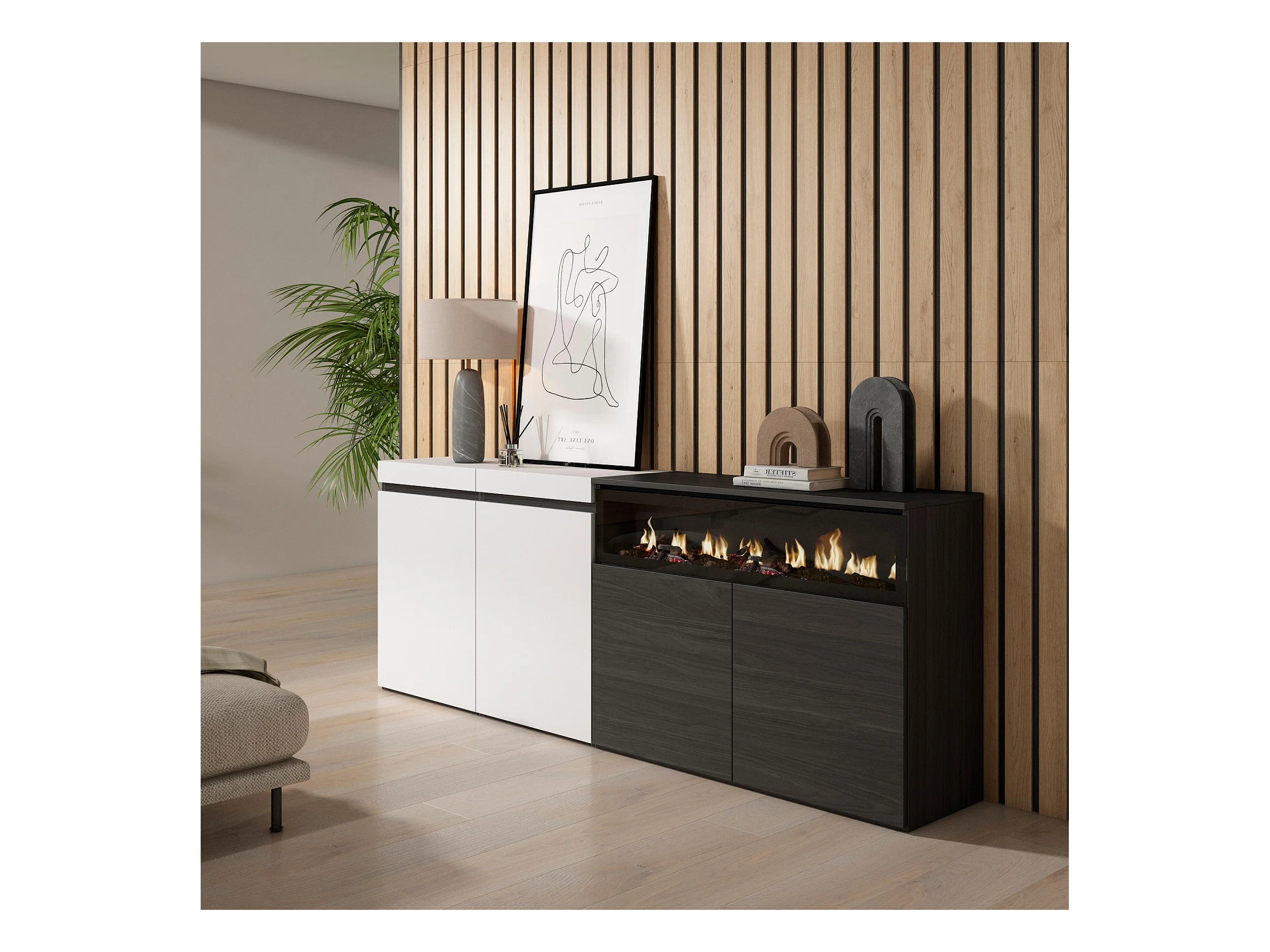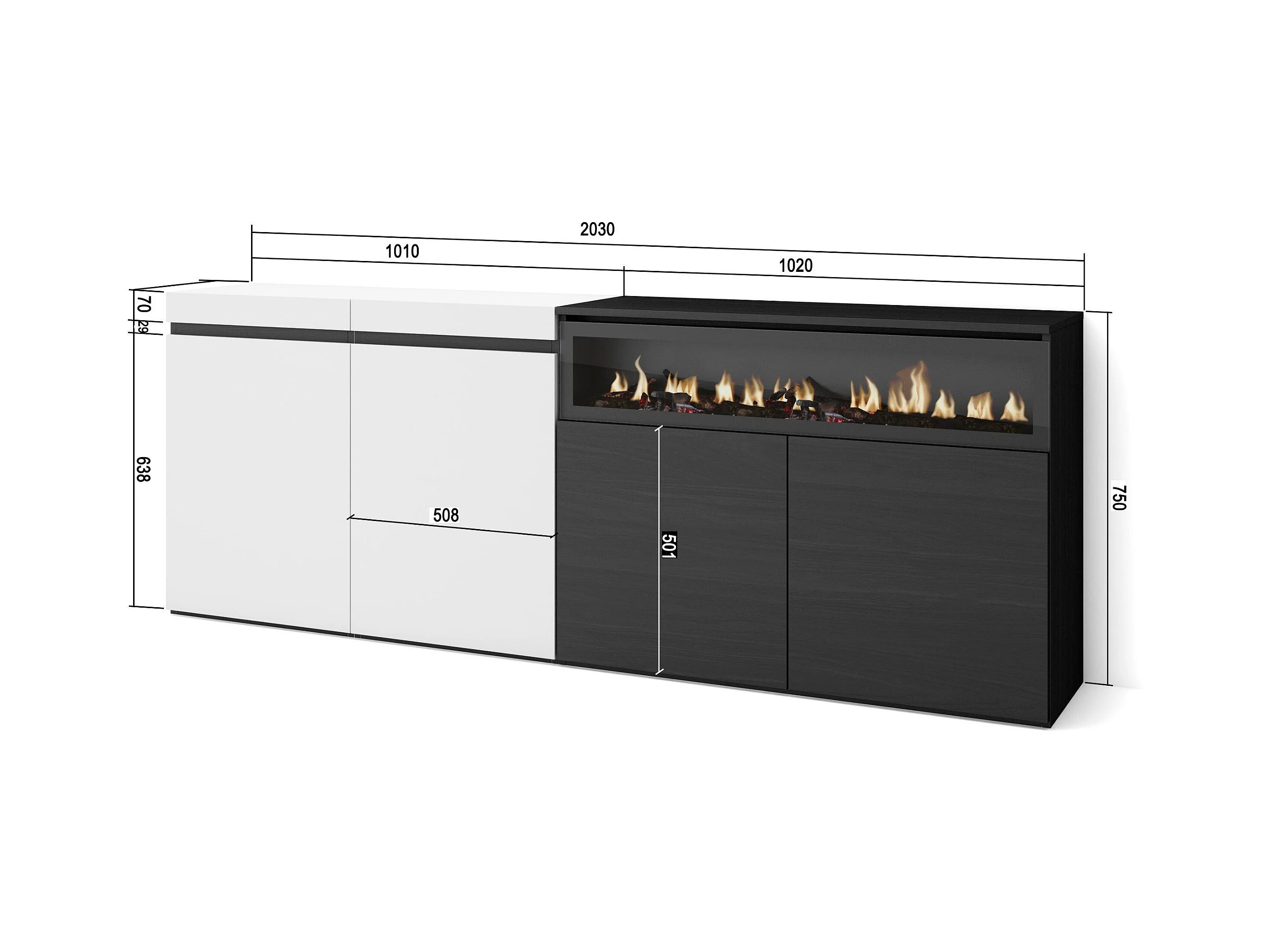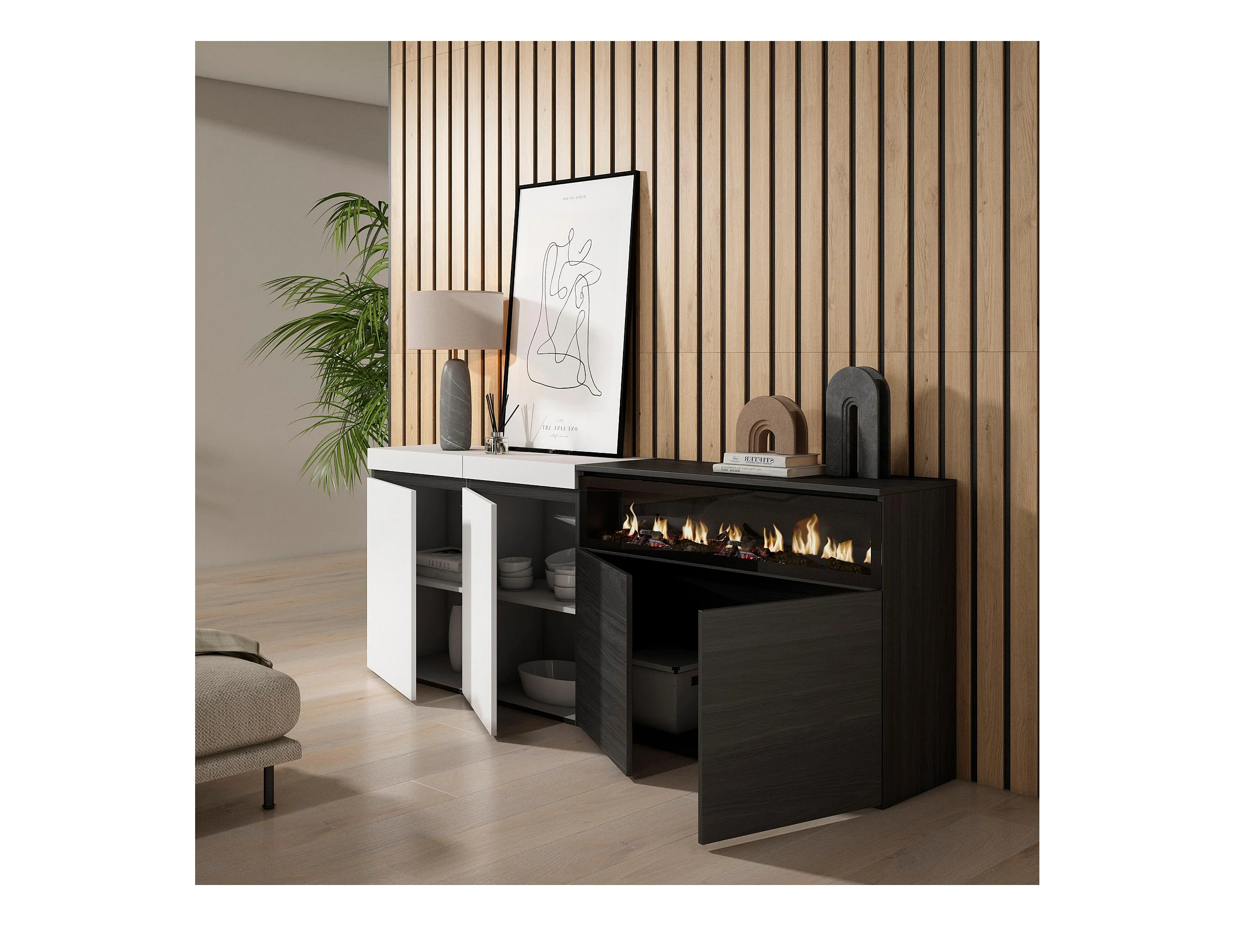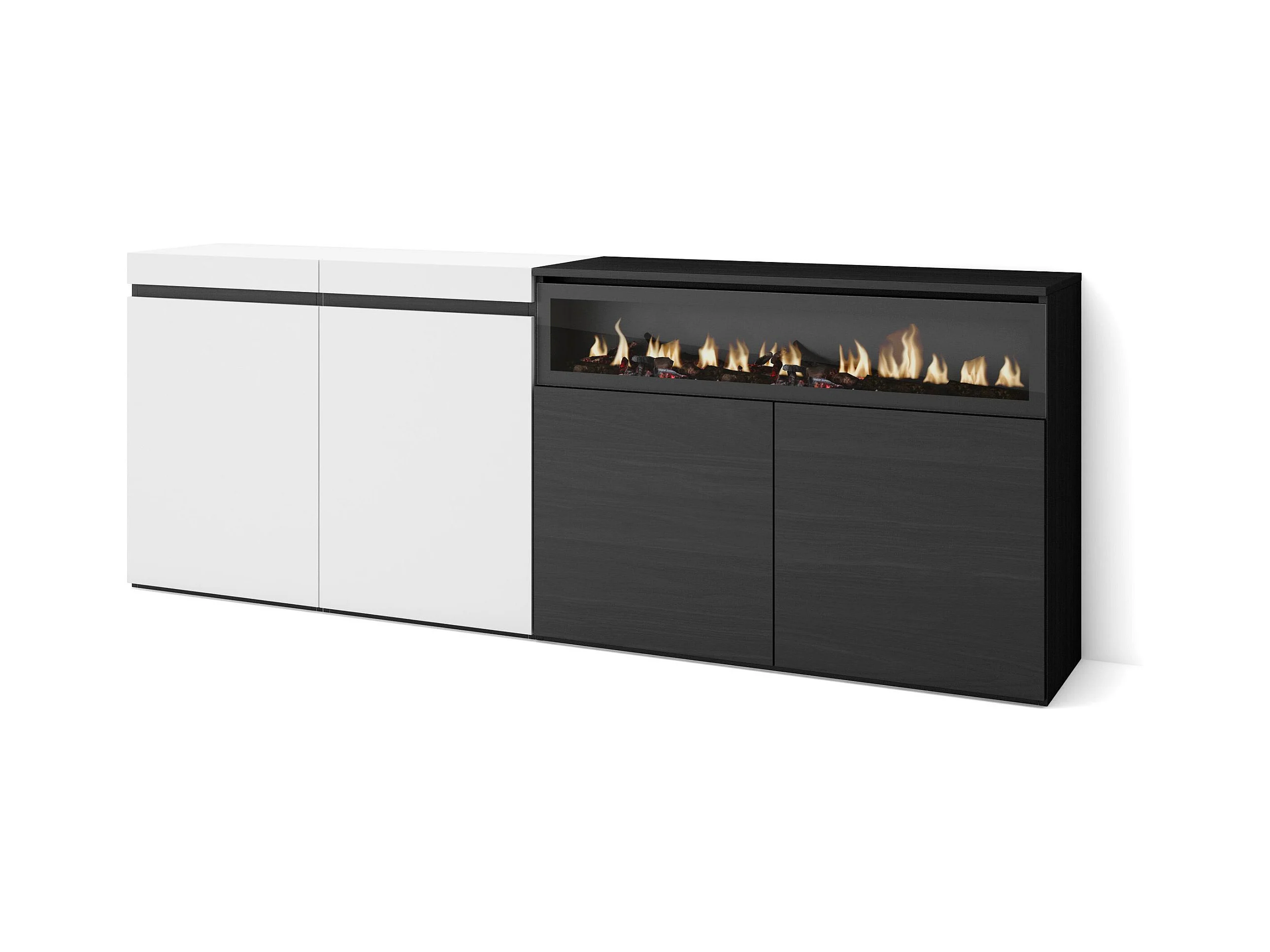 Sideboard, Highboard, 200x35x75cm, 4 Türen, Elektrokamin, Weiß und Schwarz