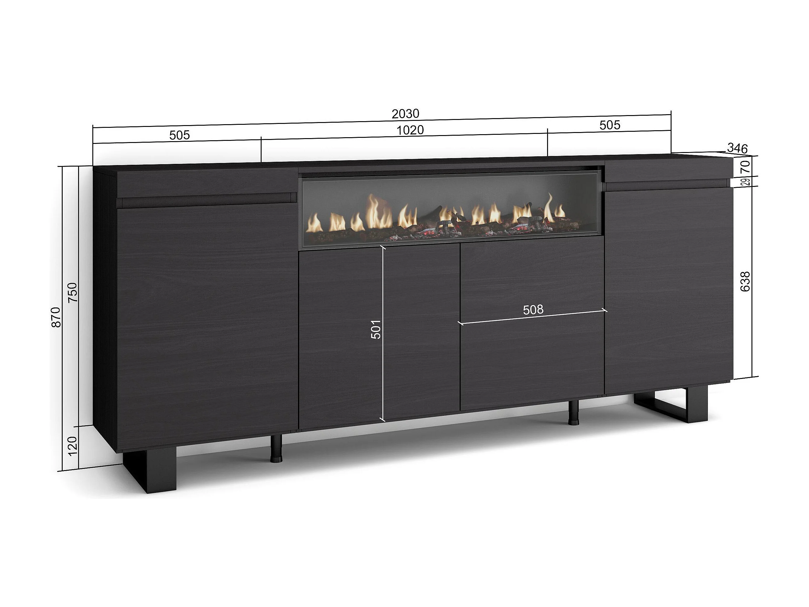 Sideboard, Highboard, 200x35x87cm, 4 Türen, Elektrokamin, Industriedesign, Schwarz
