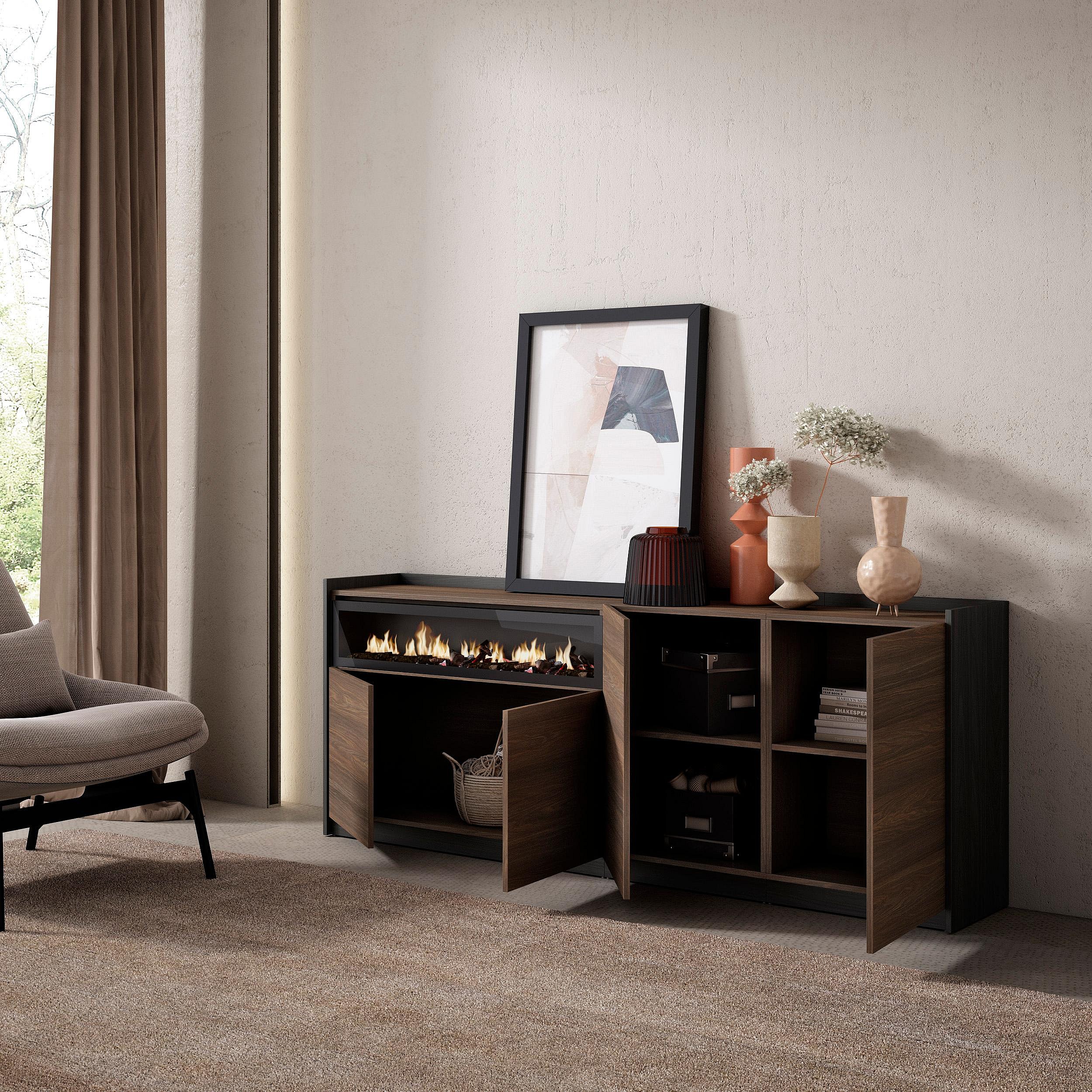 Sideboard, Highboard, 207x80x37 cm, 4 Türen, Elektrokamin., Dunkler Eiche und Schwarz