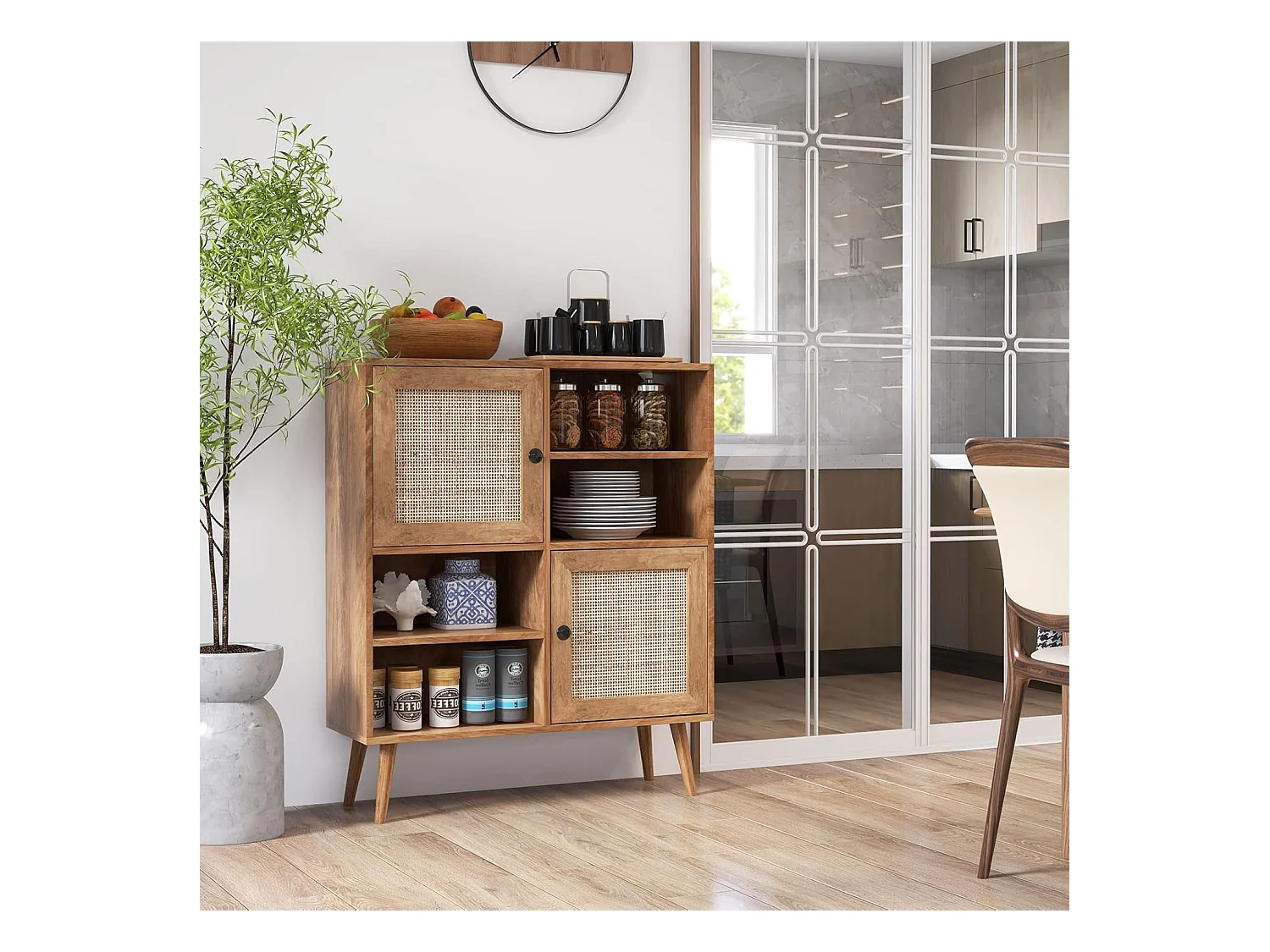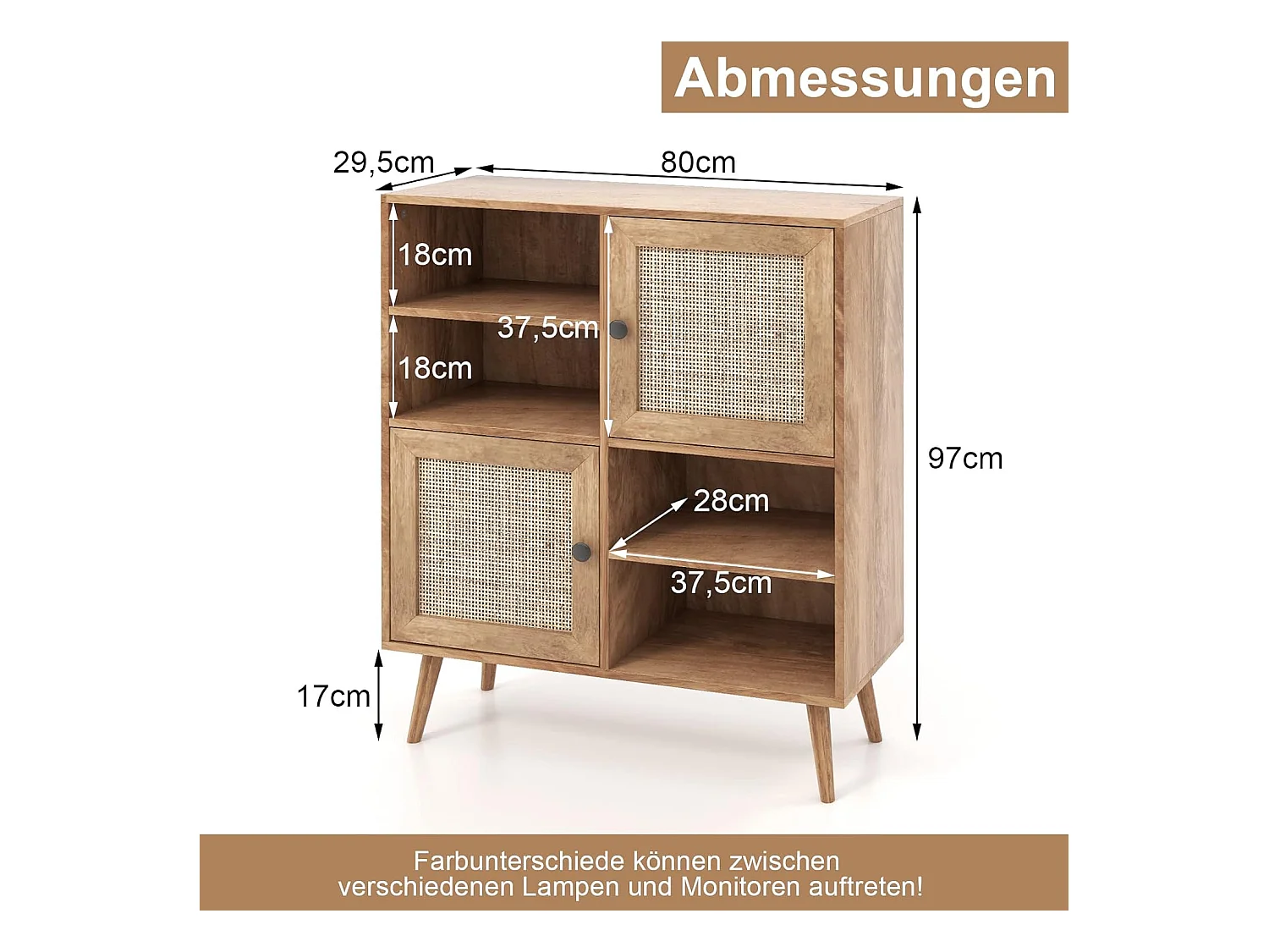 Sideboard Holz, Kommode mit 4 Fächern & 2 Türen, Anrichteschrank Rattan, Schrank modern, 80 x 29,5 x 97cm