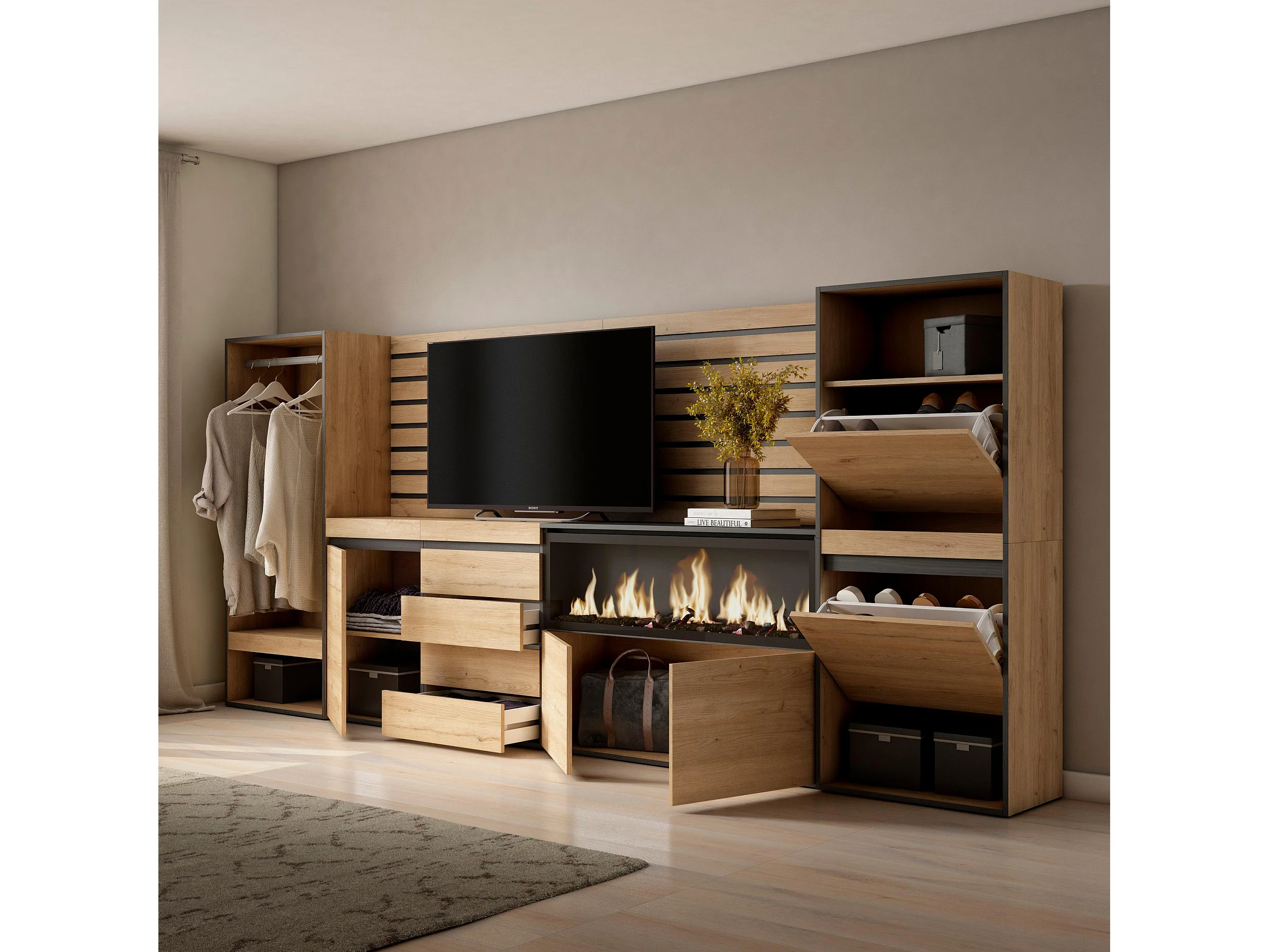 Sideboard, Kommode, 334x35x145cm, Für Schlafzimmer, Elektrokamin XXL, Kommode mit Schubladen, Schuhschrank, Offener Kleiderschrank, Eiche