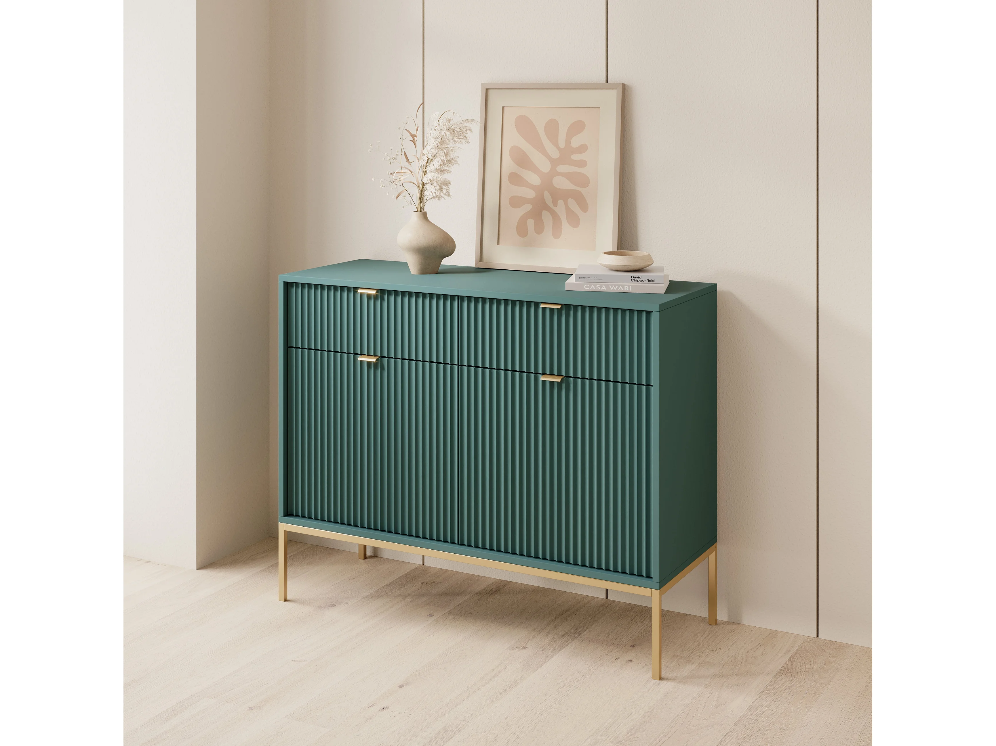 Sideboard mit 2 Türen und 2 Schubladen, mit goldenen Metallfüßen, 104 x 83 cm