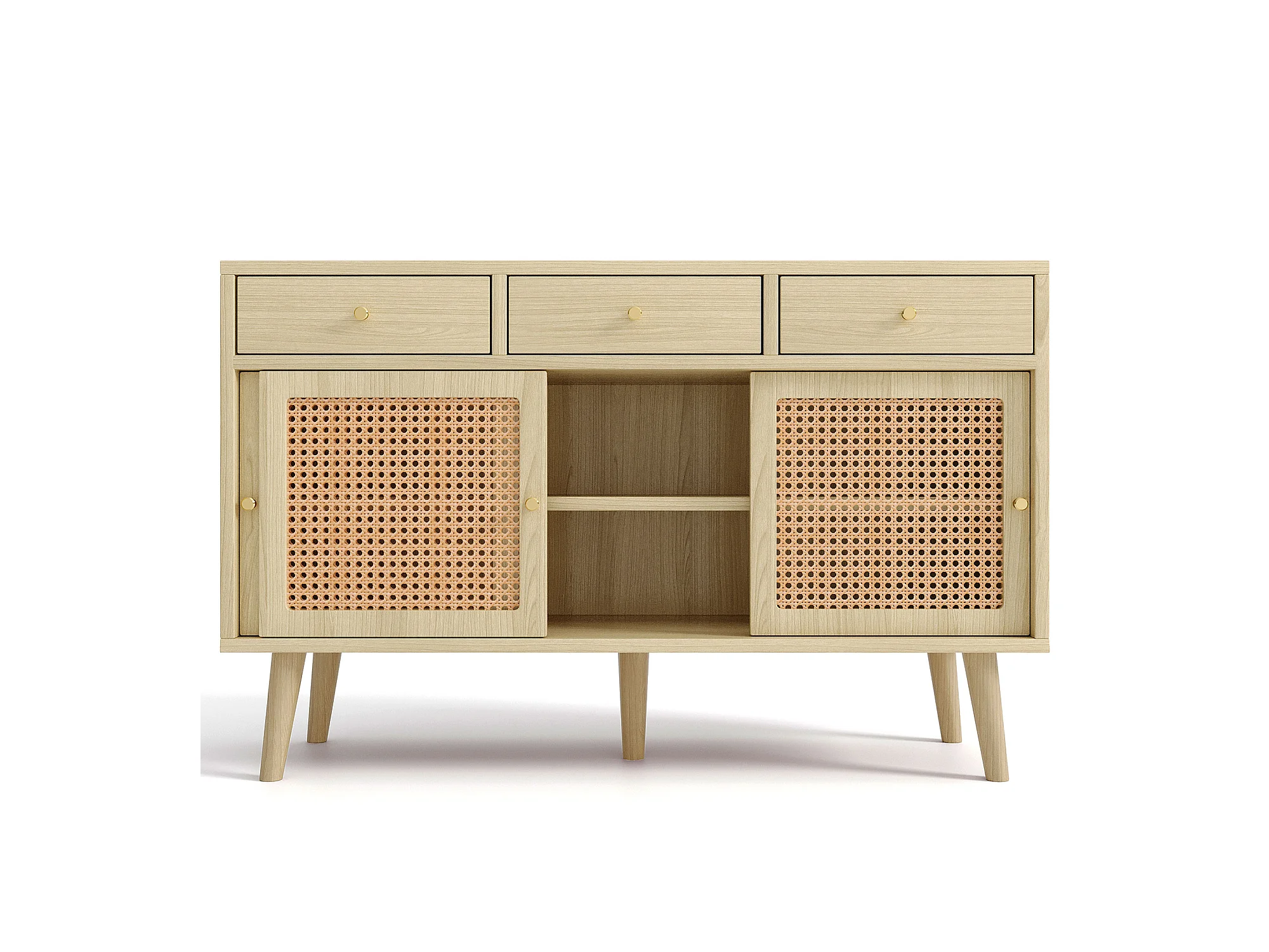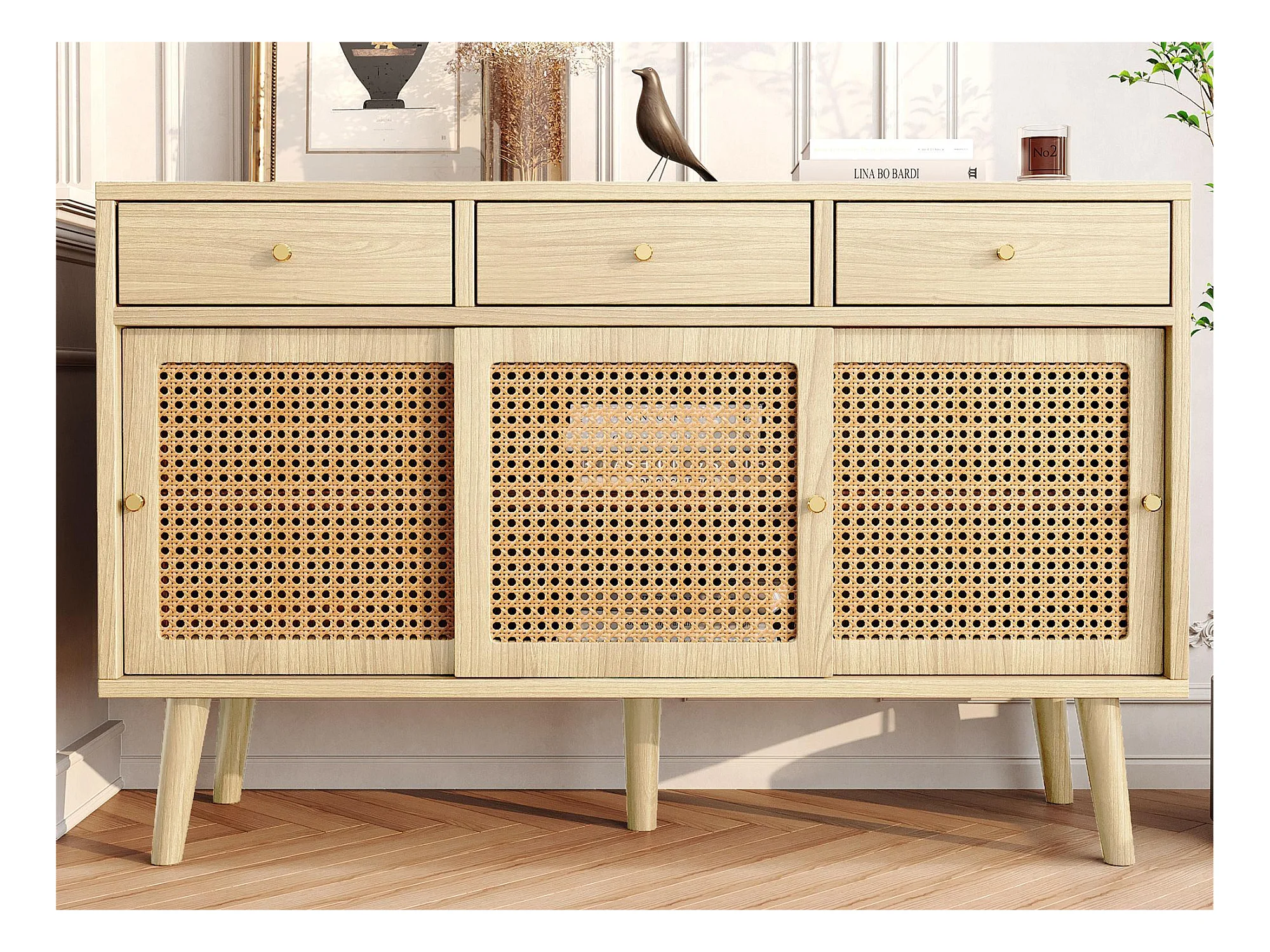 Sideboard mit 3 Schubladen und 3 Schiebetüren aus geflochtenem Rattan – verstellbare Einlegeböden – Natur