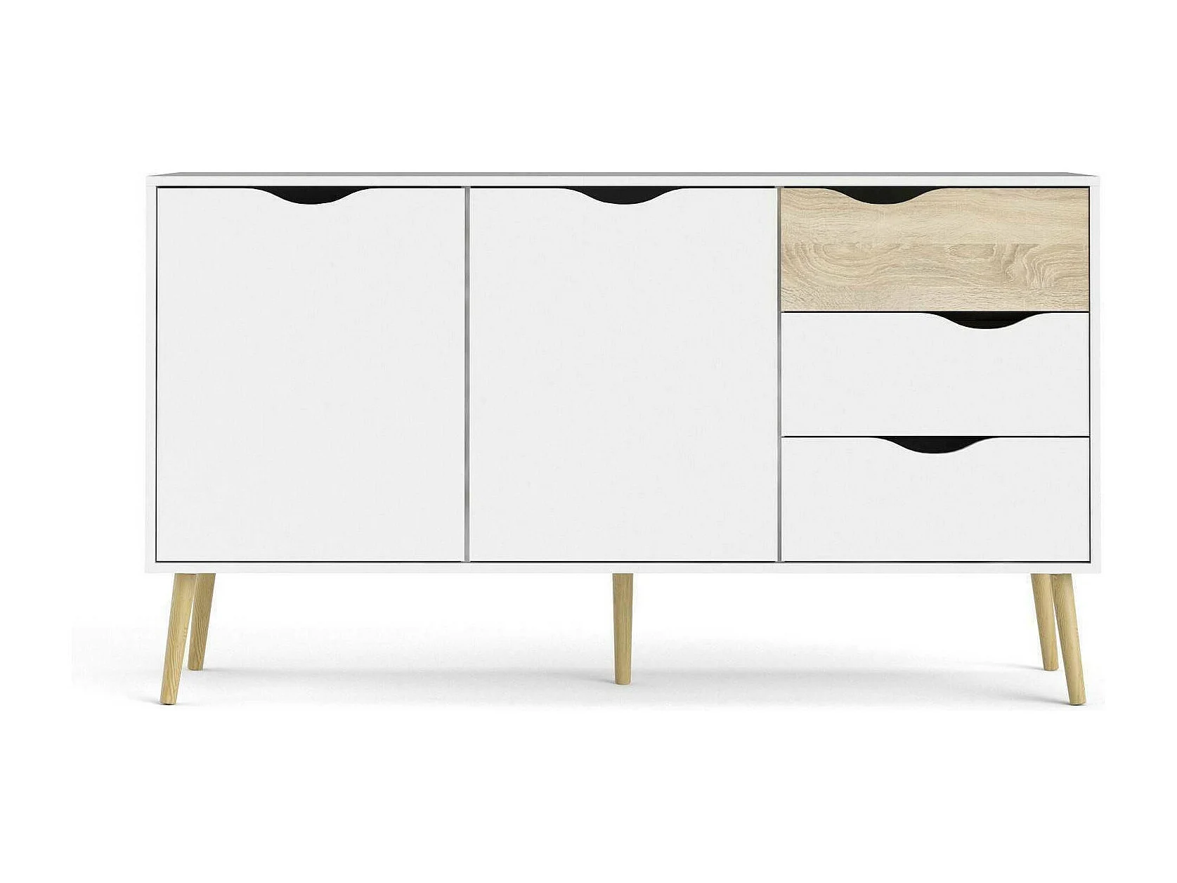 Sideboard mit zwei Türen und drei Schubladen, Weiß und Eiche, Maße 147 x 81 x 39 cm