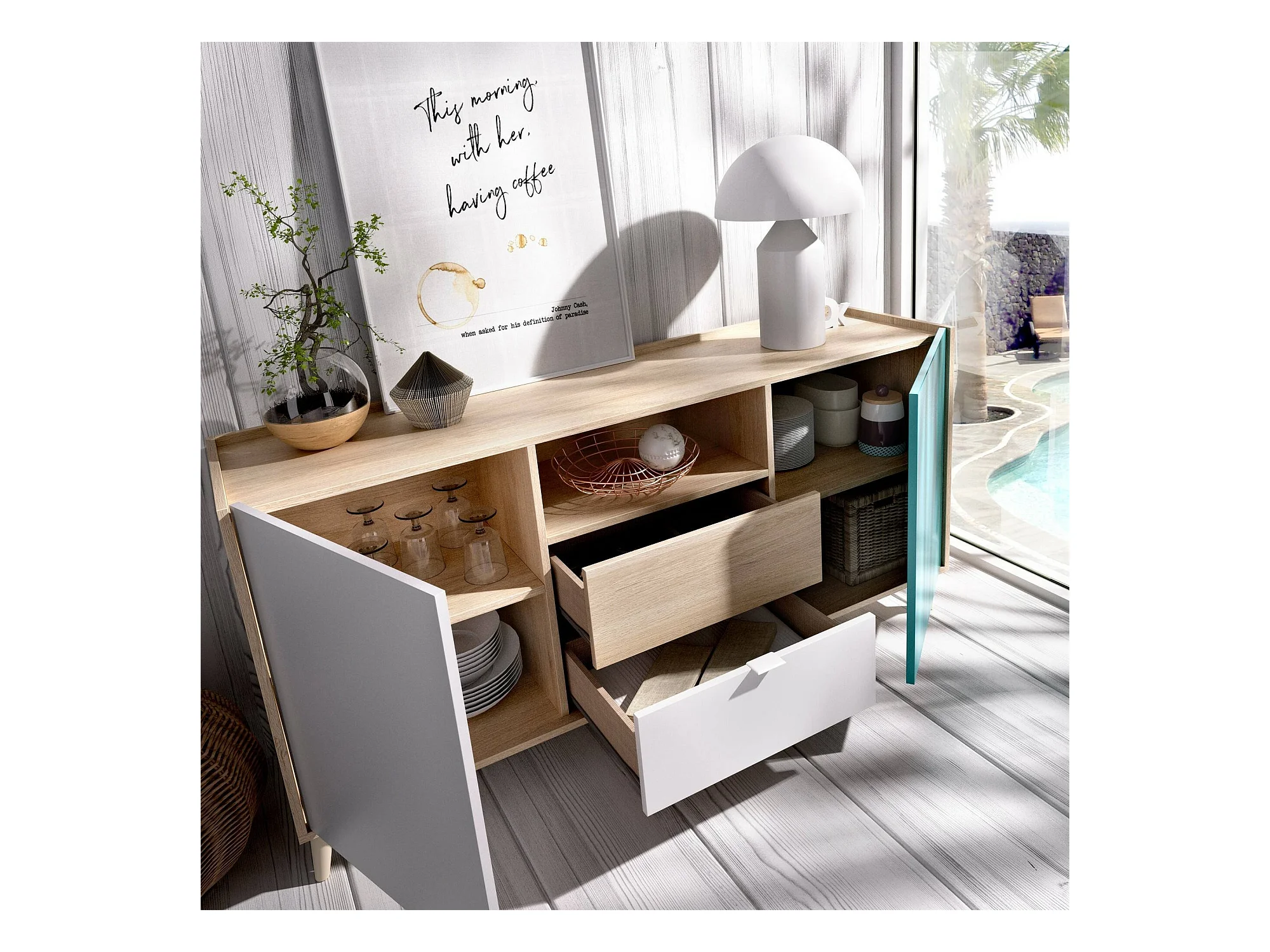 Sideboard Rainier, Wohnzimmer-Buffet, modernes Wohnzimmer-Sideboard mit 2 Türen, 155 x 43 x 75 cm, Weiß und Eiche