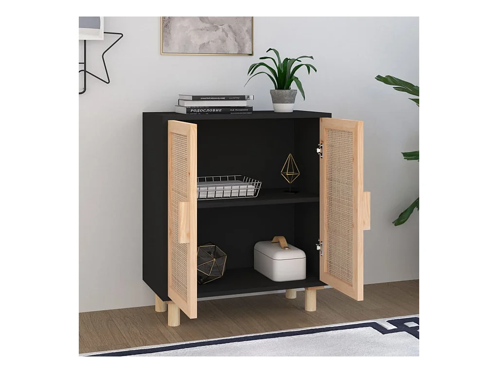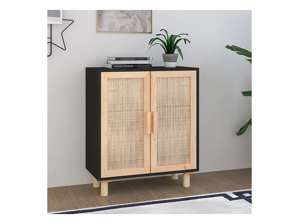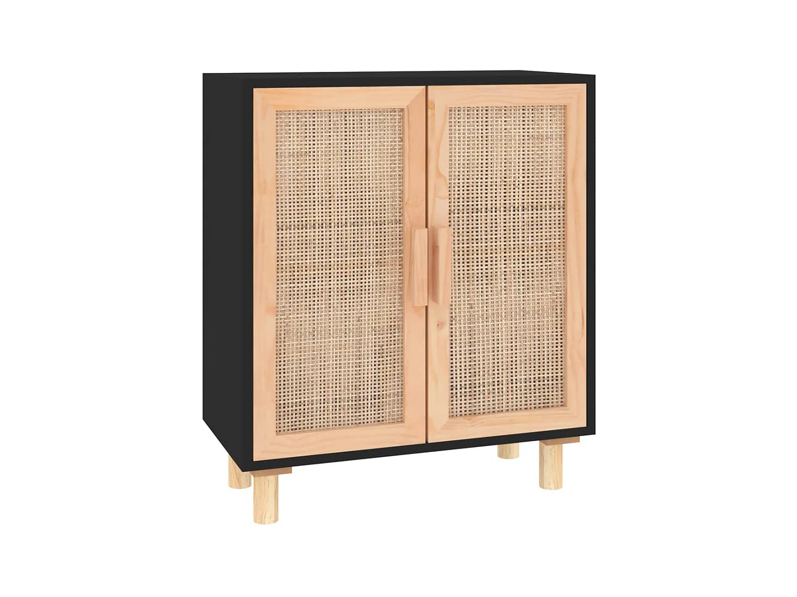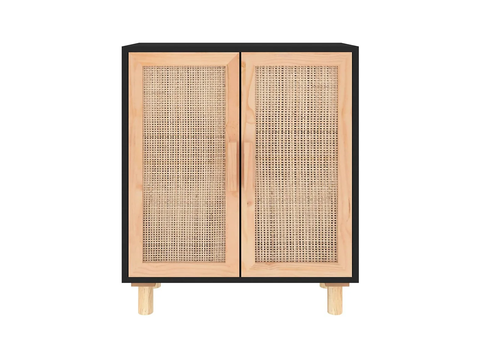 Sideboard Schwarz Anrichte 60x30x70cm Massivholz Kiefer und Natur-Rattan -RM15421