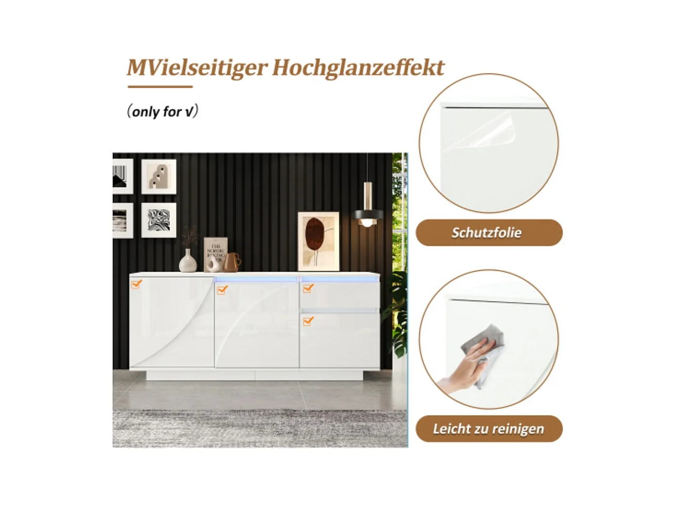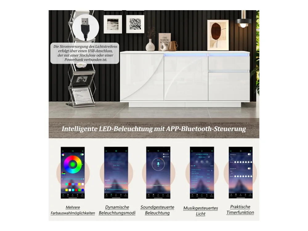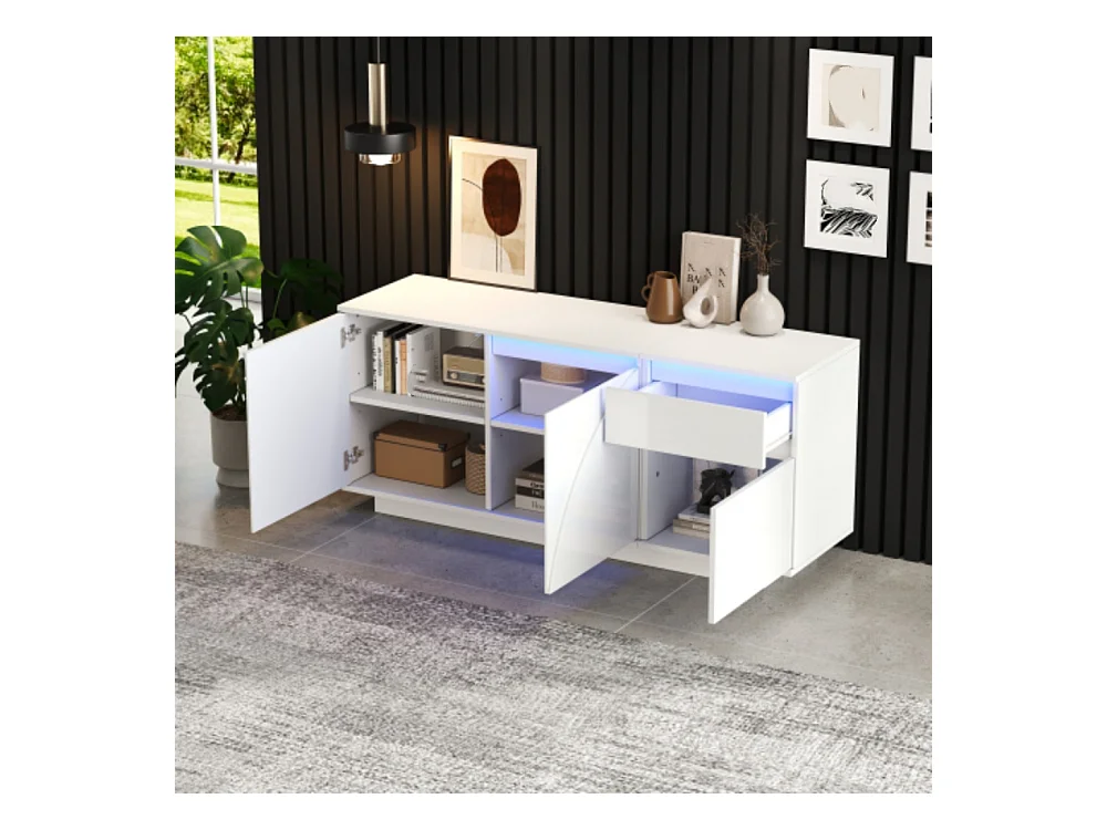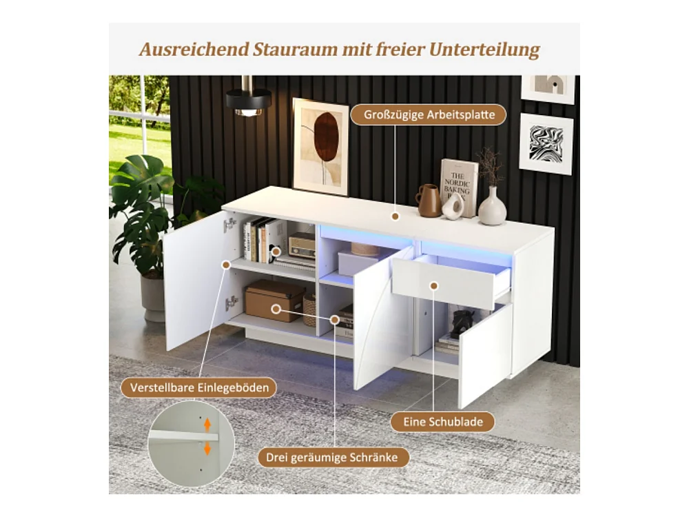 Sideboard, Seitenschrank mit 3 Schränken,kommode mit LED,Schränke mit verstellbaren Einlegeböden,Hochglanz-Wohnzimmerschrank,140*40*60cm