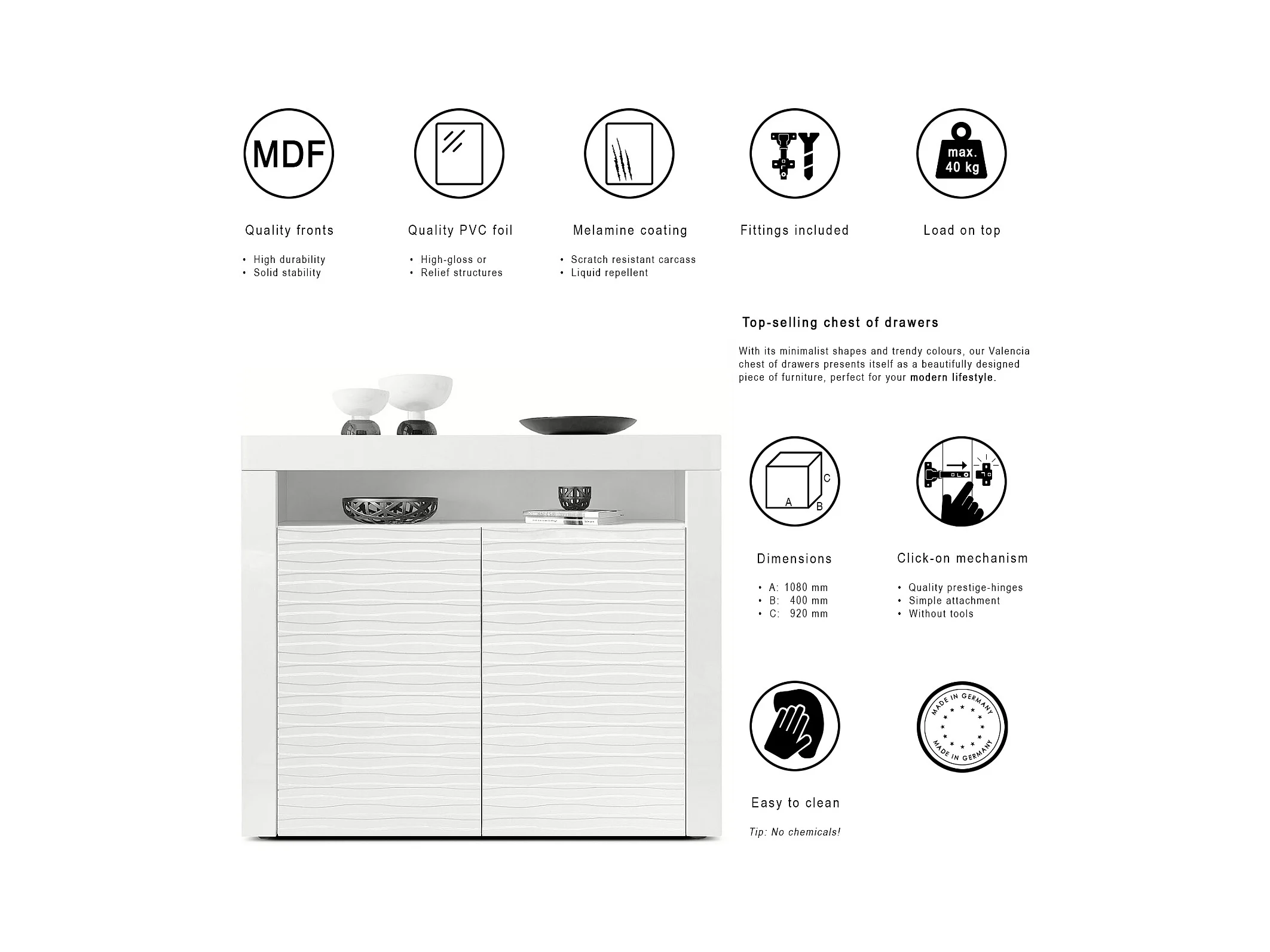 SIDEBOARD Valencia Fronten in Weiß Hochglanz Harmony mit 3D Struktur