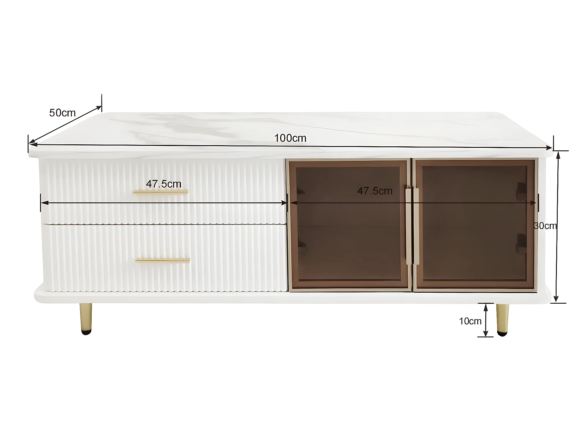 Skandinavischer Couchtisch – 2 Schubladen und 2 Türen – integrierte LED – Furnier mit Marmormuster – Weiß