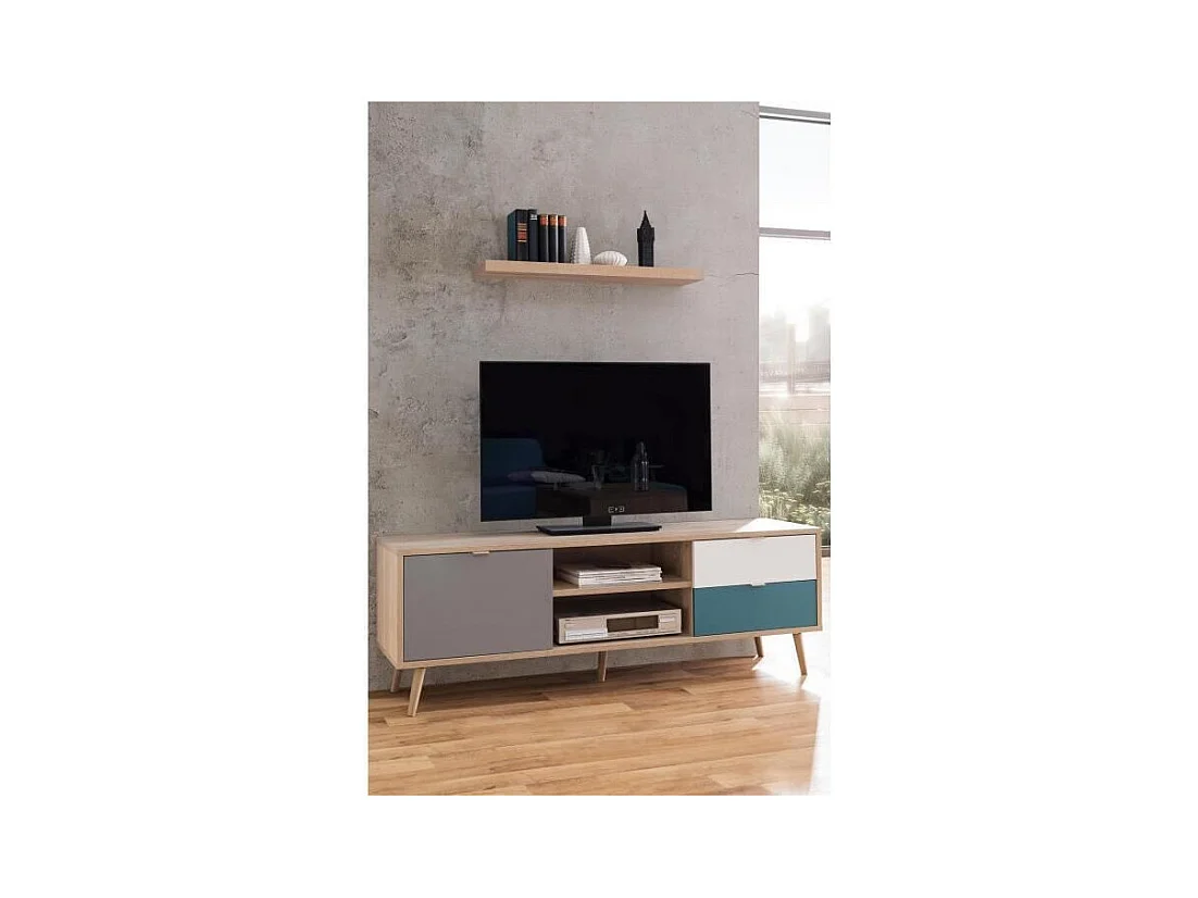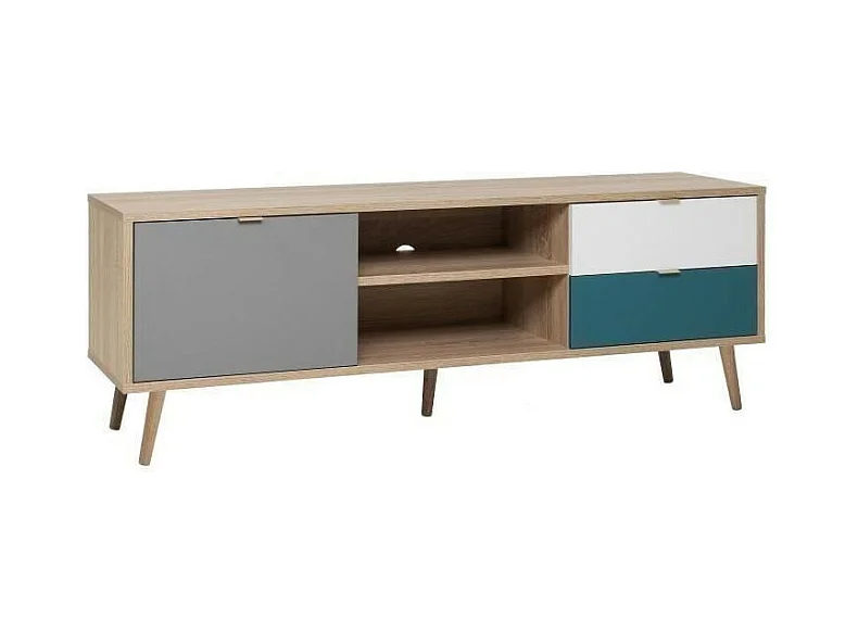 Skandinavischer TVSchrank – Dekor Eiche, Grau, Weiß und Petrolblau – 1 Tür – 150 x 40 x Höhe 51 cm