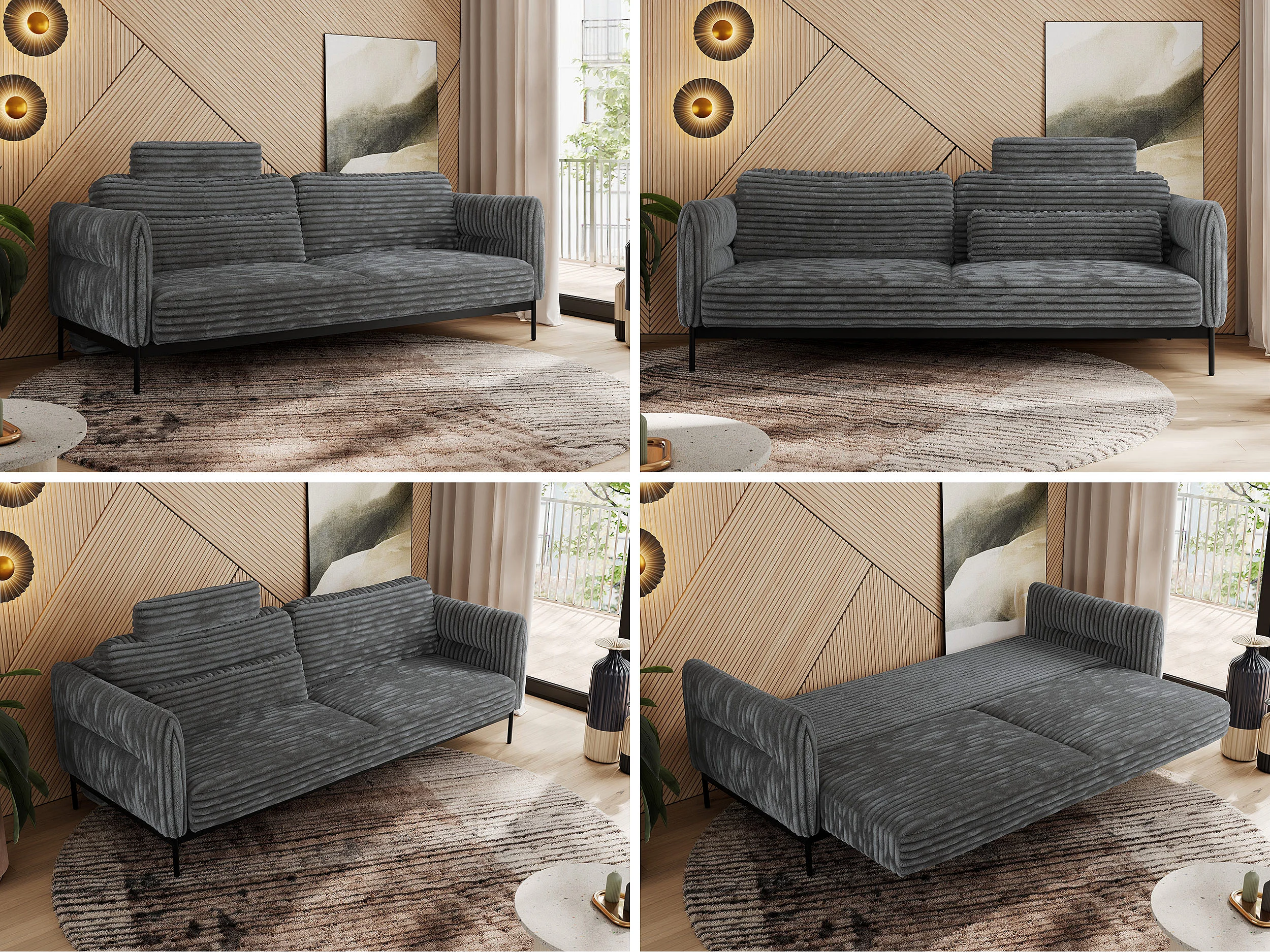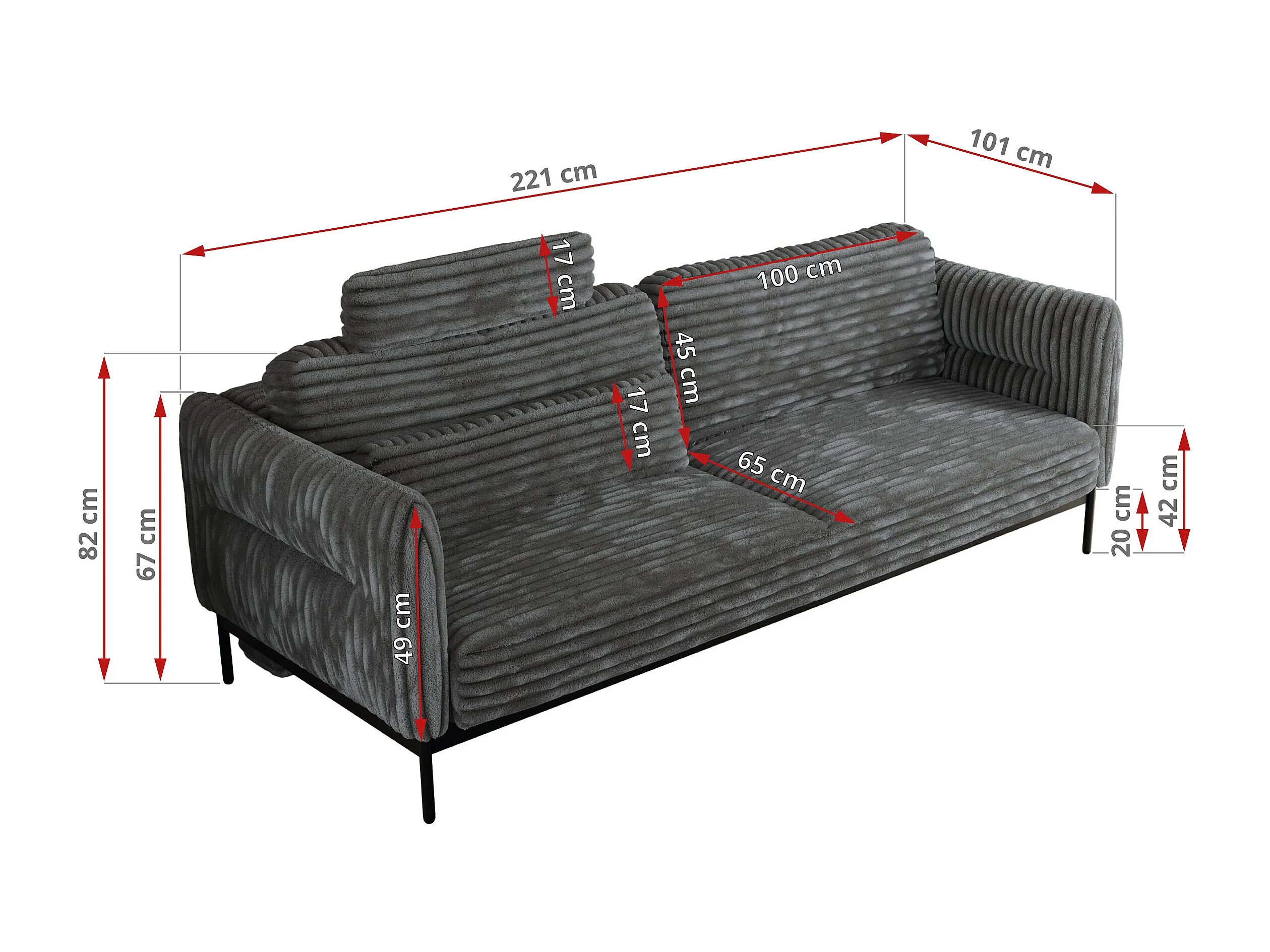 Sofa SALENTO - 3-Sitzer mit Metallbeine, mobile Kopfstütze, Schlafsofa mit lose Kissen - Dunkelgrau Cord