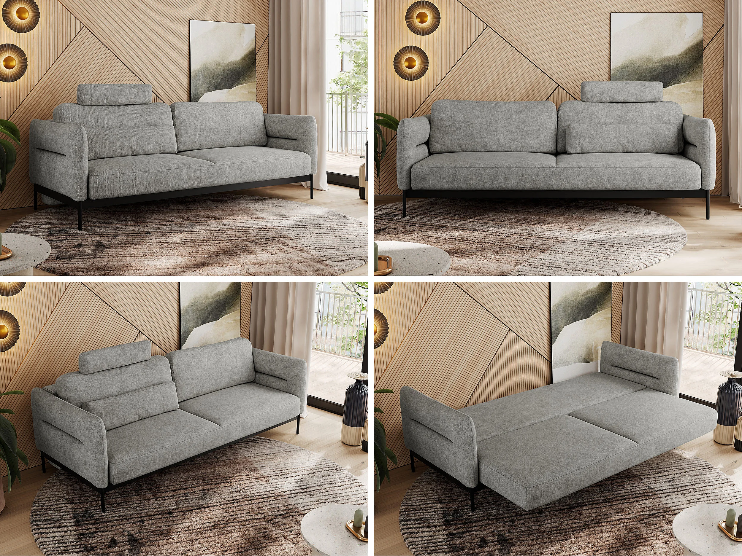 Sofa SALENTO - 3-Sitzer mit Metallbeine, mobile Kopfstütze, Schlafsofa mit lose Kissen - Hellgrau Strukture