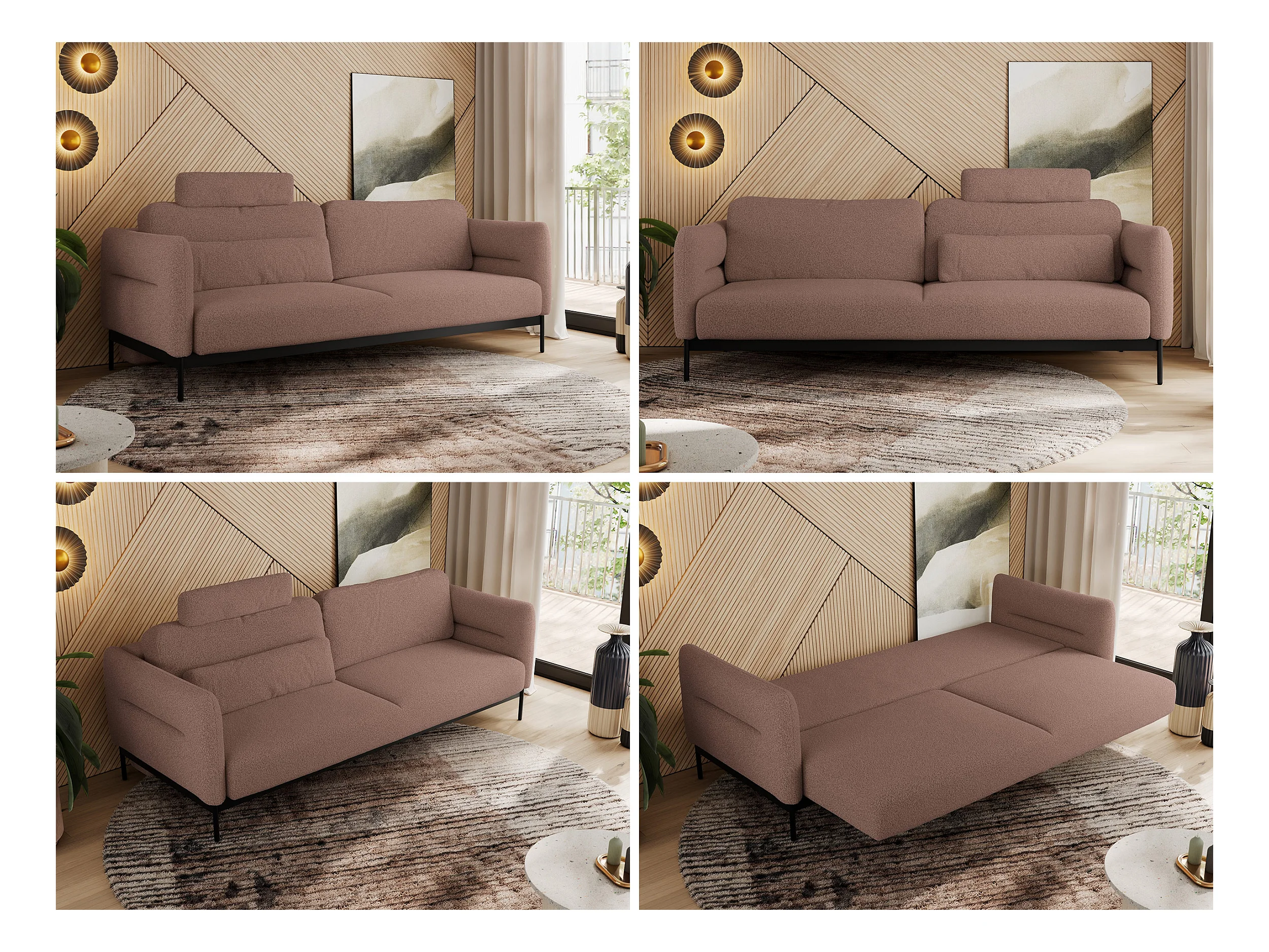 Sofa SALENTO - 3-Sitzer mit Metallbeine, mobile Kopfstütze, Schlafsofa mit lose Kissen - Rosa Boucle