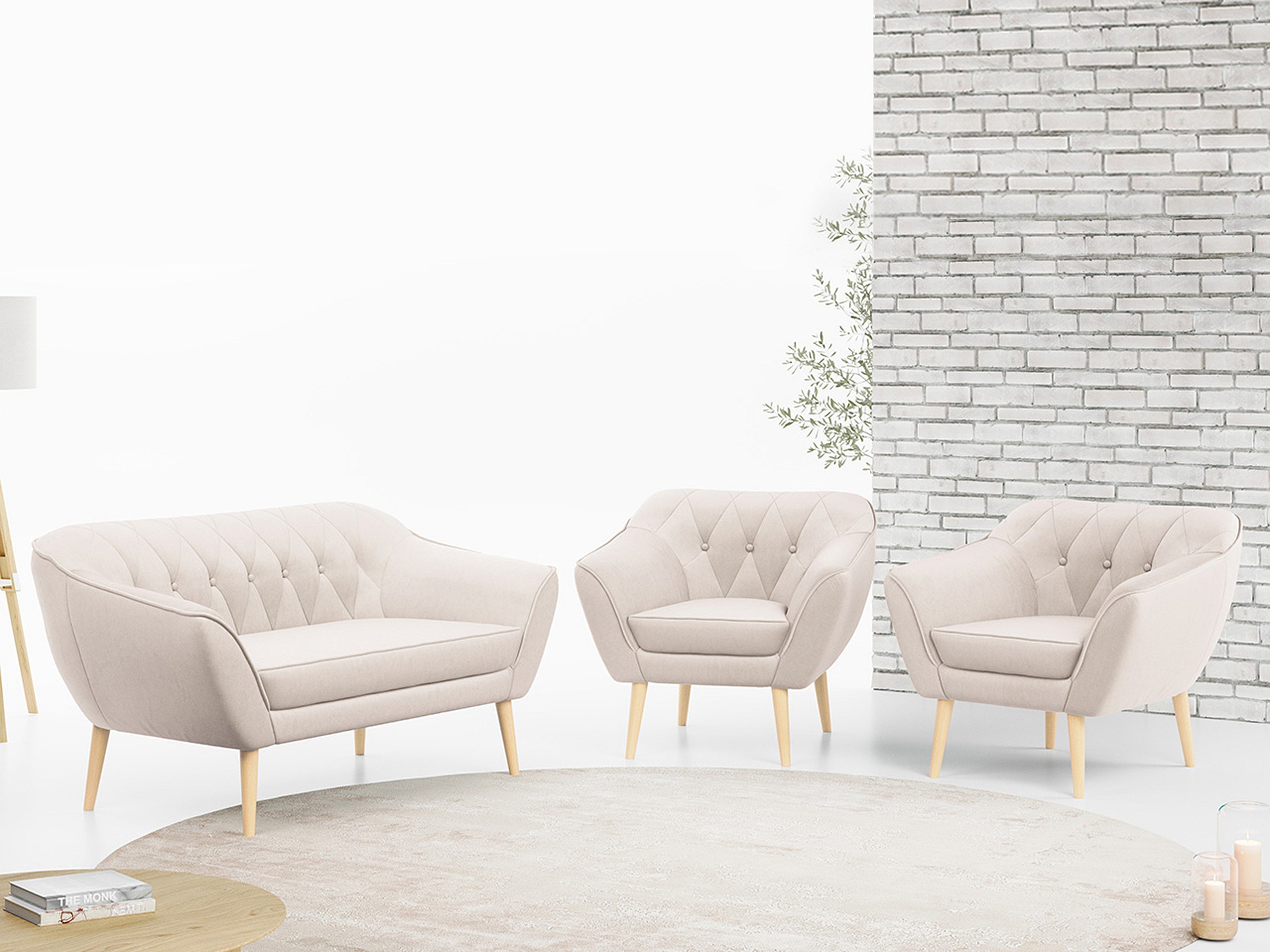 Sofagarnitur PIRS - 2+1+1, Sofa mit Sesseln, Skandinavischer Design, Armlehnen - Creme Velvet