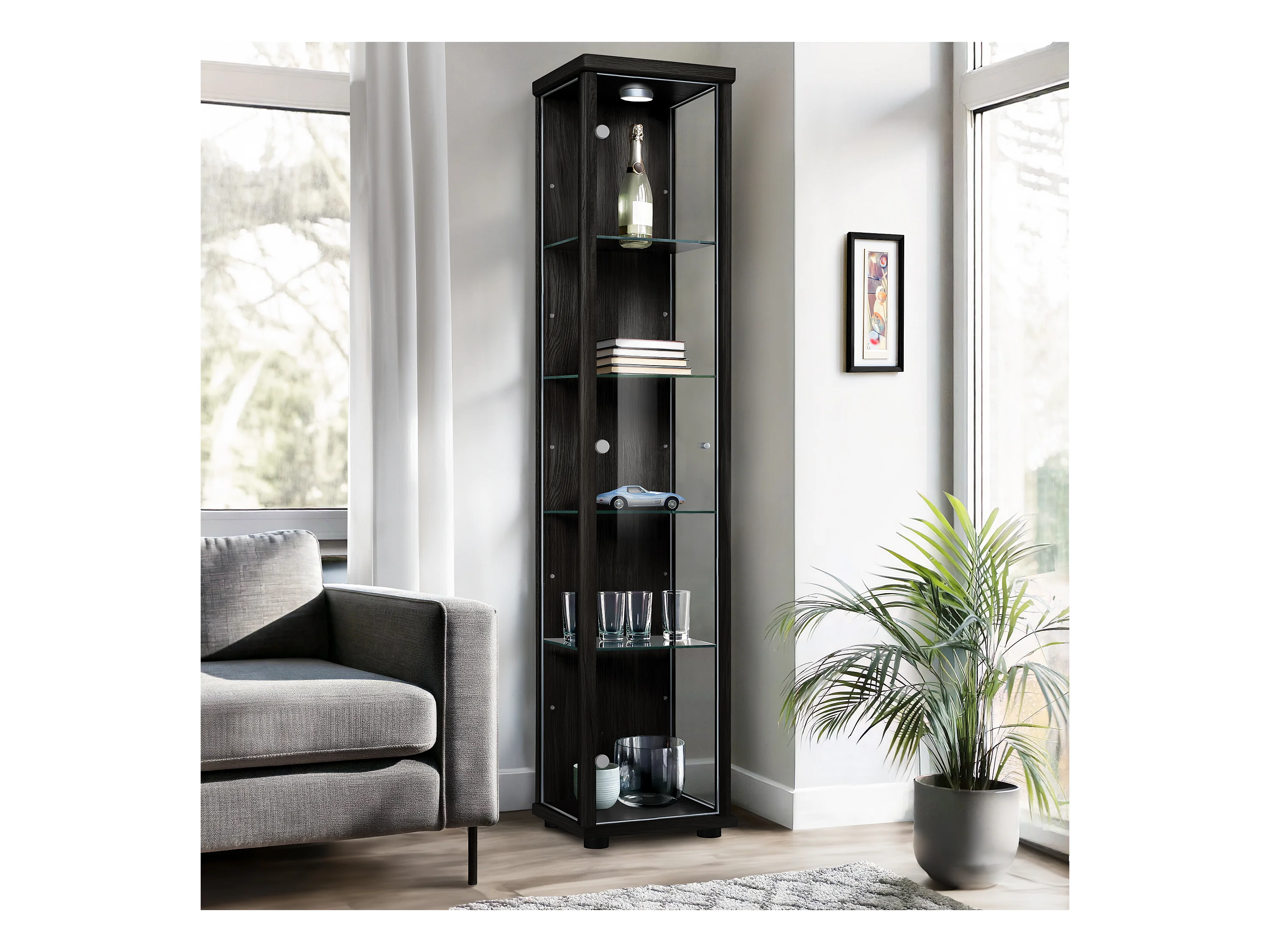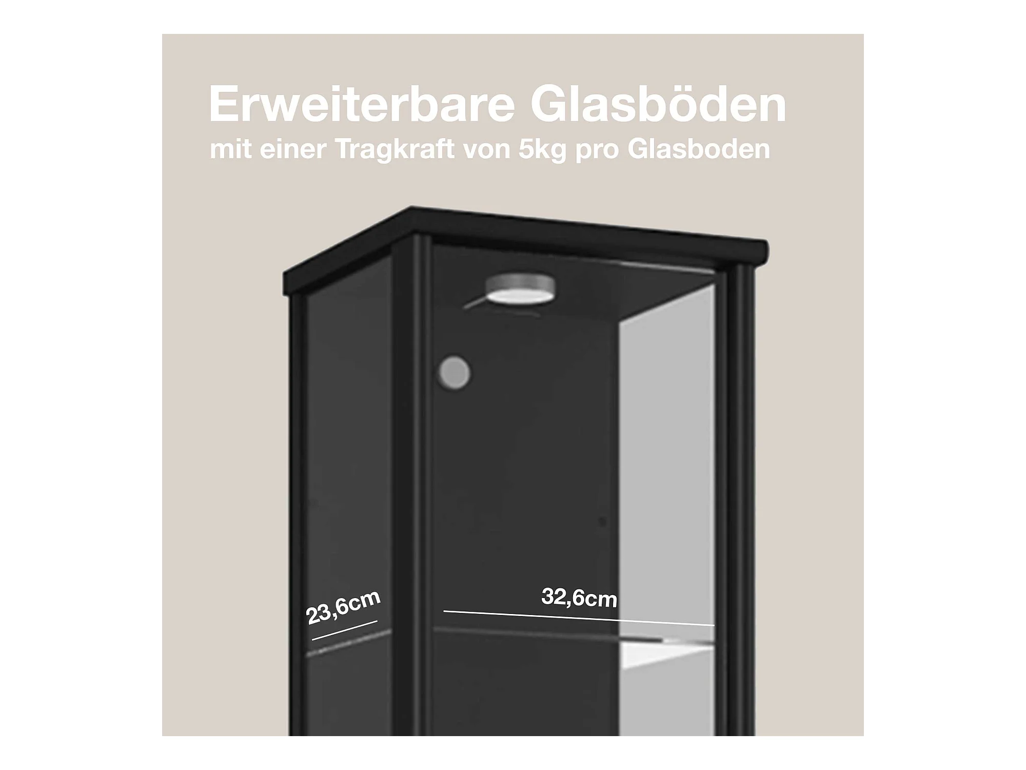 Standvitrine mit 1 Tür, 4 Höhenverstellbaren Glasböden - Mit LED-Beleuchtung- 176x37x33 cm - Schwarz