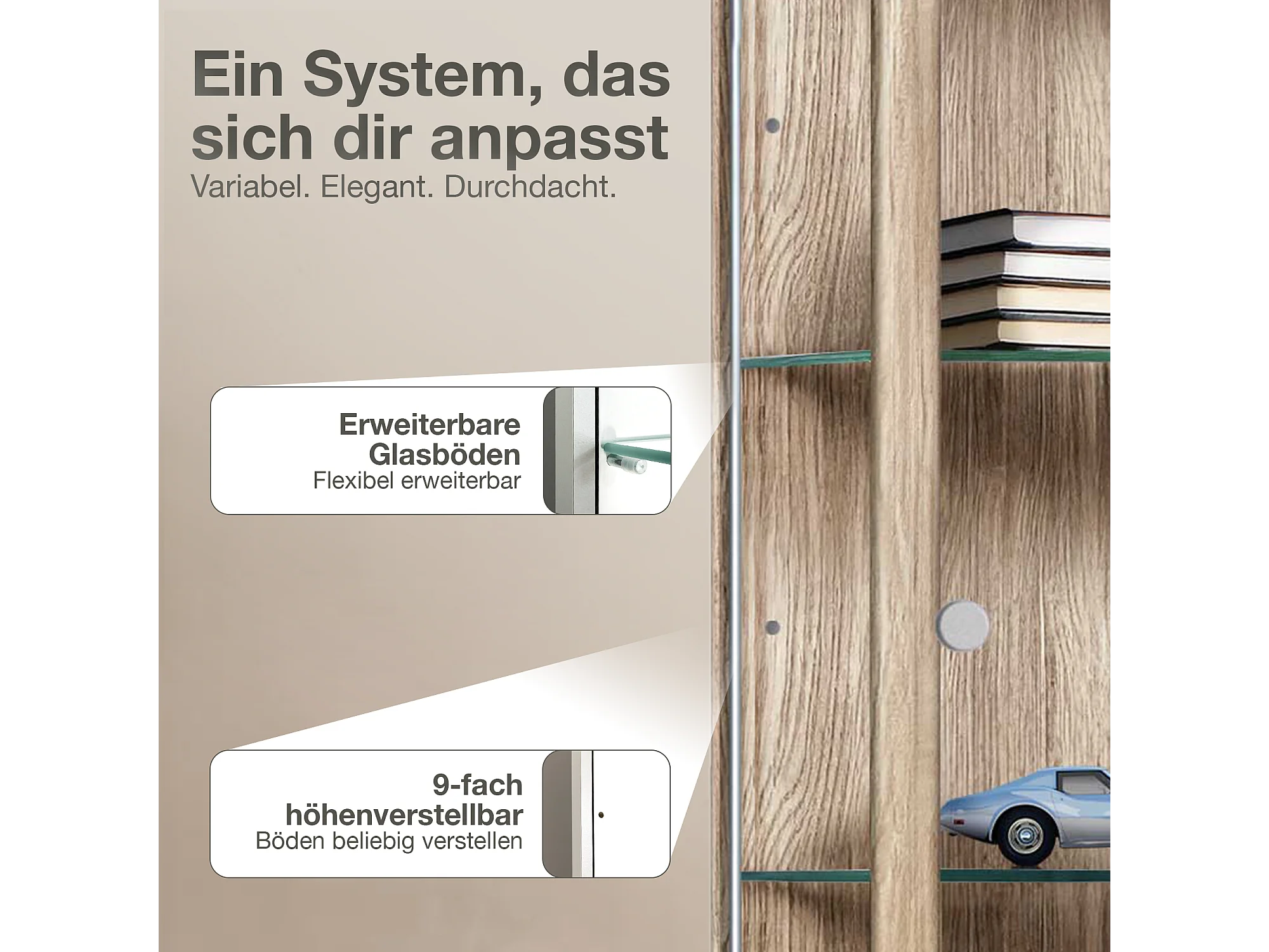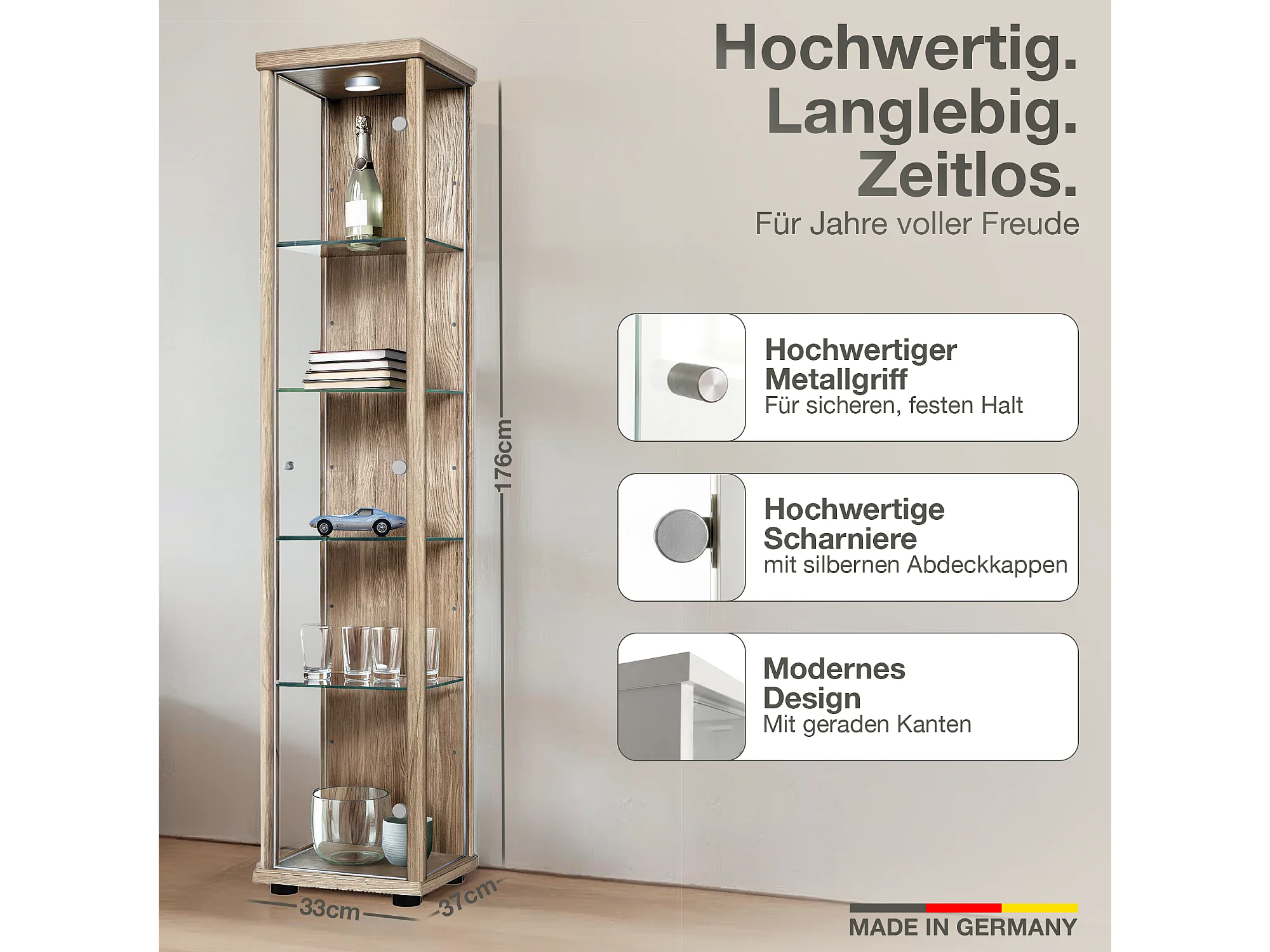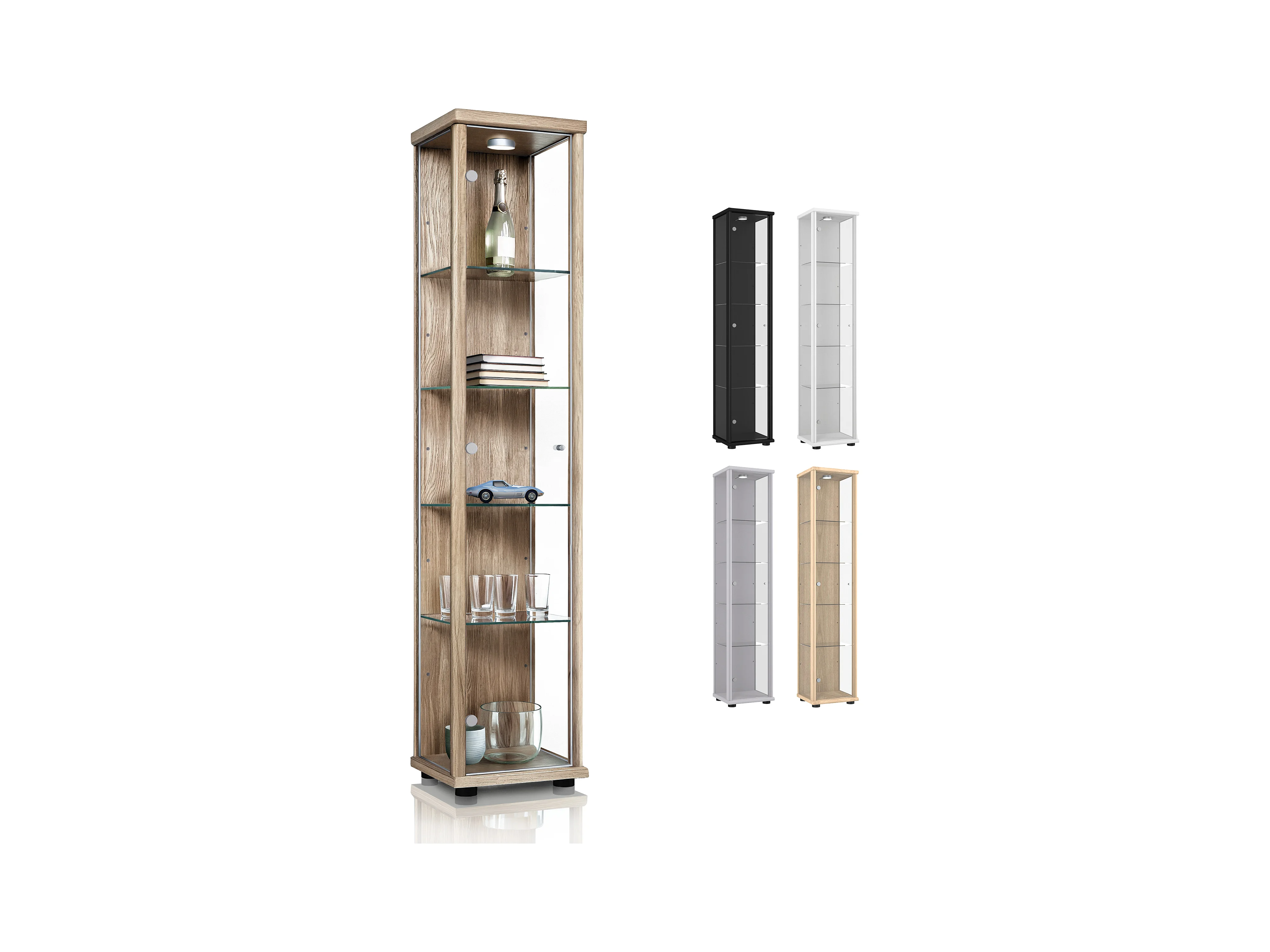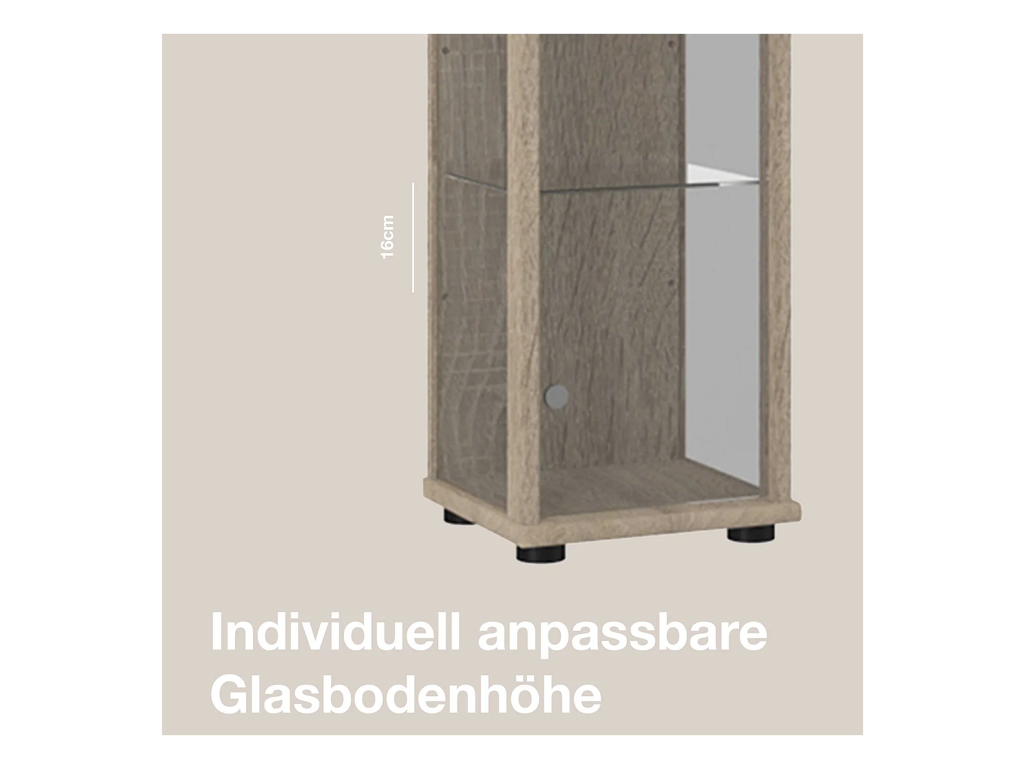 Standvitrine mit 1 Tür, 4 Höhenverstellbaren Glasböden - Mit LED-Beleuchtung- 176x37x33 cm - Sonoma Eiche
