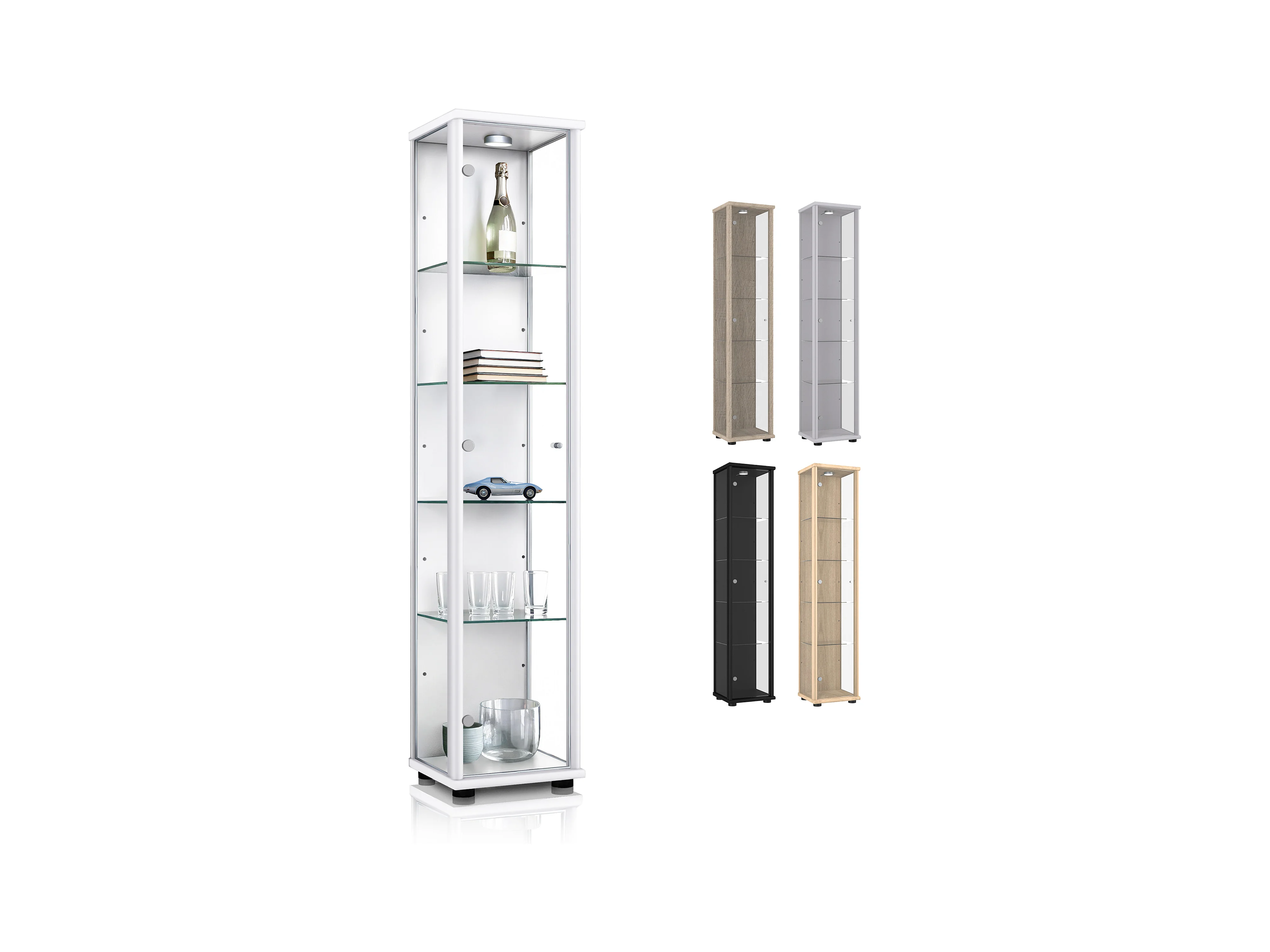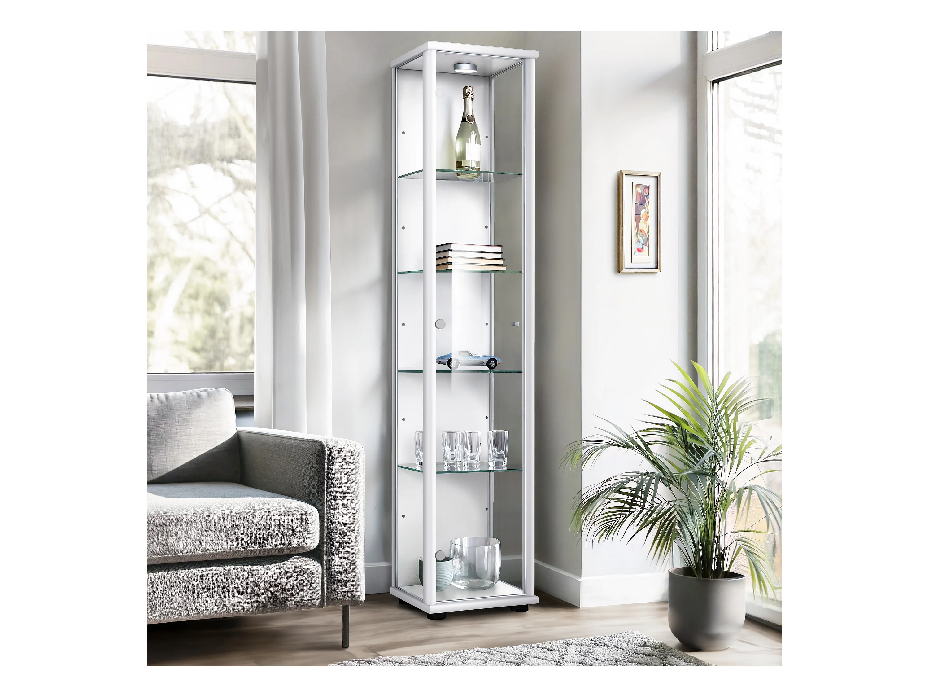 Standvitrine mit 1 Tür, 4 Höhenverstellbaren Glasböden - Mit LED-Beleuchtung- 176x37x33 cm - Weiß