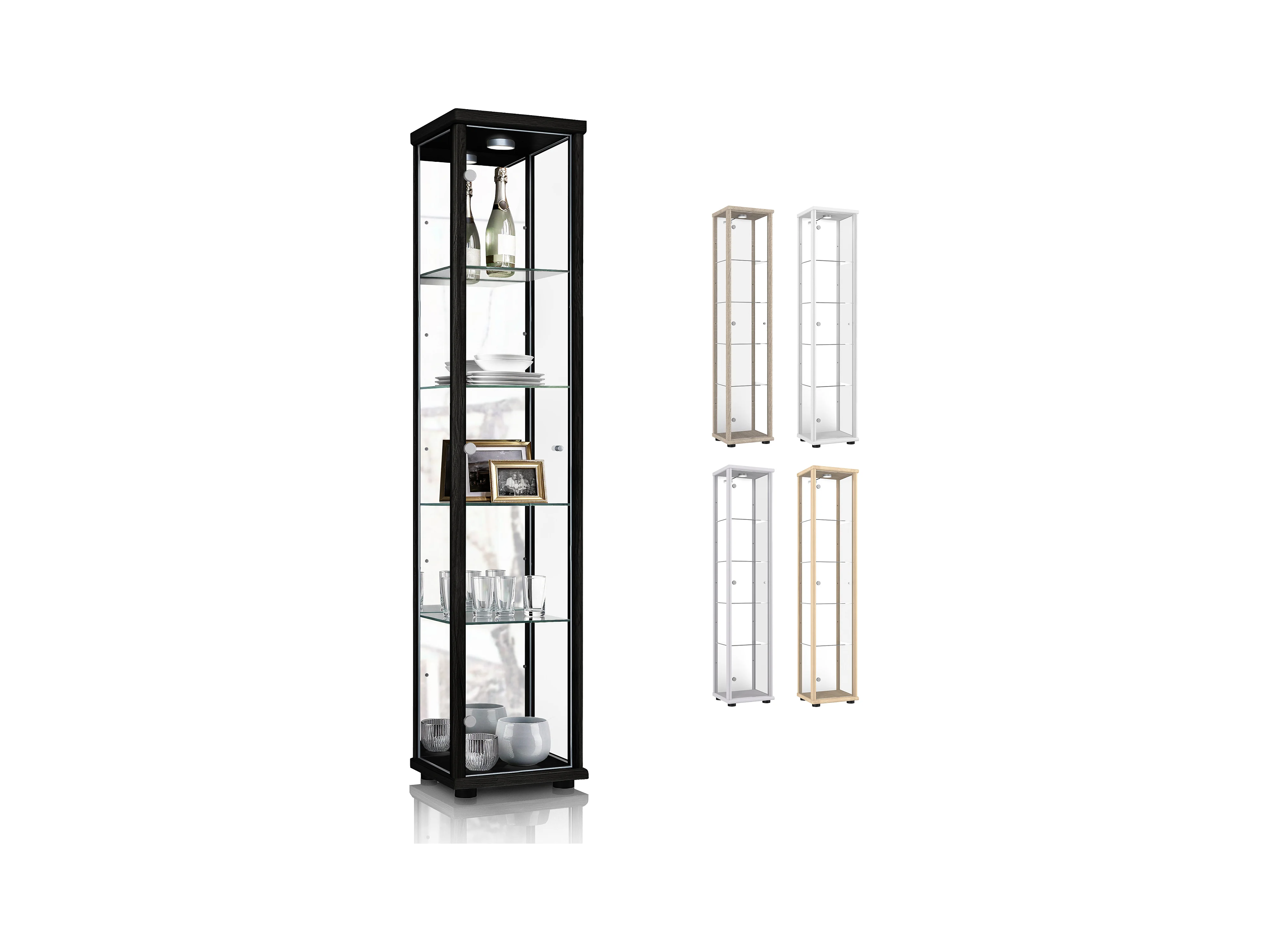 Standvitrine mit 1 Tür, 4 Höhenverstellbaren Glasböden & Spiegel - Mit LED-Beleuchtung- 176x37x33 cm - Schwarz