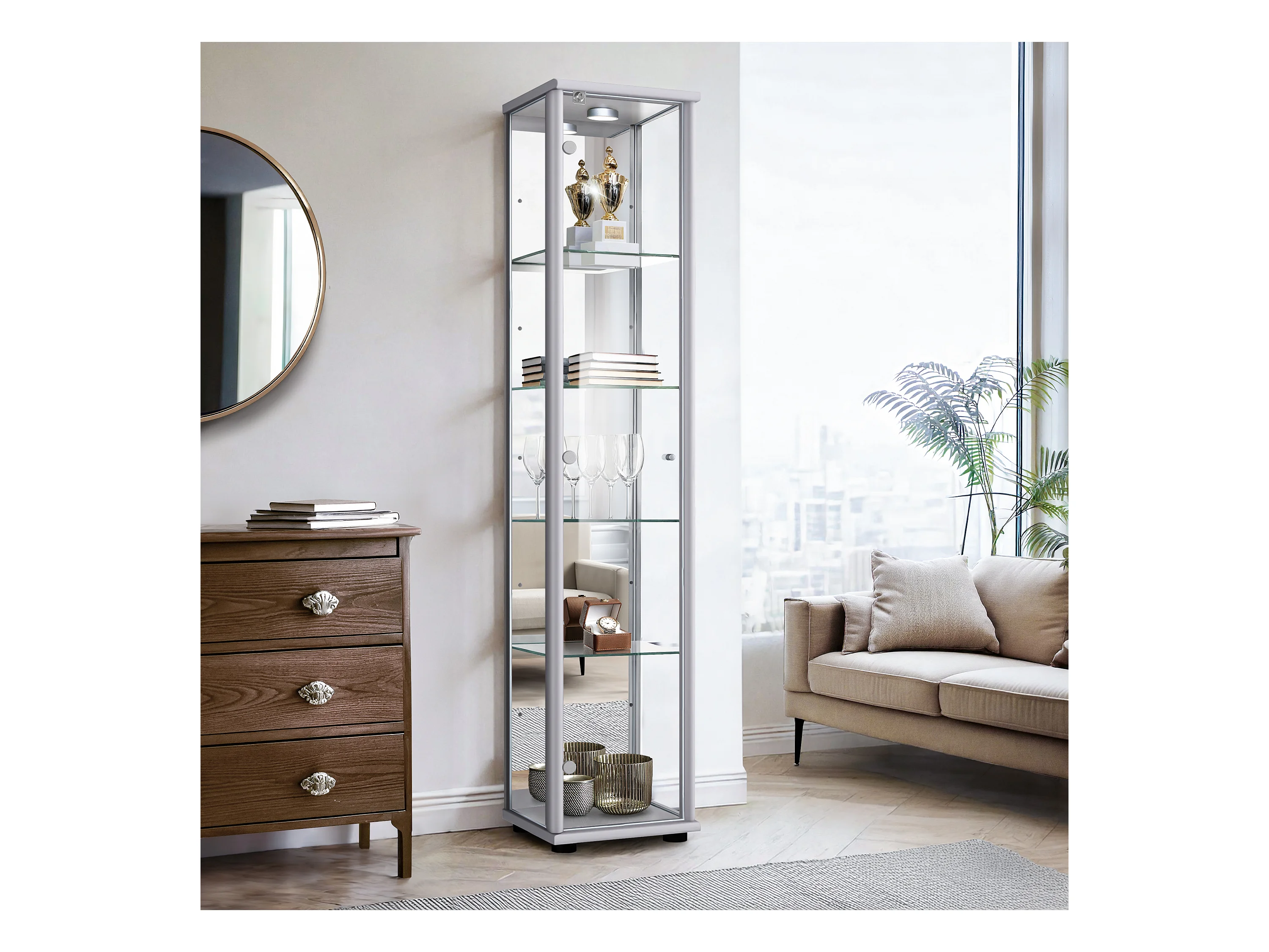 Standvitrine mit 1 Tür, 4 Höhenverstellbaren Glasböden, Spiegel & Schloss - Mit LED-Beleuchtung- 176x37x33 cm - Silberfarben