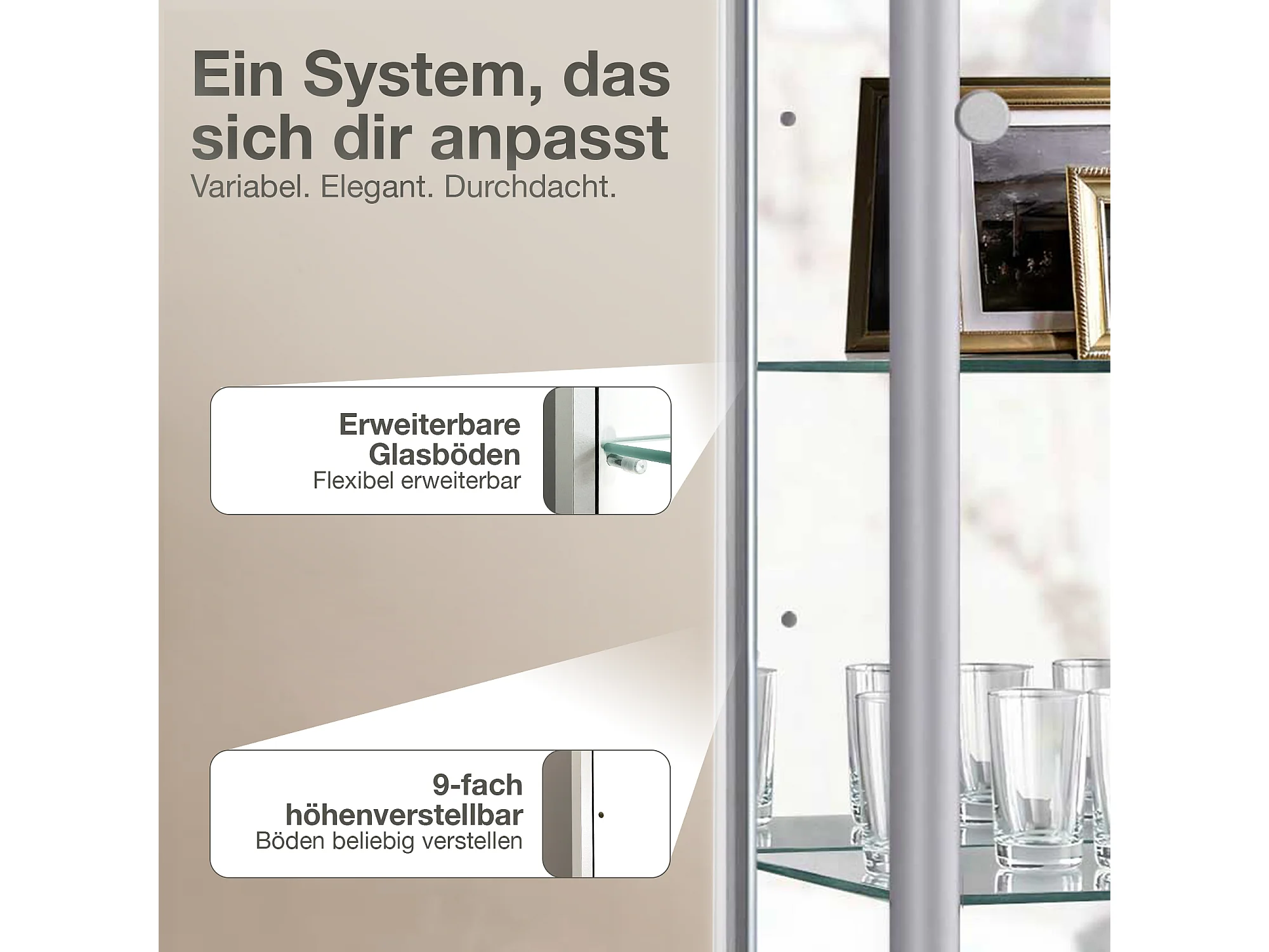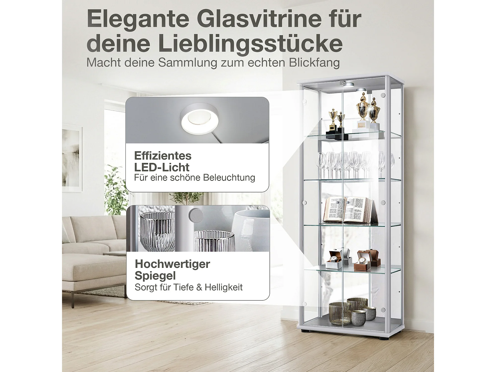 Standvitrine mit 2 Türen, 4 Höhenverstellbaren Glasböden, Spiegel & Schloss - Mit LED-Beleuchtung - 176x67x33 cm - Silberfarben