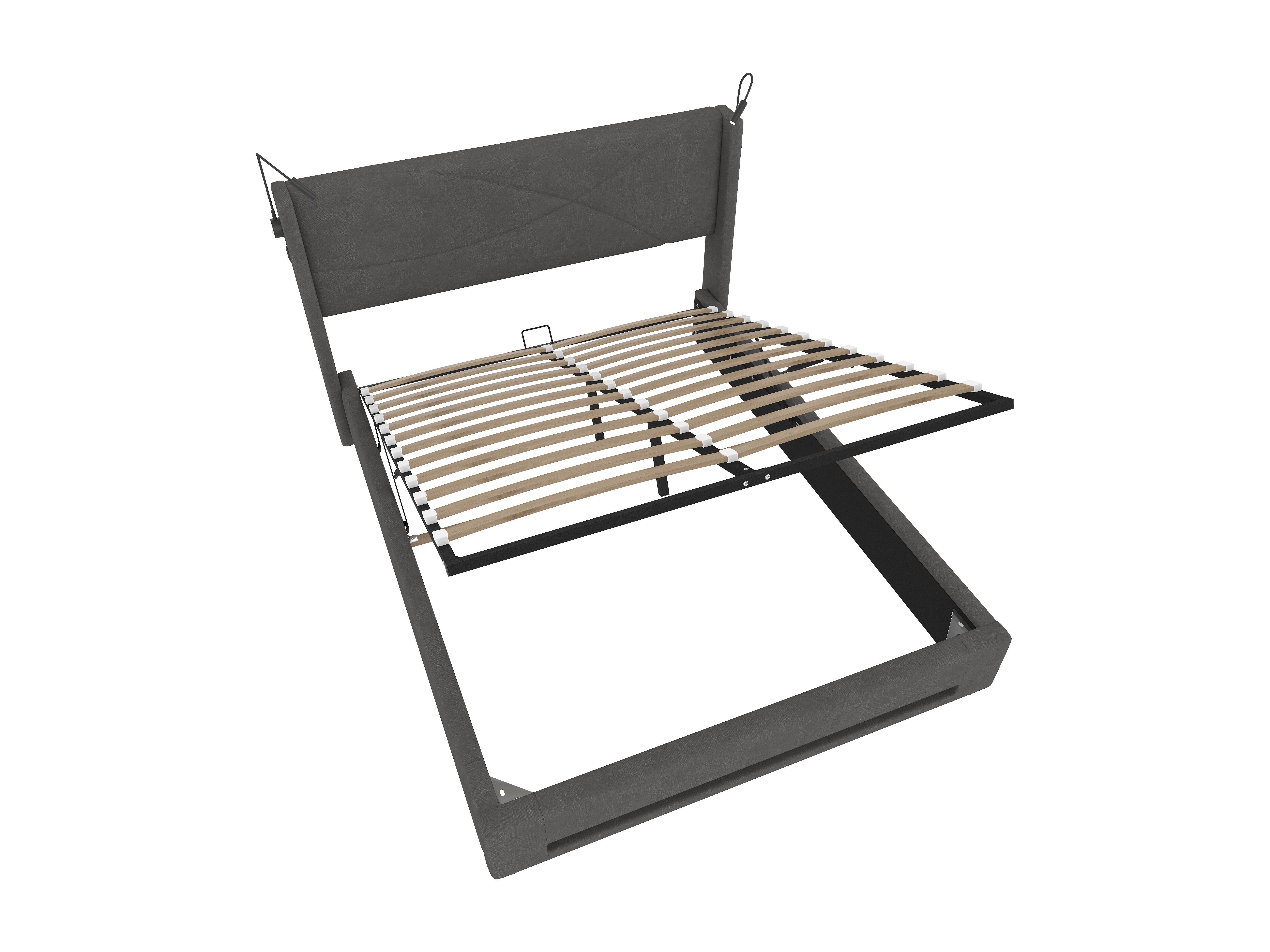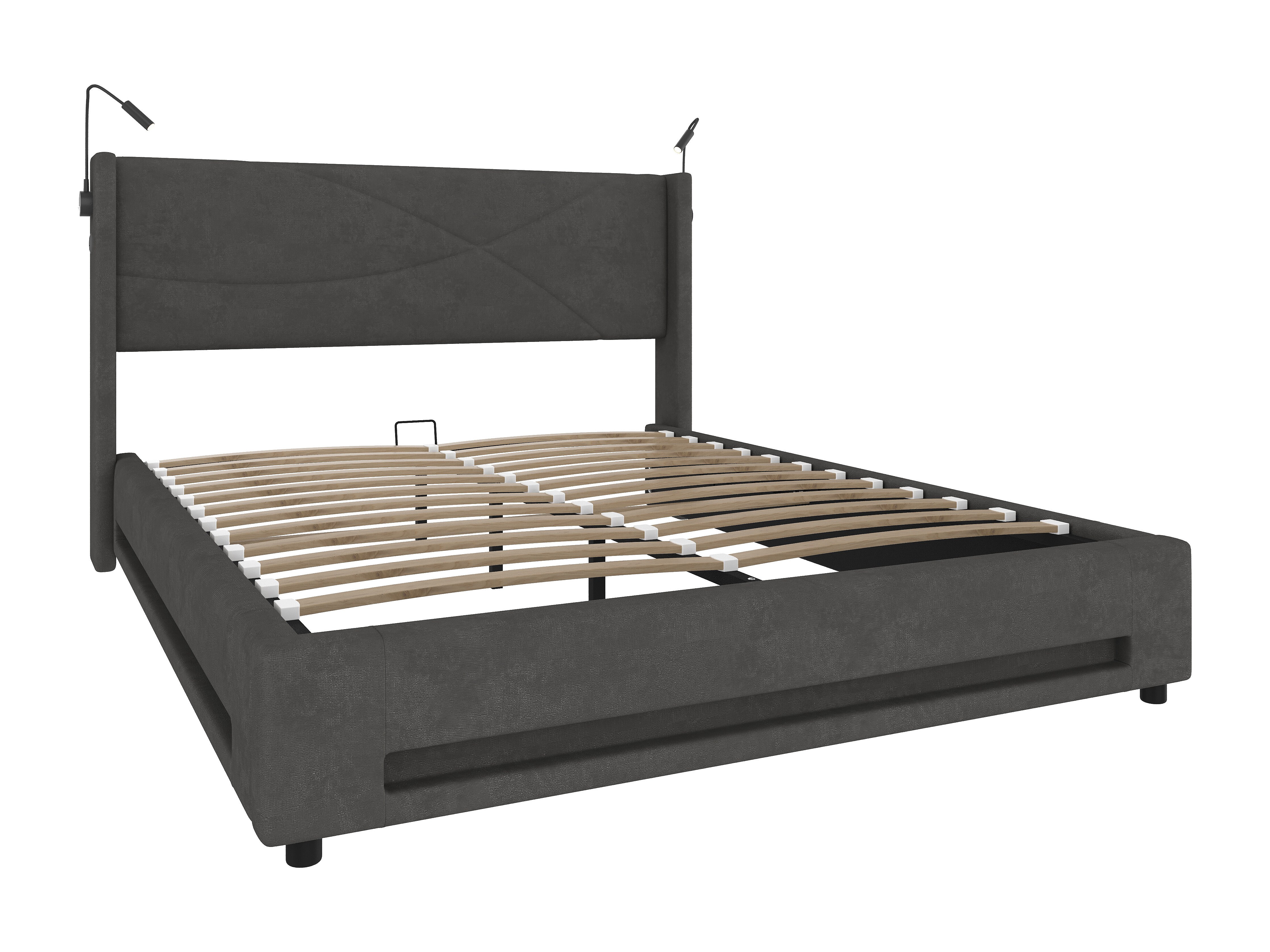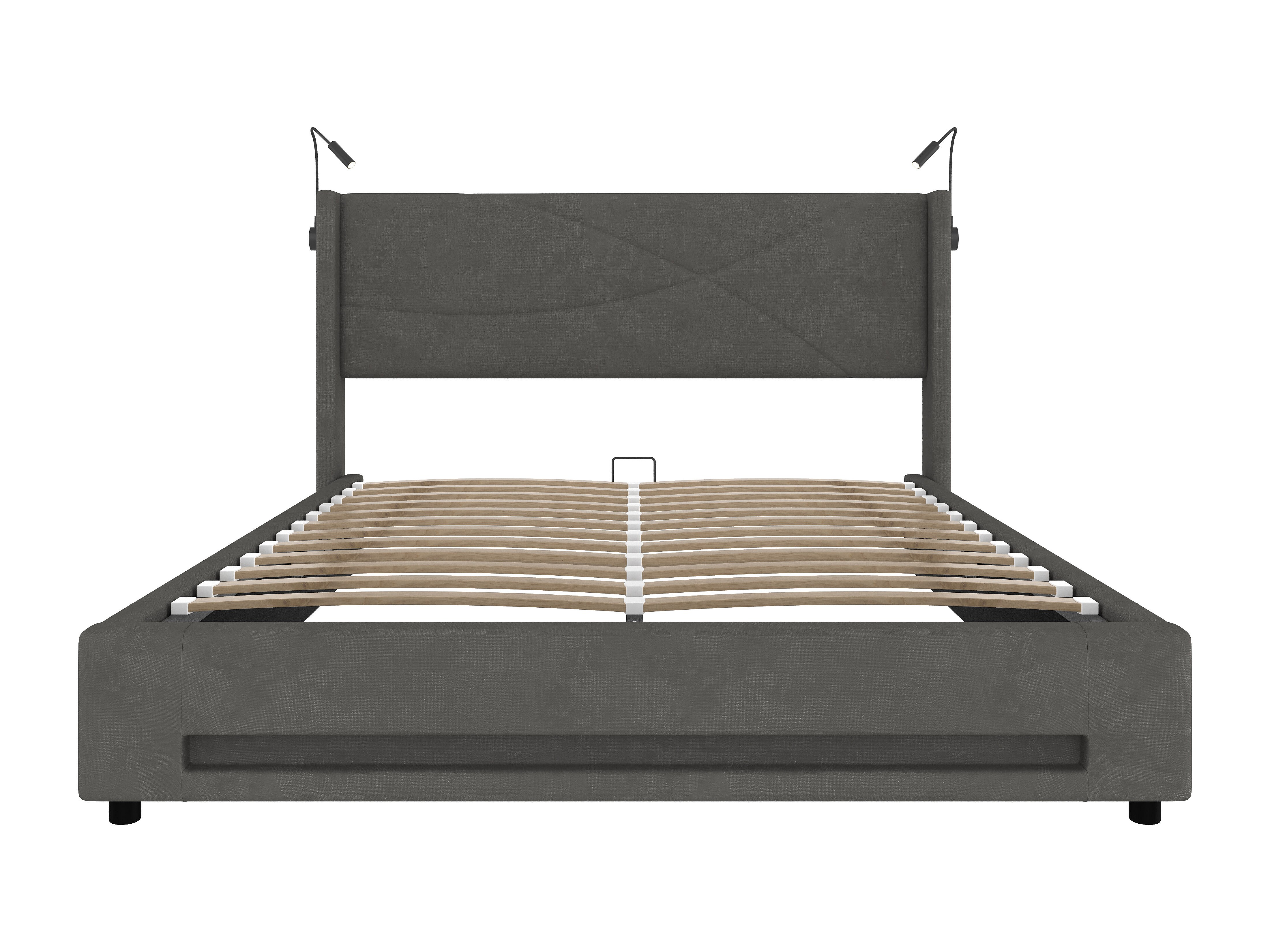 Stauraumbett 160x200 cm mit 2 Leselampen, LEDs und USB-Anschluss – grauer Samt – ohne Matratze