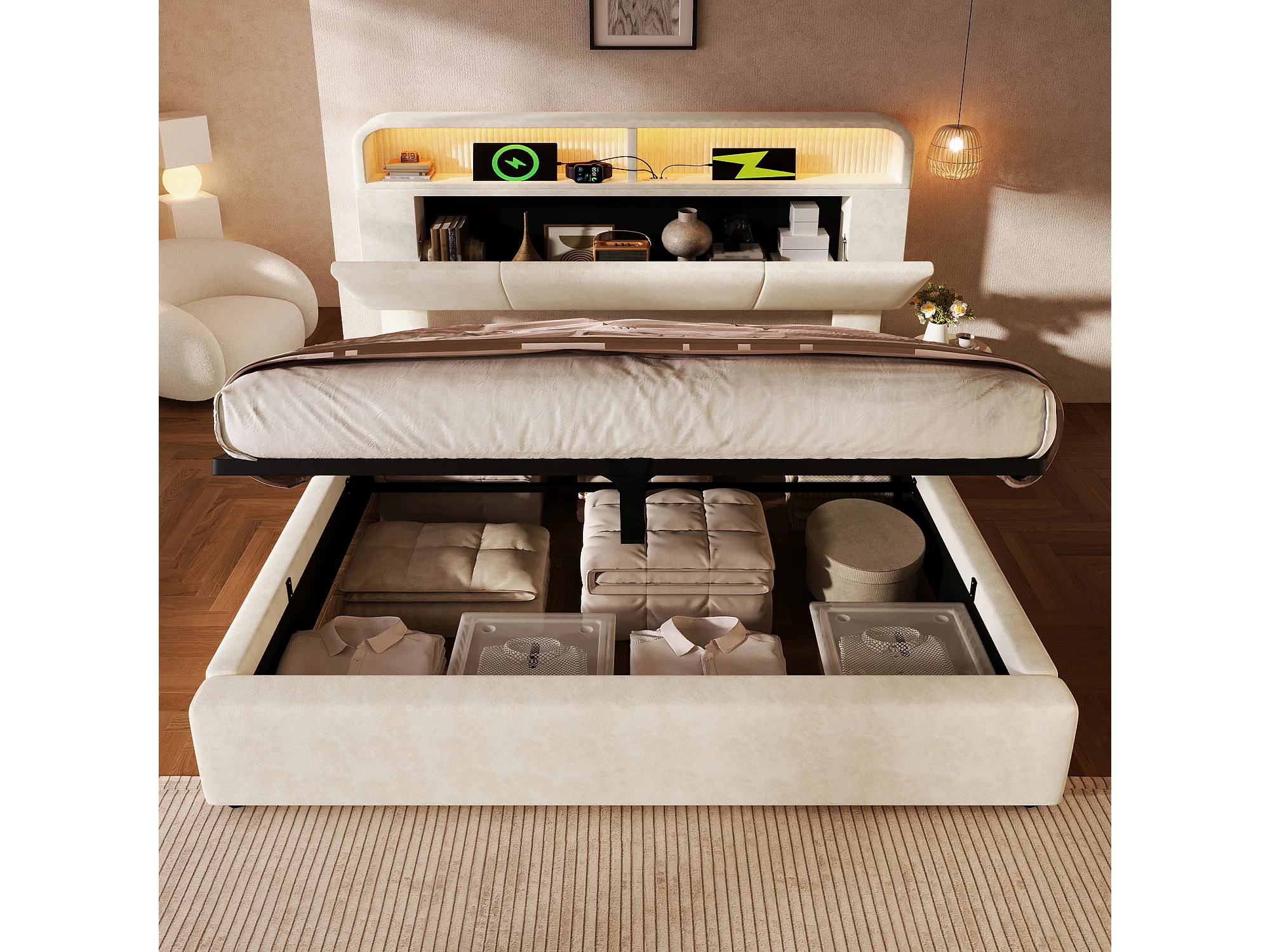 Stauraumbett 180x200 cm, Doppelbett mit verstellbarem Kopfteil, LED und USB – beiger Samt (ohne Matratze)