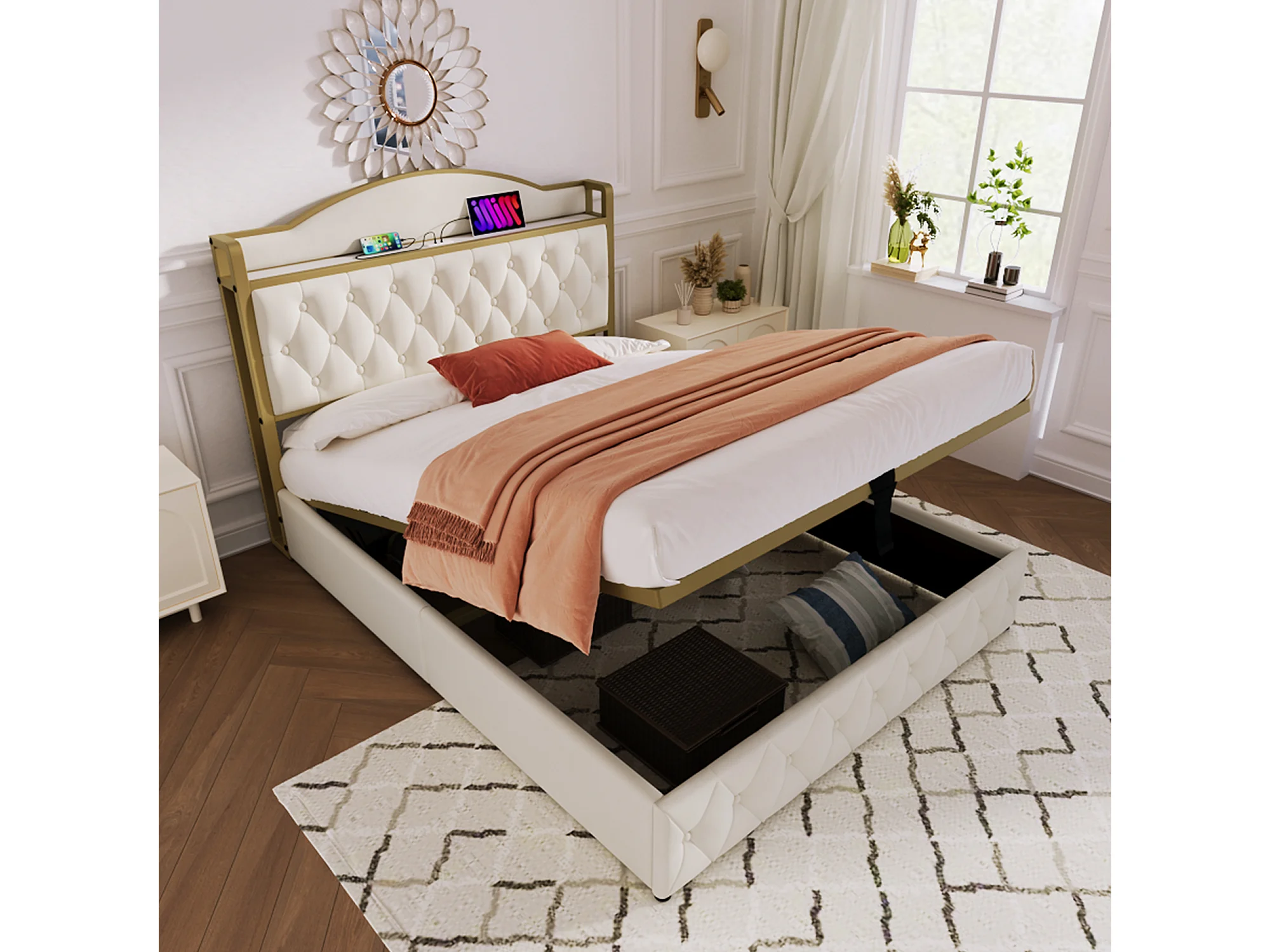 Stauraumbett für Erwachsene 160 x 200 cm – USB + Typ C – Samt + Metall – Hellbeige