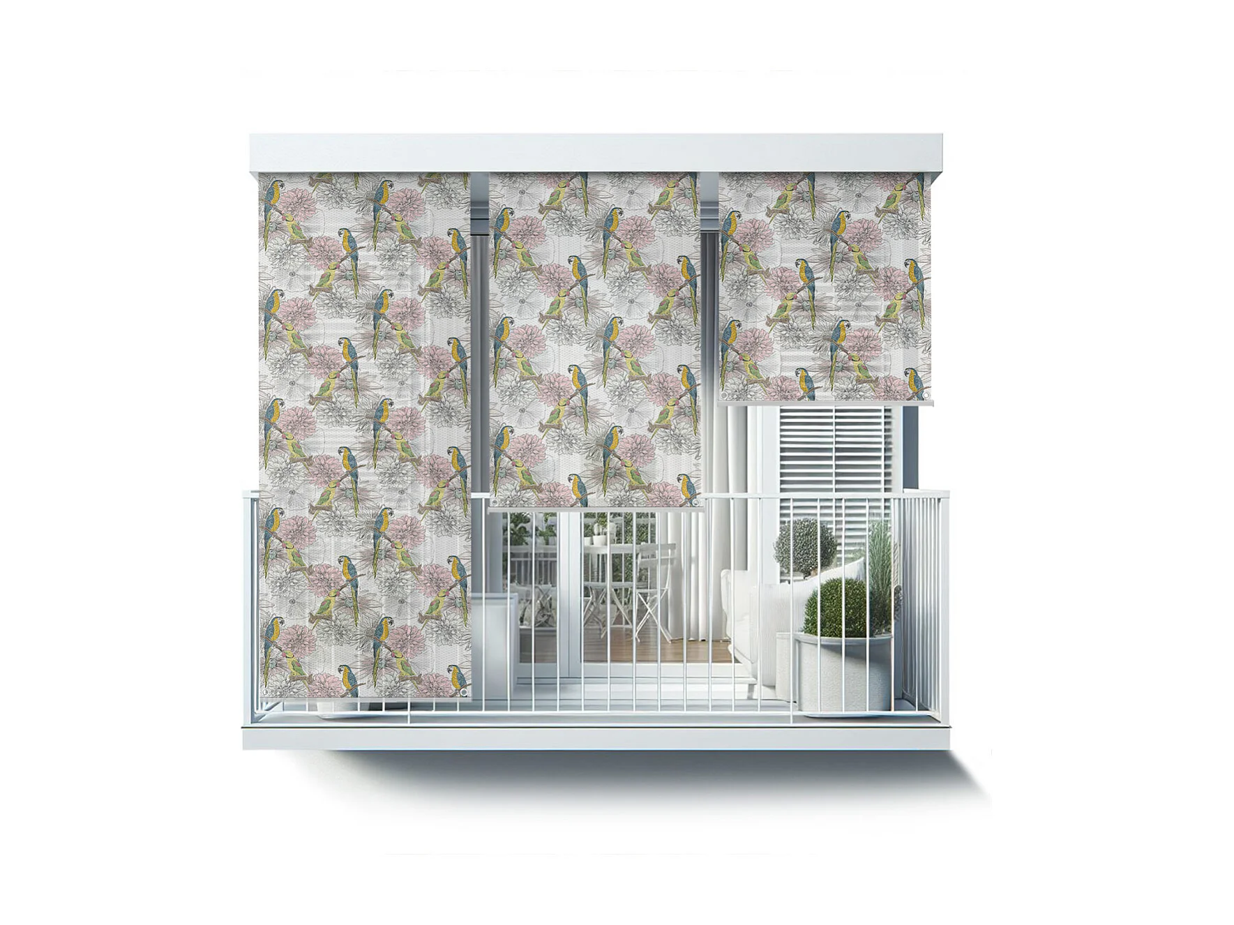 Stilvolles Rollo für den Außenbereich – 150 x 180 cm – Papageien und Blumen. Balkonvorhang, Balkonrollos, Sonnenschutzvorhang