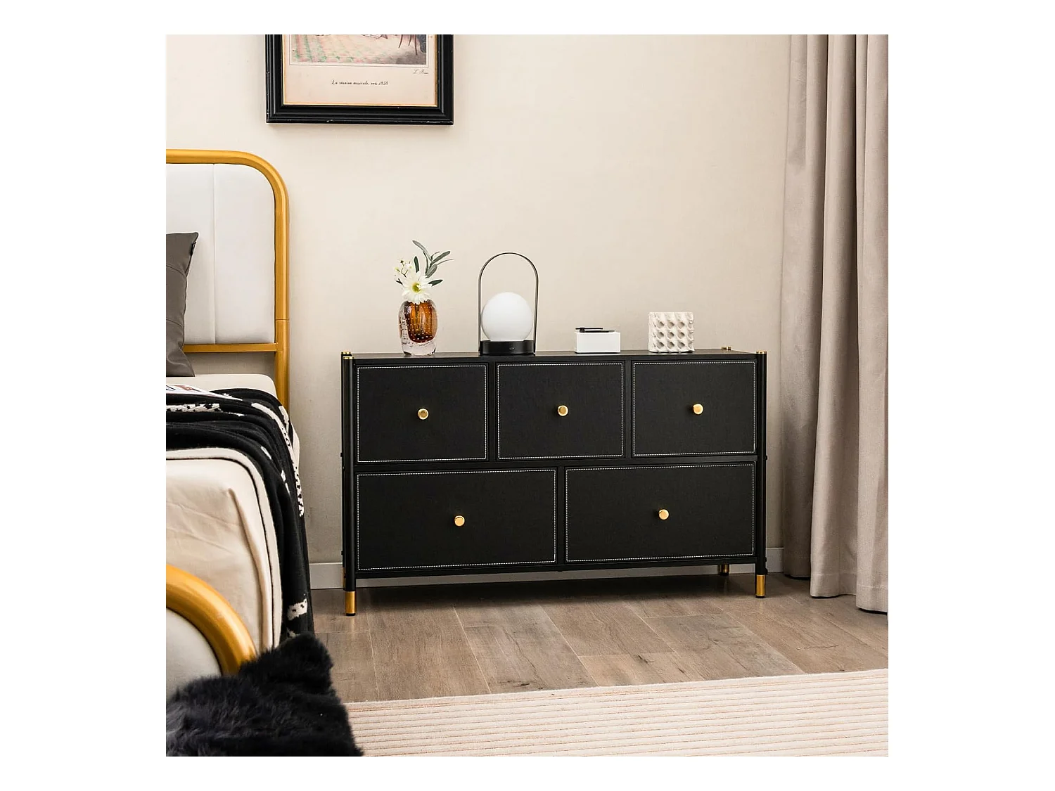 Mit 5 Stoffschubladen bietet diese Kommode eine praktische und vielseitige Aufbewahrungslösung, mit der Sie Ihre Sachen einfach organisieren und darauf zugreifen können. Bei Nichtgebrauch können die Stoffschubladen zur einfachen Aufbewahrung flach zusammengeklappt werden. Dank des Kunstlederlverbeschichteten Metallrahmens müssen Sie sich keine Sorgen um Tragfähigkeit und Zuverlässigkeit machen. Die sorgfältig ausgewählten Materialien, die Kunstleder, MDF-Platte und Vliesstoff kombinieren, machen die Kommode langlebig. Darüber hinaus ist der Aufbewahrungsorganisator mit einer Kippschutzvorrichtung und verstellbaren Fußpolstern für mehr Stabilität und Sicherheit ausgestattet.