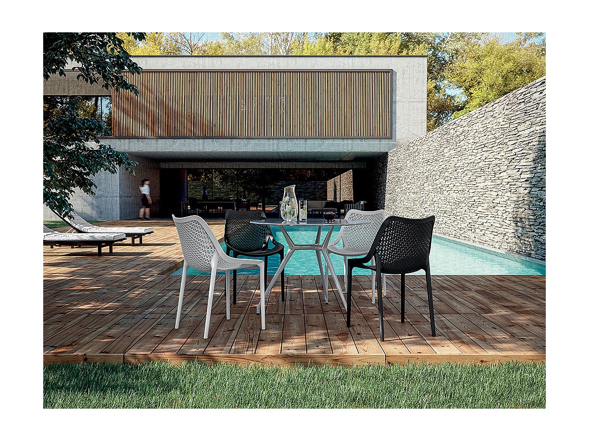 Der Stuhl mit Wabenmuster ist sehr leicht erkennbar dank seines wabenförmigen Designs. Er wird meistens aus Polycarbonat (thermoplastisches Polymer) oder Polypropylen hergestellt. Dieses sehr praktische Modell bietet Ihnen die Möglichkeit, alle Ihre Stühle einfach und platzsparend zu stapeln.