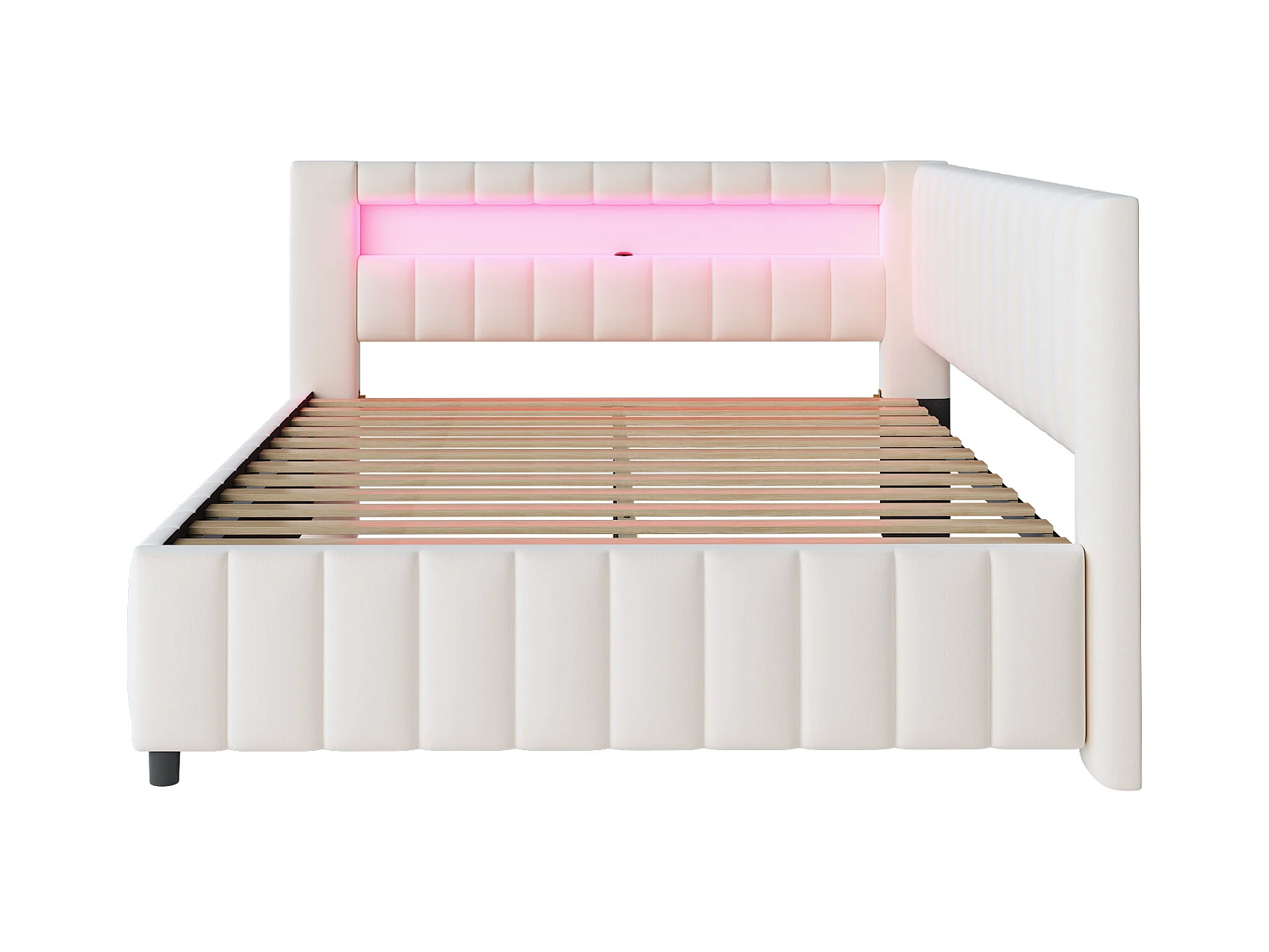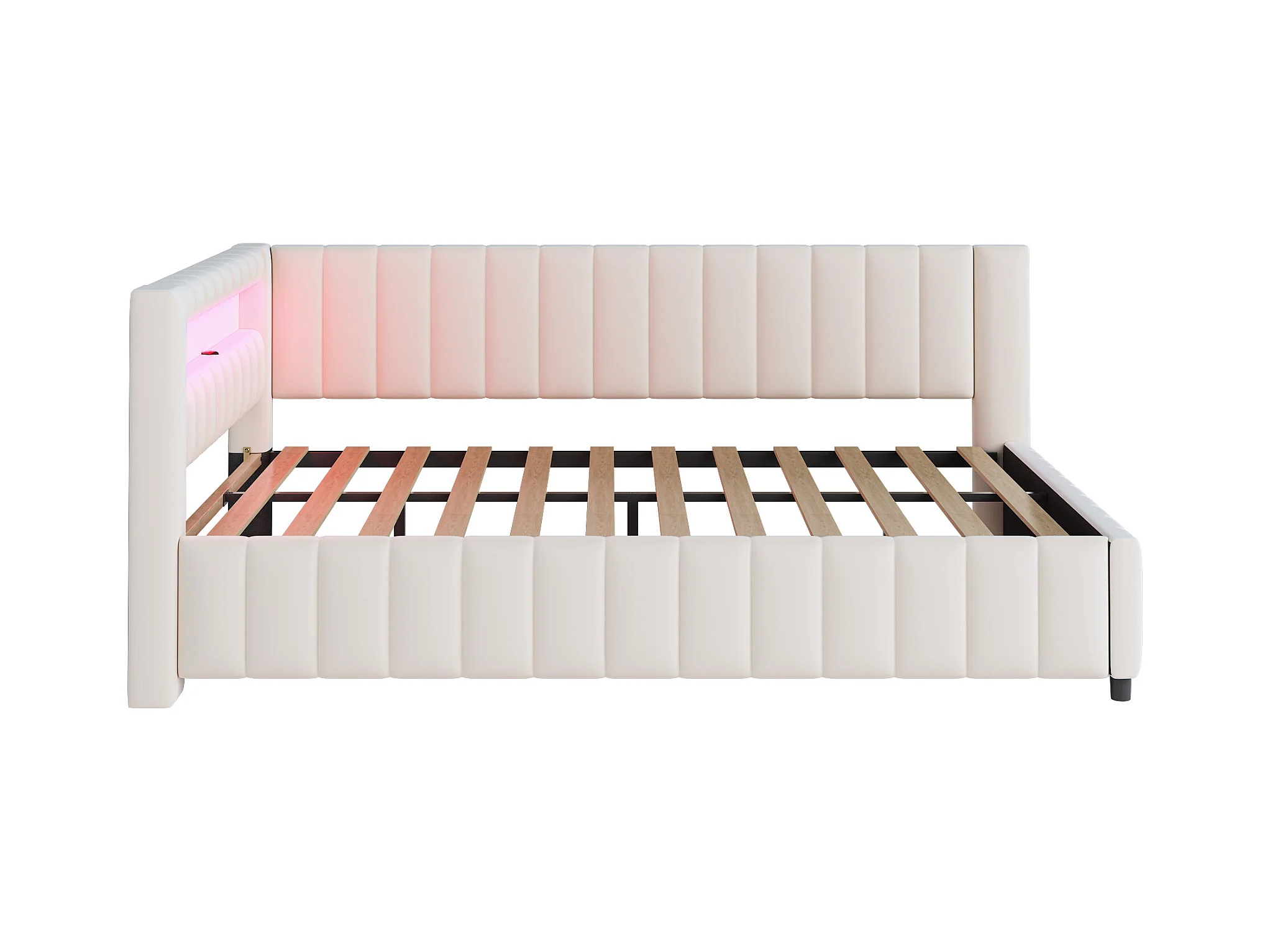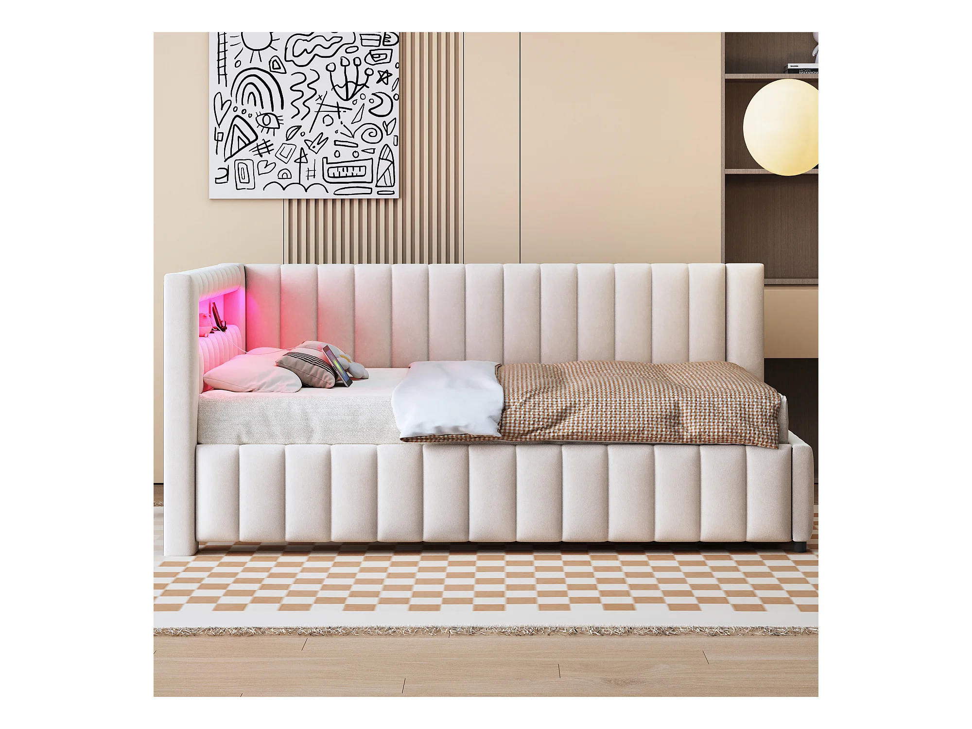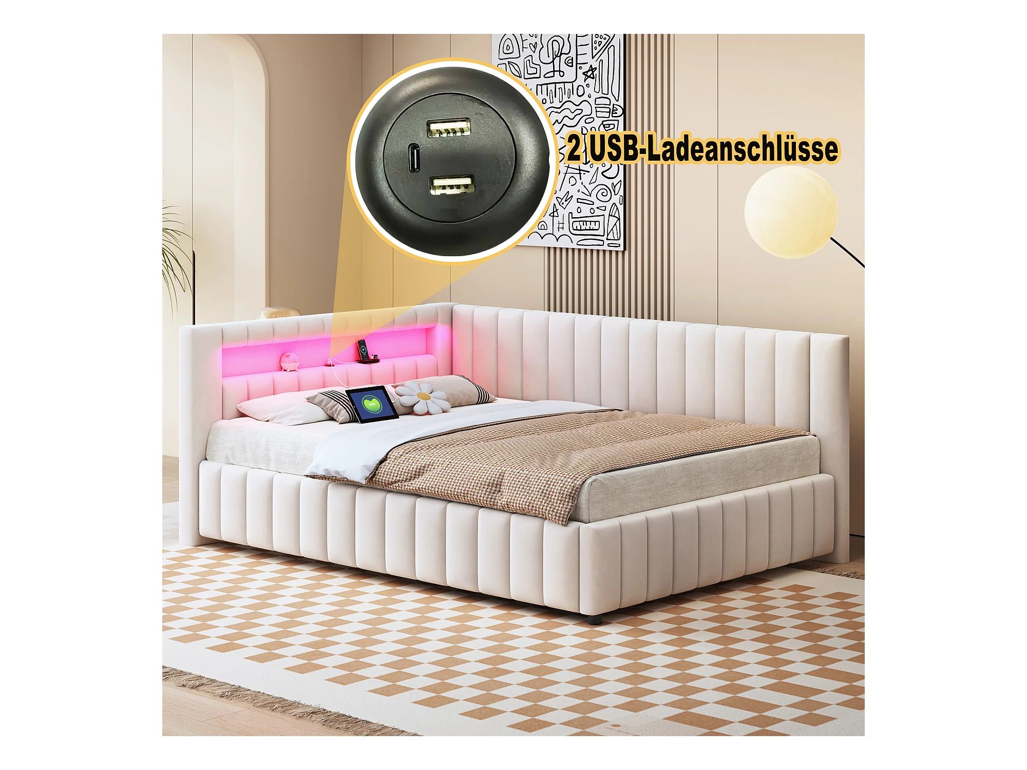 Tagesbett 140 x 200 cm – Beigefarbener Samt – Erwachsenenbett mit LED-Beleuchtung und USB-Ladeanschluss – Ohne Matratze