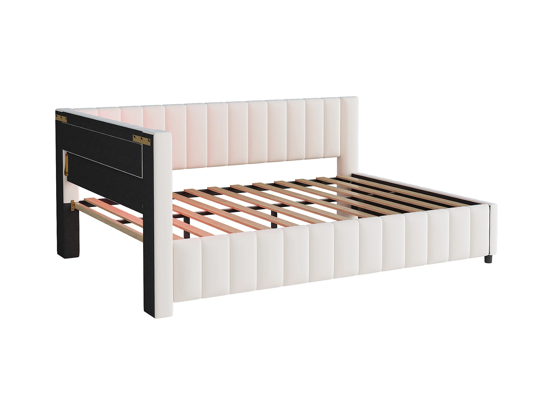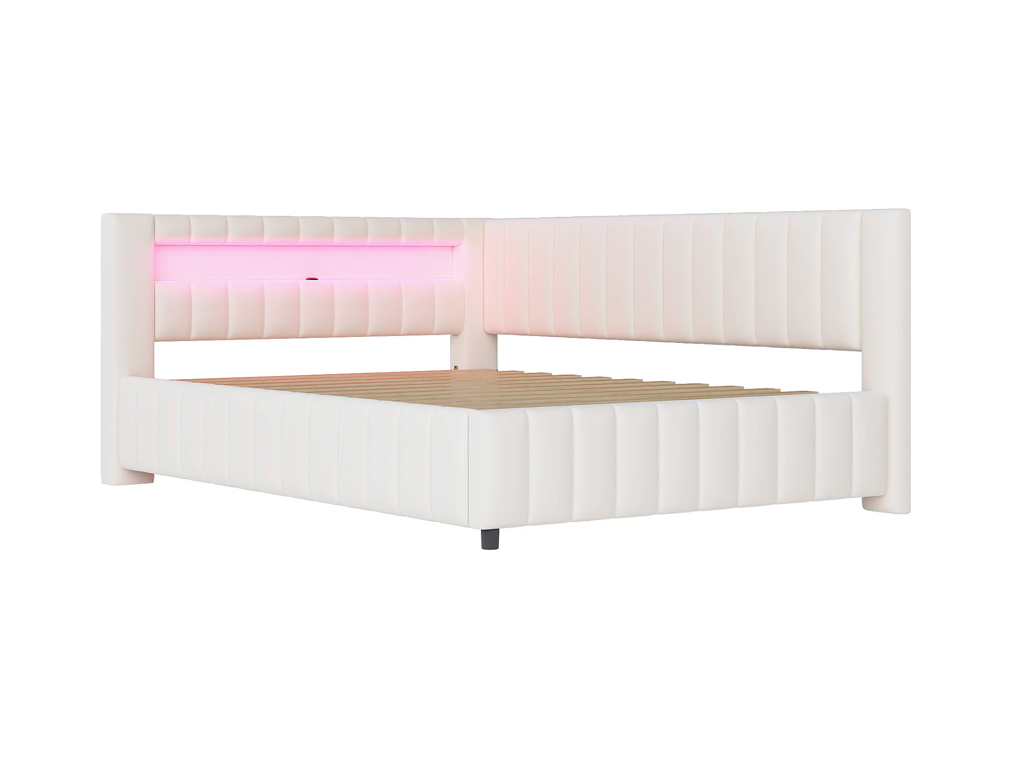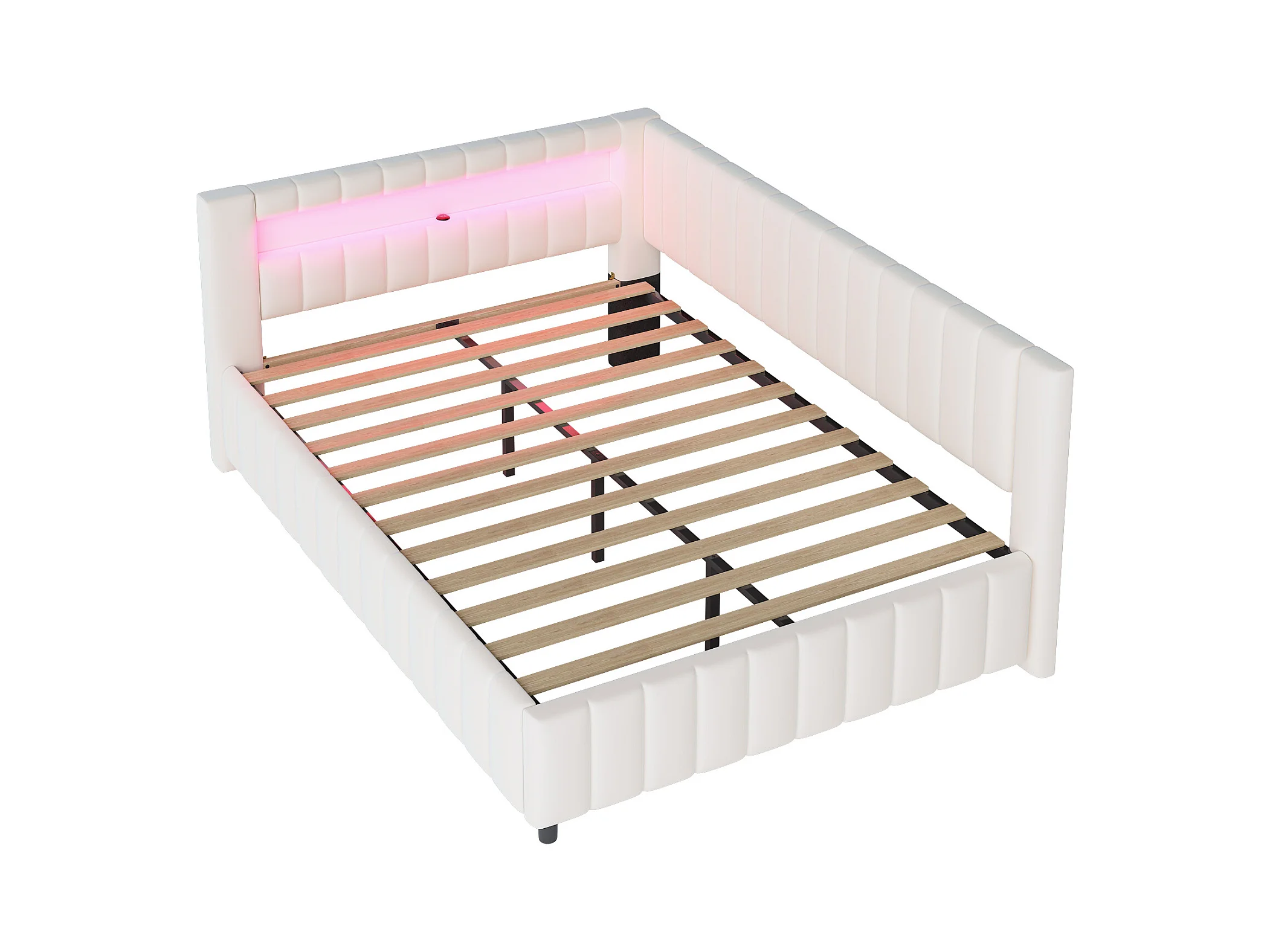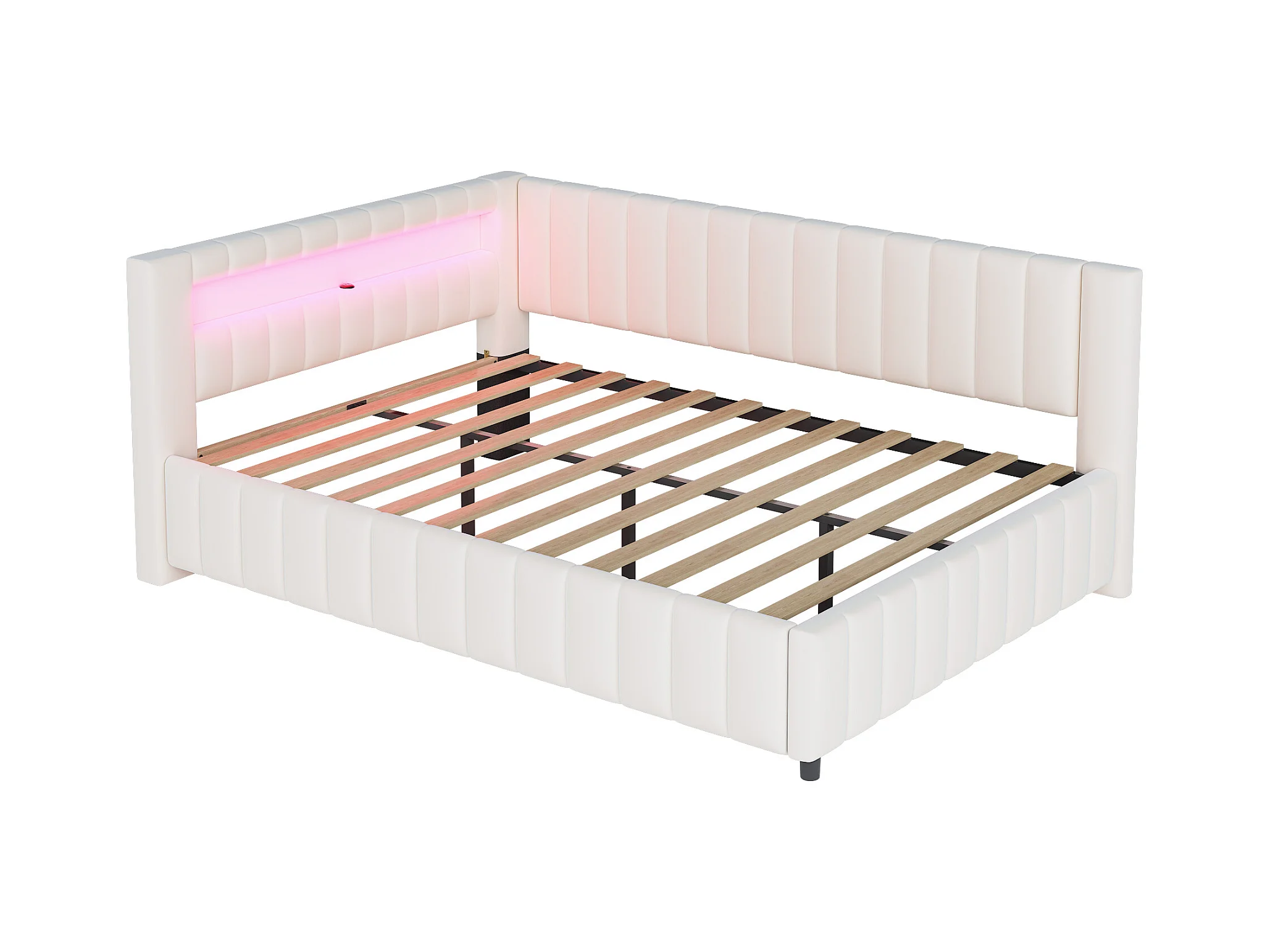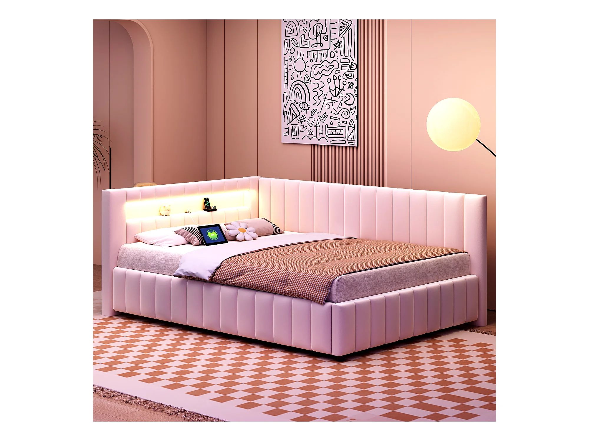 Tagesbett 140 x 200 cm – Beigefarbener Samt – Erwachsenenbett mit LED-Beleuchtung und USB-Ladeanschluss – Ohne Matratze