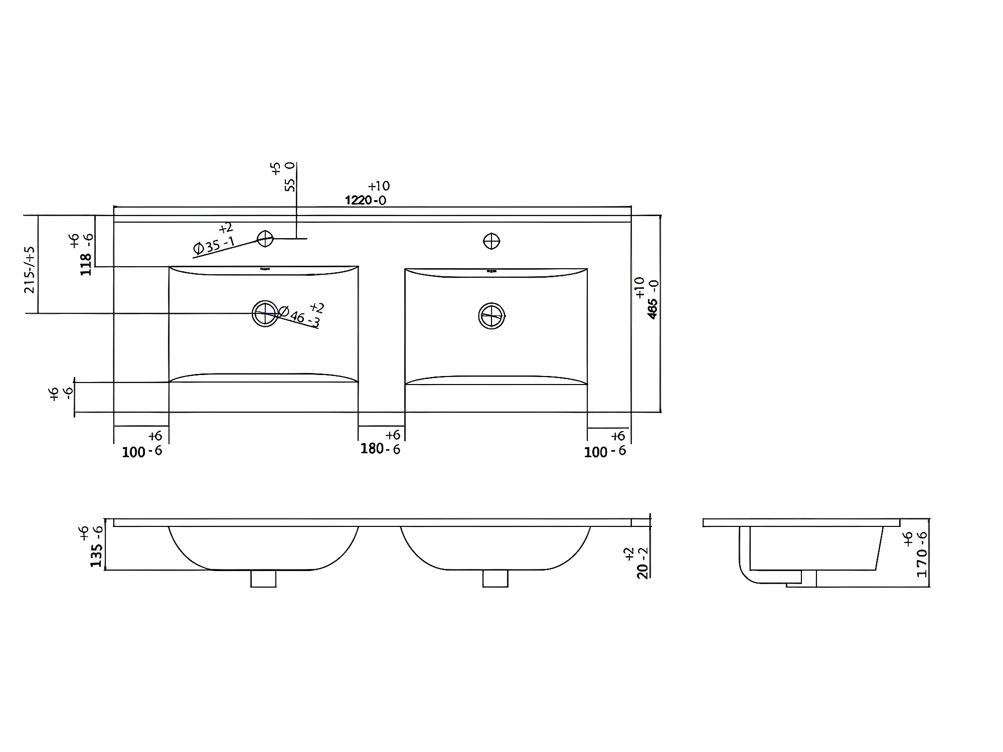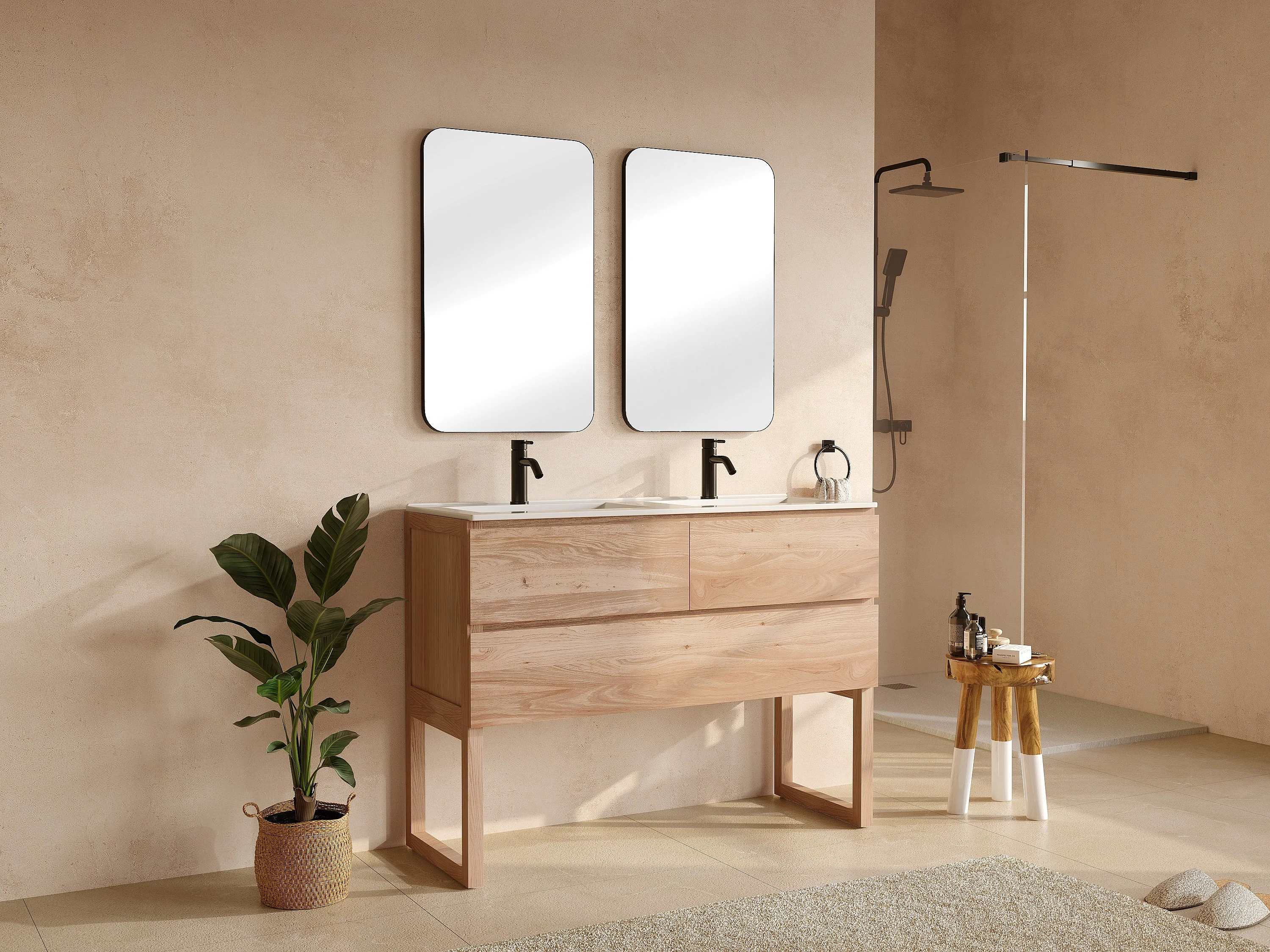 Unterschrank aus Massivholz Eiche mit Doppel-Einbauwaschbecken und Armatur - Hell Natur - 120 cm - TARELO