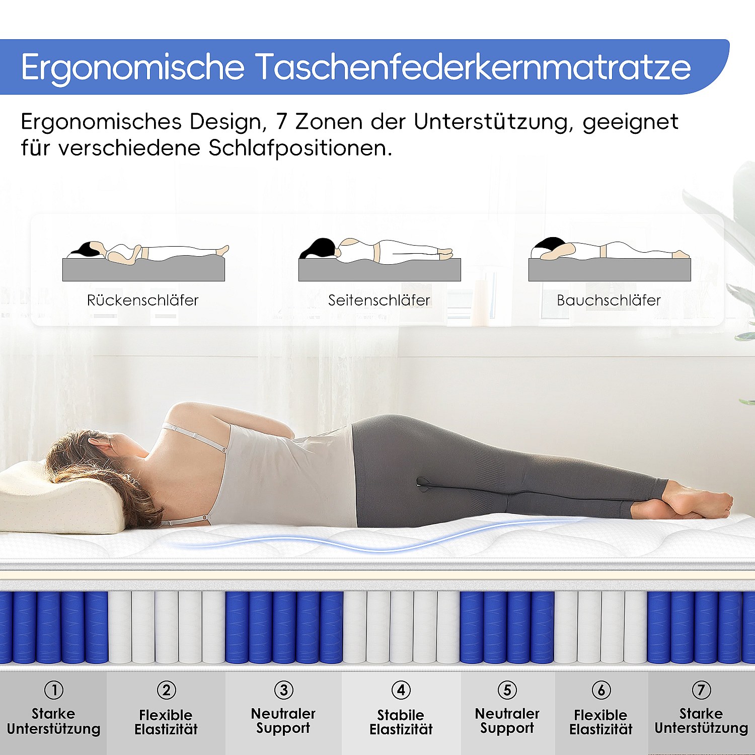 Taschenfederkernmatratze 90 x 200 cm - 7 Zone - Matratzen mit Spannbettlaken - Stärke 28 cm - Härtegrad 3 - Matratze für Kinder und Erwachsene