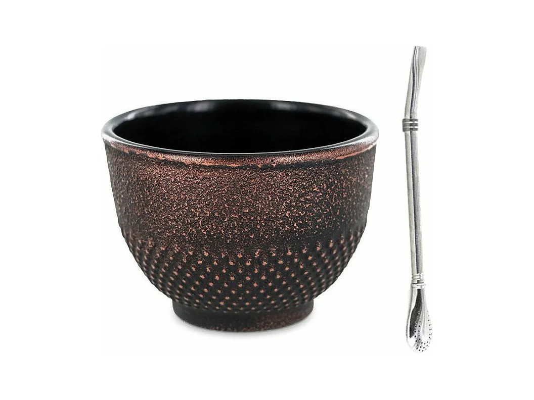 Tasse aus Gusseisen 0,15 L Schwarz & Bronze + Edelstahlstrohhalm mit Filter