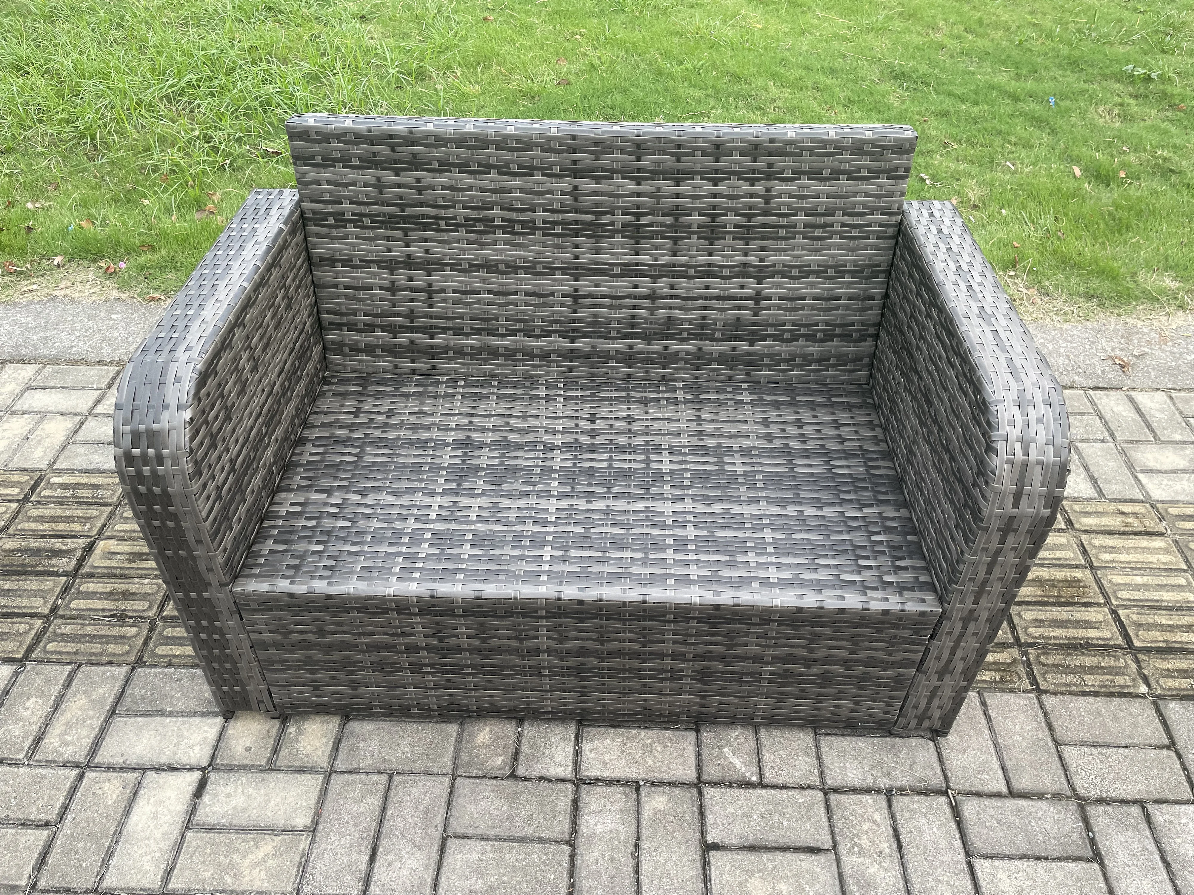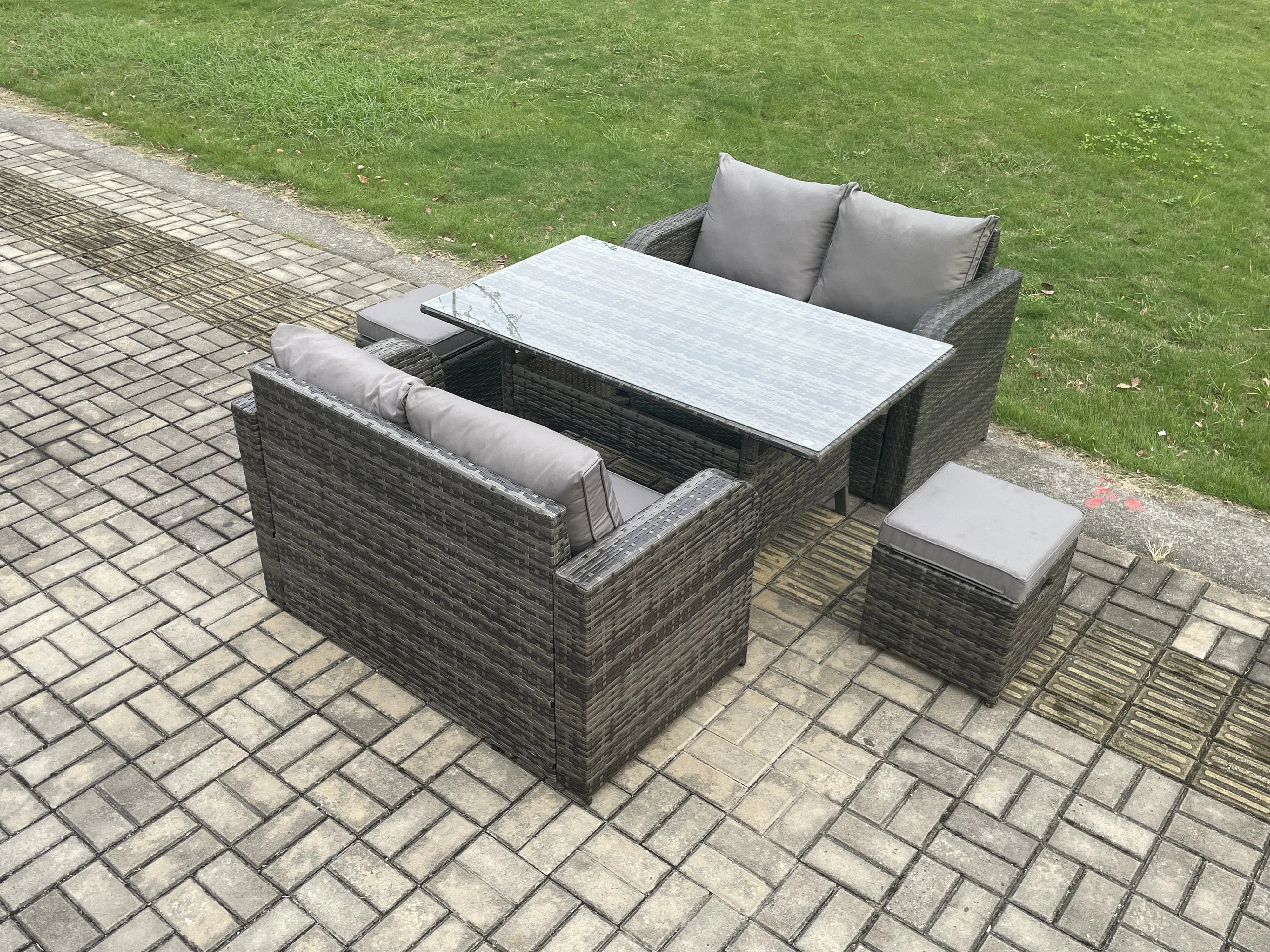 Terrassen Rattan Gartenmöbel-Set mit Langer rechteckiger Esstisch 2 kleine Fußhockern 6 Sitzer Outdoor Loveseat Sofa Set Dunkelgrau gemischt