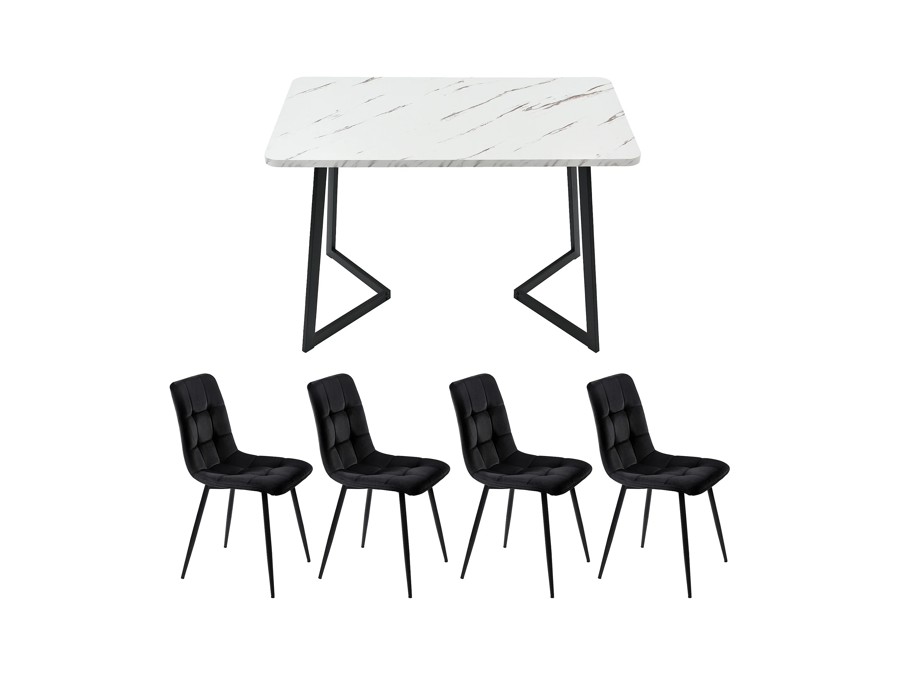 Tischset + 4 Samtstühle – Metallbeine – Schwarz und Weiß