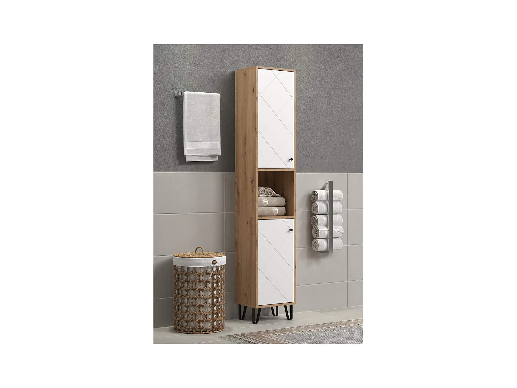 Touch Hochschrank Bad wandhängend Eiche dekor, weiß matt.