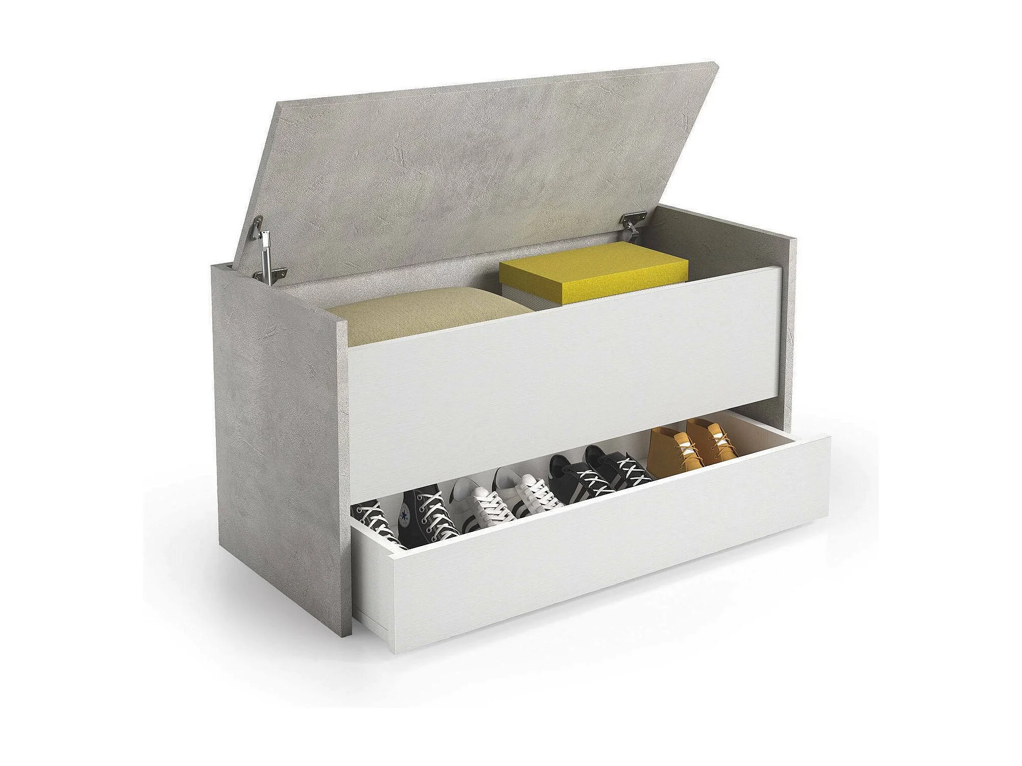 Truhenbank Dgaiard, Moderne Eingangsmöbel mit Schuhregal, Koffertruhe mit zWeißBehältern, 100% Made in Italy, 90x40h46 cm, Weiß und Beton
