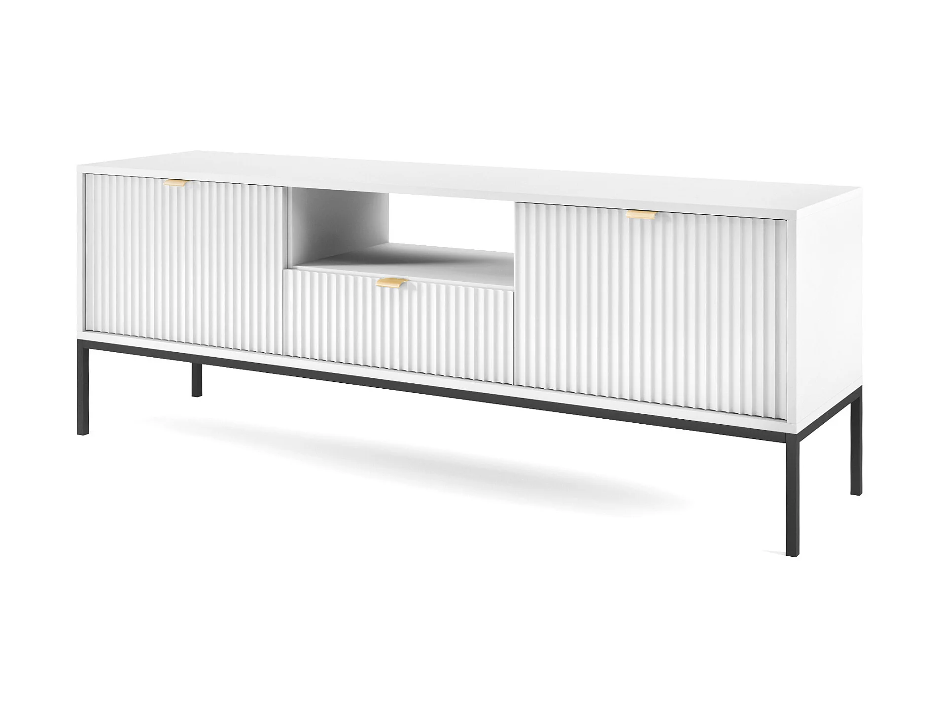 TV-Element Fernsehschrank - 154 cm - Weiß mit geriffelten Fronten und schwarzen Metallbeinen - VELLORE