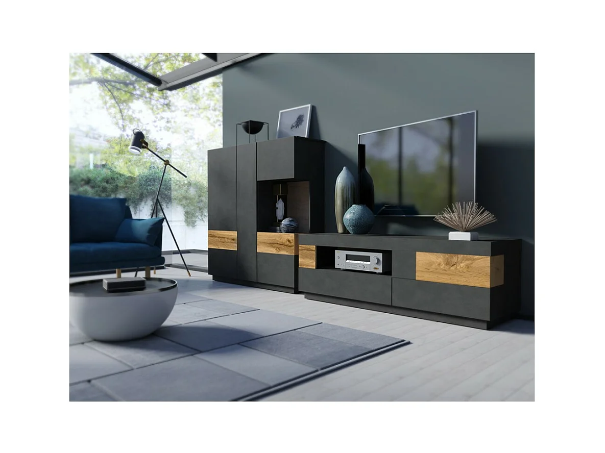 TV-Möbel 160 cm Kollektion KILES. Farbe Anthrazitgrau und Eiche. Designstil.