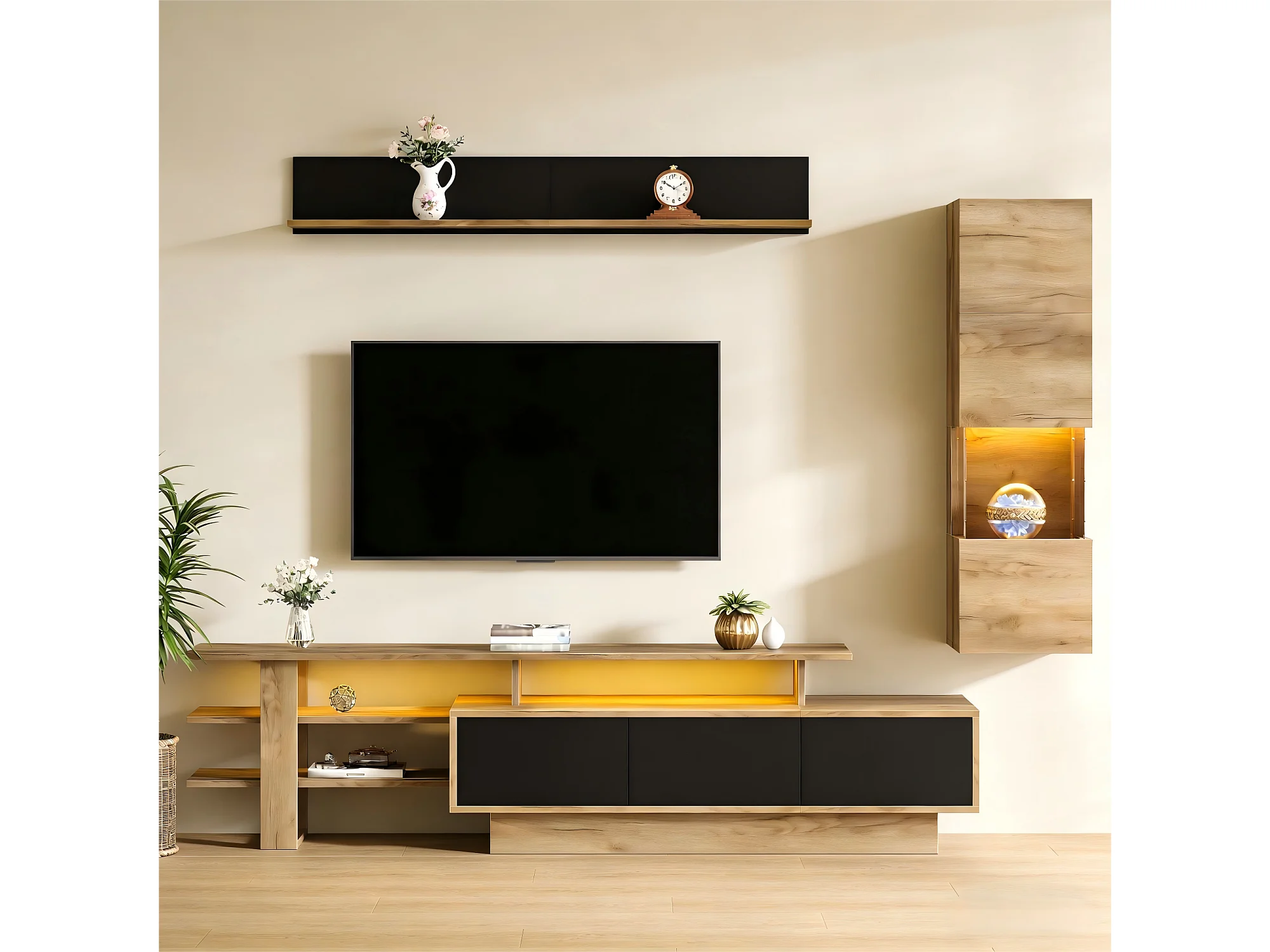 TV-Möbel-Set 3-teilig - 1 TV-Schrank+1 Vitrine+1 Wandregal - mit LED-Beleuchtung - 3 Schubladen und 2 Türen - Natur+Schwarz